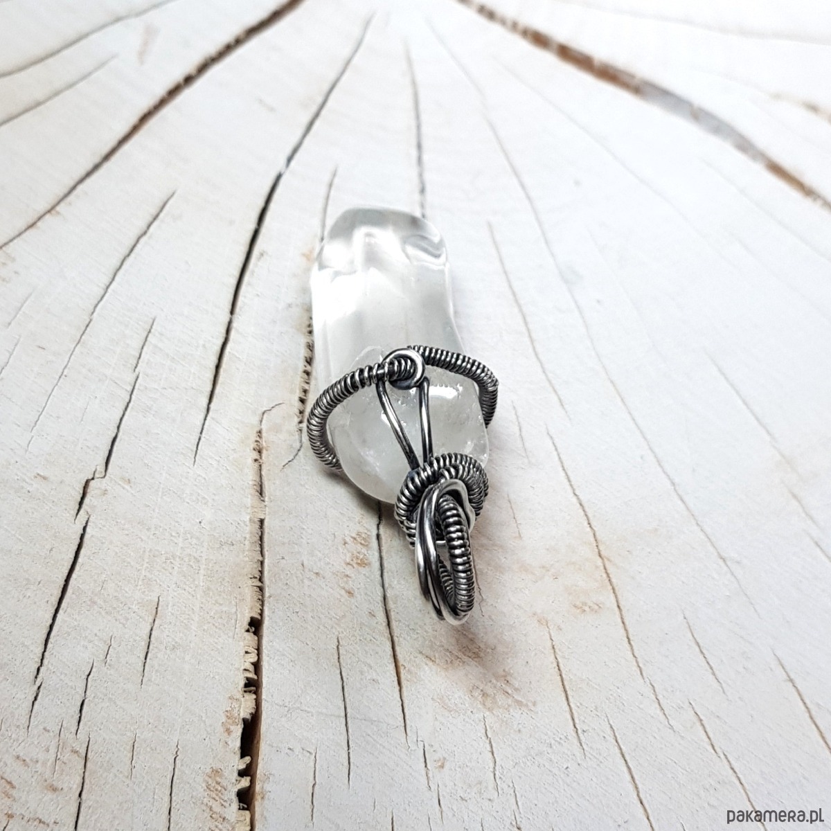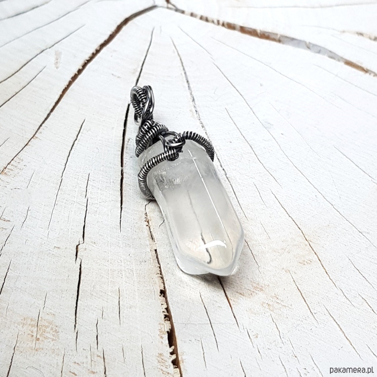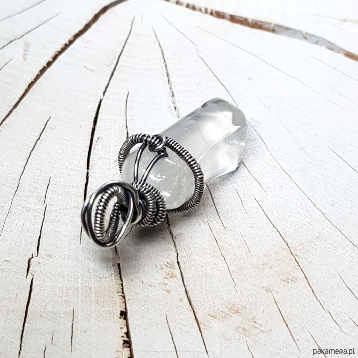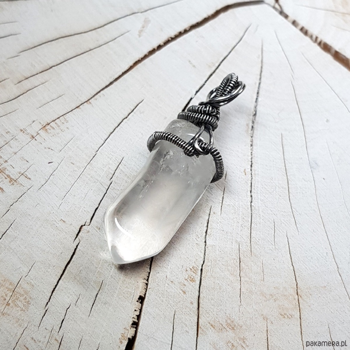 Zawieszka wykonana ręcznie metodą wire-wrappingu z sopla kryształu górskiego. Do wykonania wisiorka użyłam srebrnego drutu najwyższej próby 999, wymiary zawieszki 42x16cm, bez łąńcuszka.