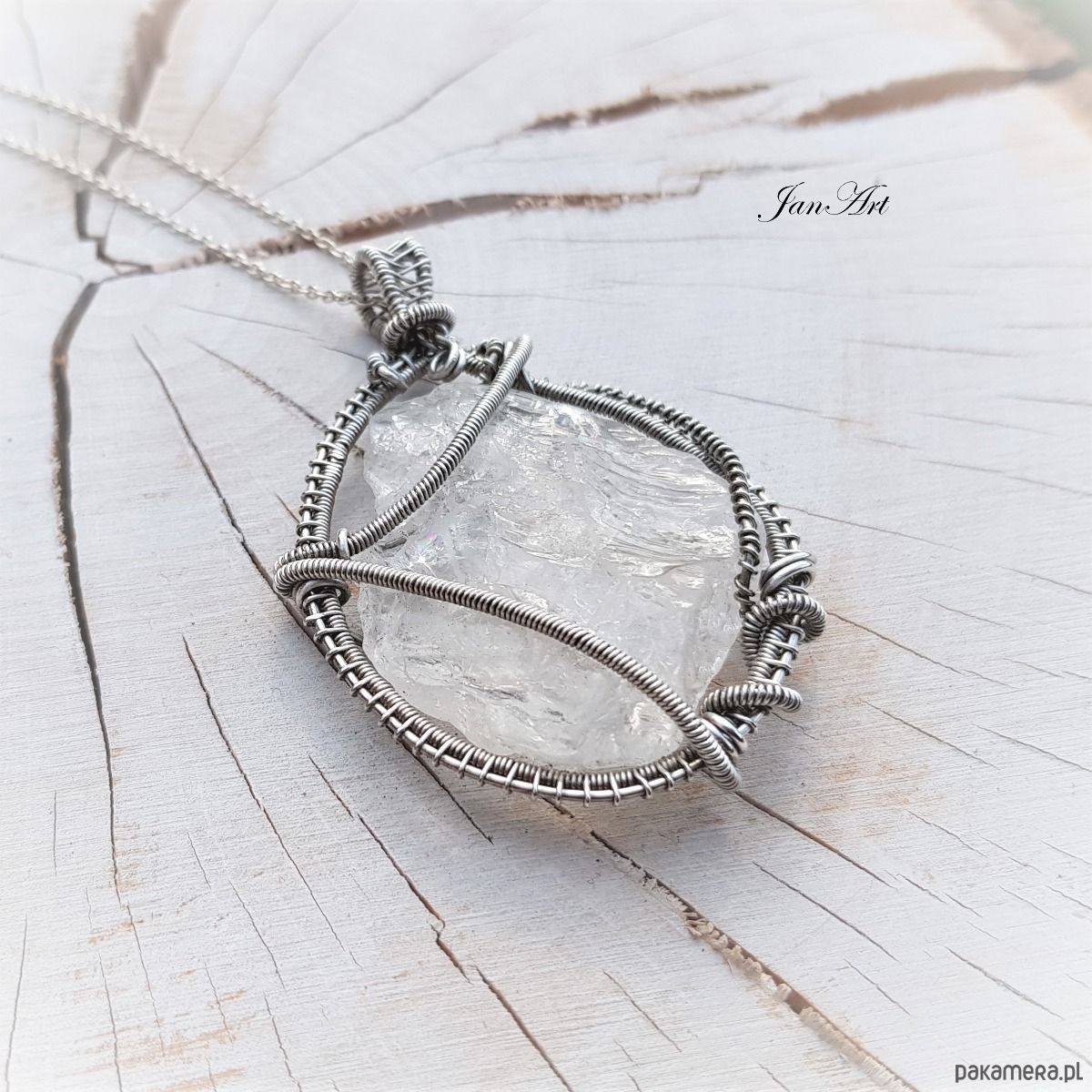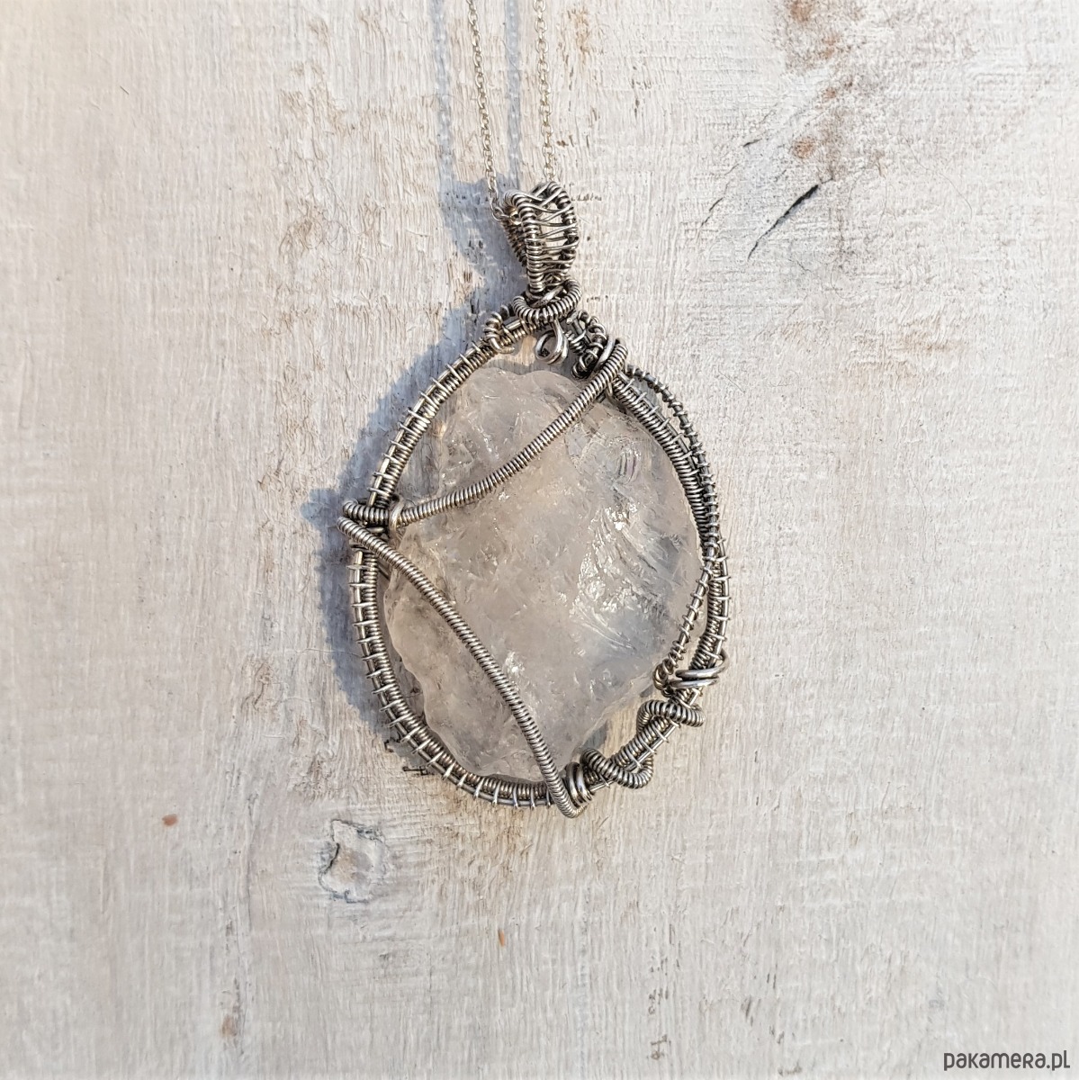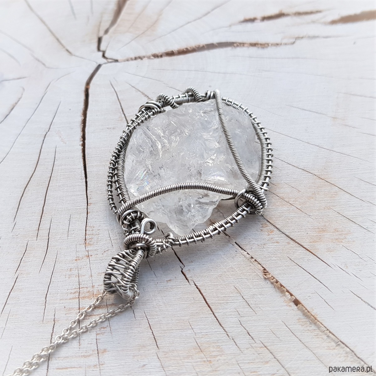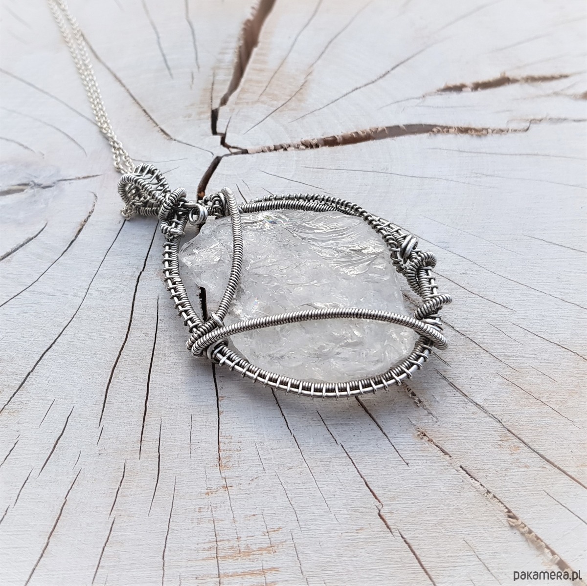 Zawieszka wykonana ręcznie metodą wire-wrappingu z kryształu górskiego w stanie naturalnym, nieciętego i nieszlifowanego pochodzącego z Brazylii. Do wykonania wisiorka użyłam srebrnego drutu najwyższej próby 999, jest pokryty oksydą i wypolerowany. Wymiary zawieszki 63x38mm, z łańcuszkiem długości około 48-50 cm.