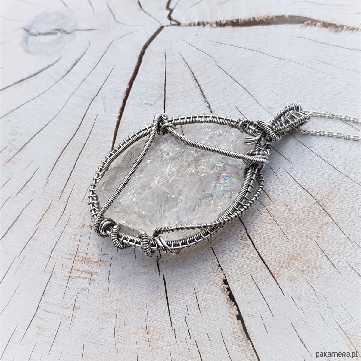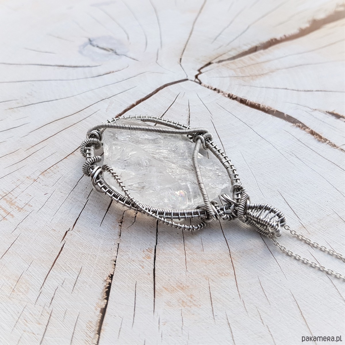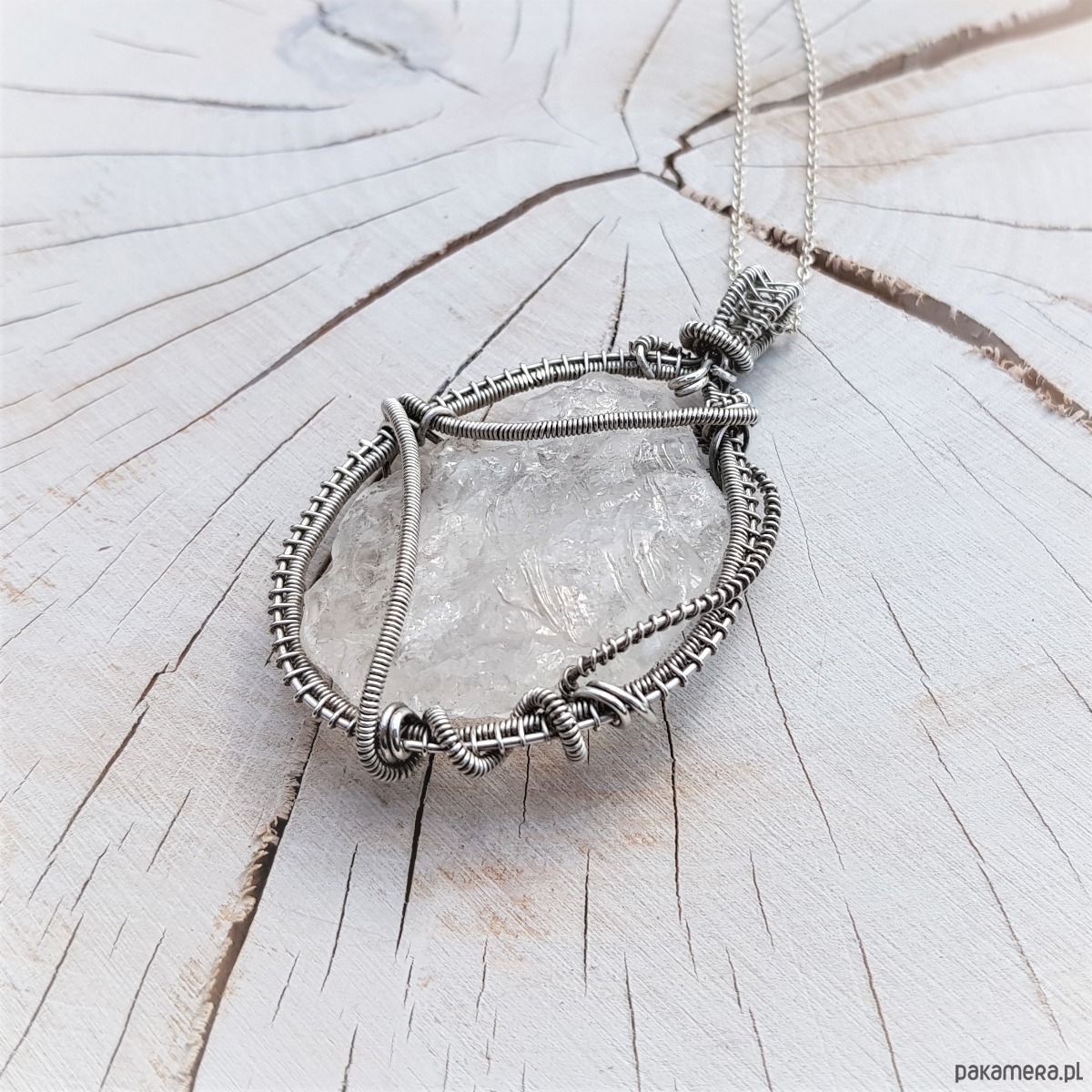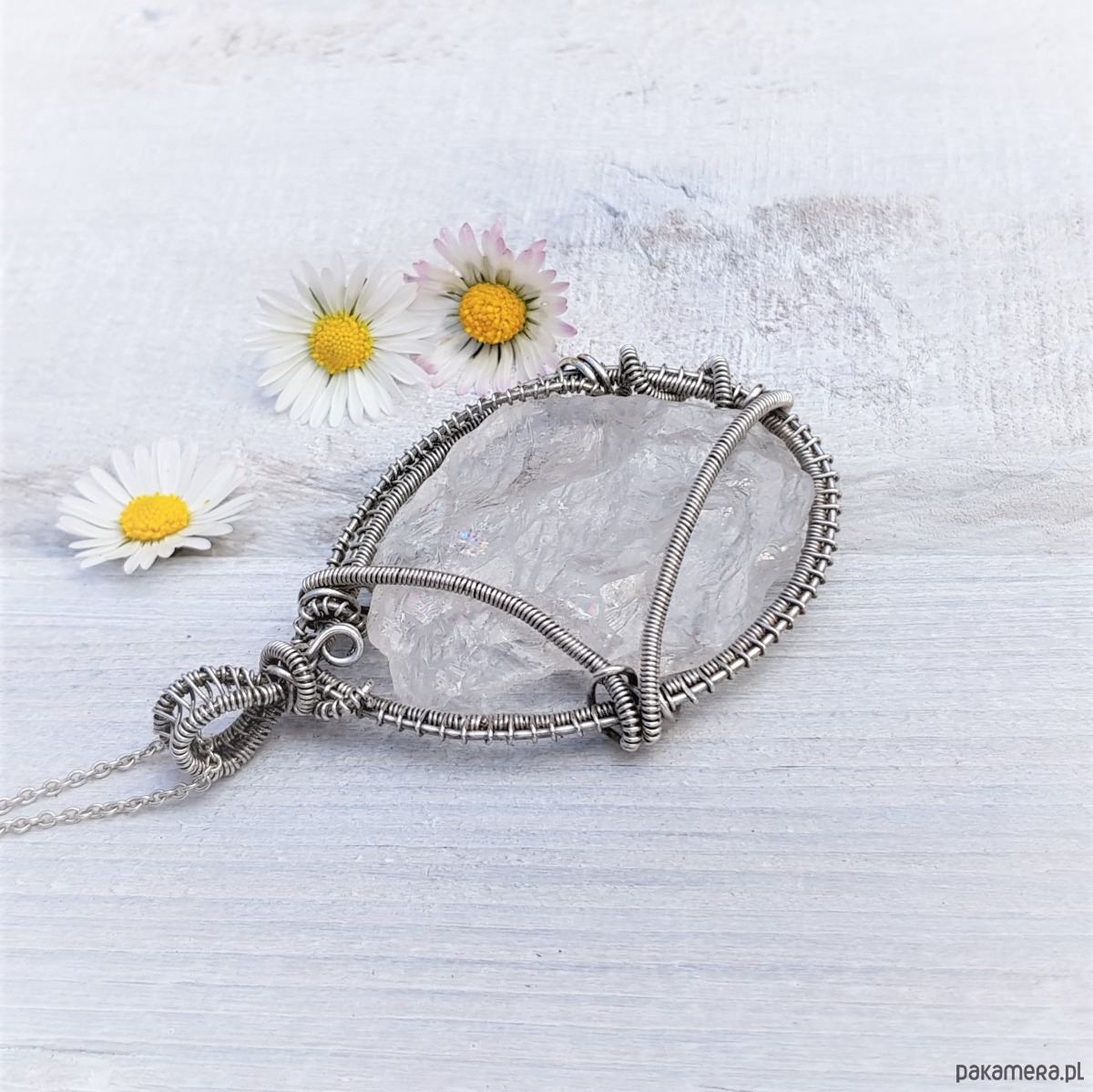 Zawieszka wykonana ręcznie metodą wire-wrappingu z kryształu górskiego w stanie naturalnym, nieciętego i nieszlifowanego pochodzącego z Brazylii. Do wykonania wisiorka użyłam srebrnego drutu najwyższej próby 999, jest pokryty oksydą i wypolerowany. Wymiary zawieszki 63x38mm, z łańcuszkiem długości około 48-50 cm.