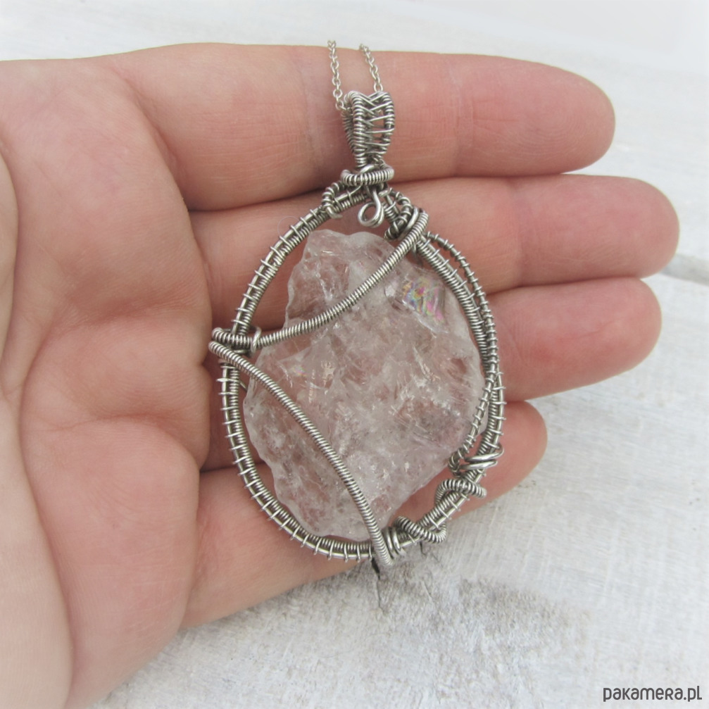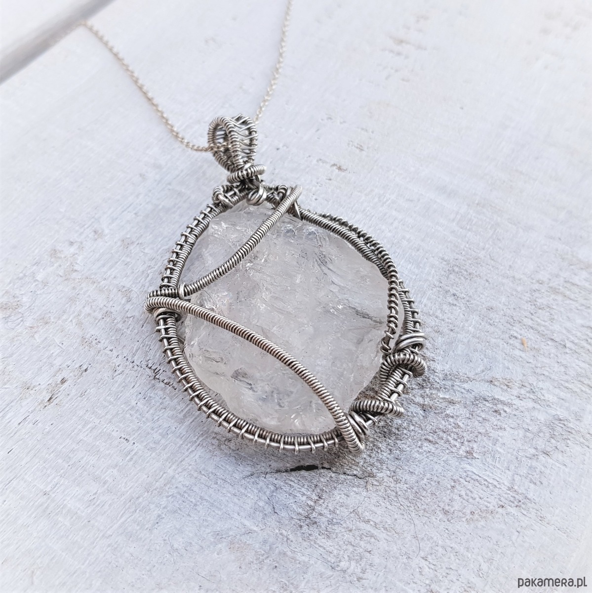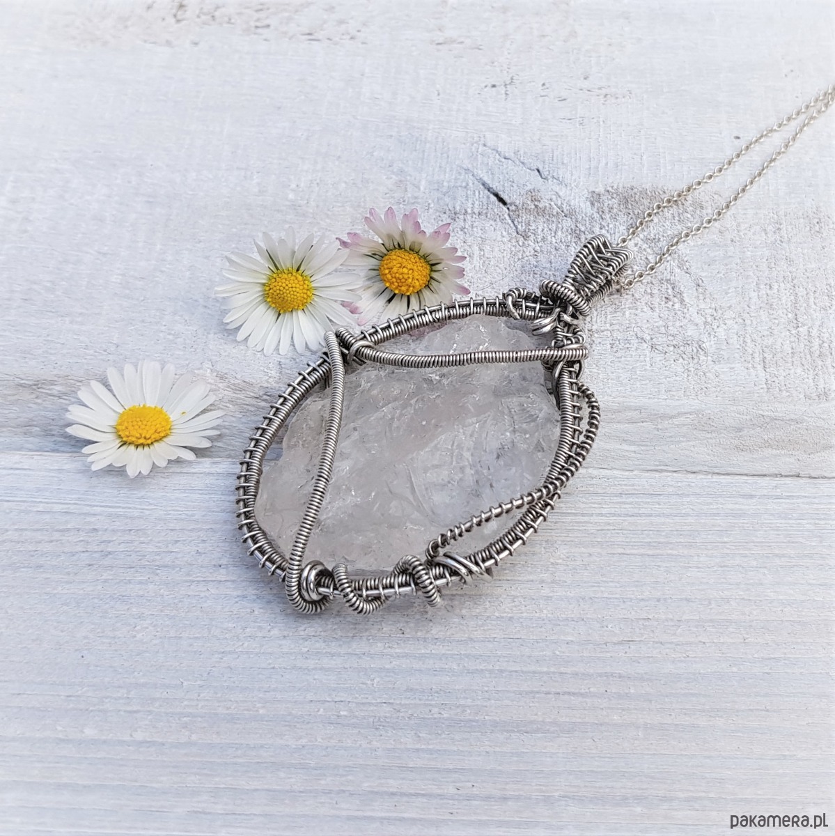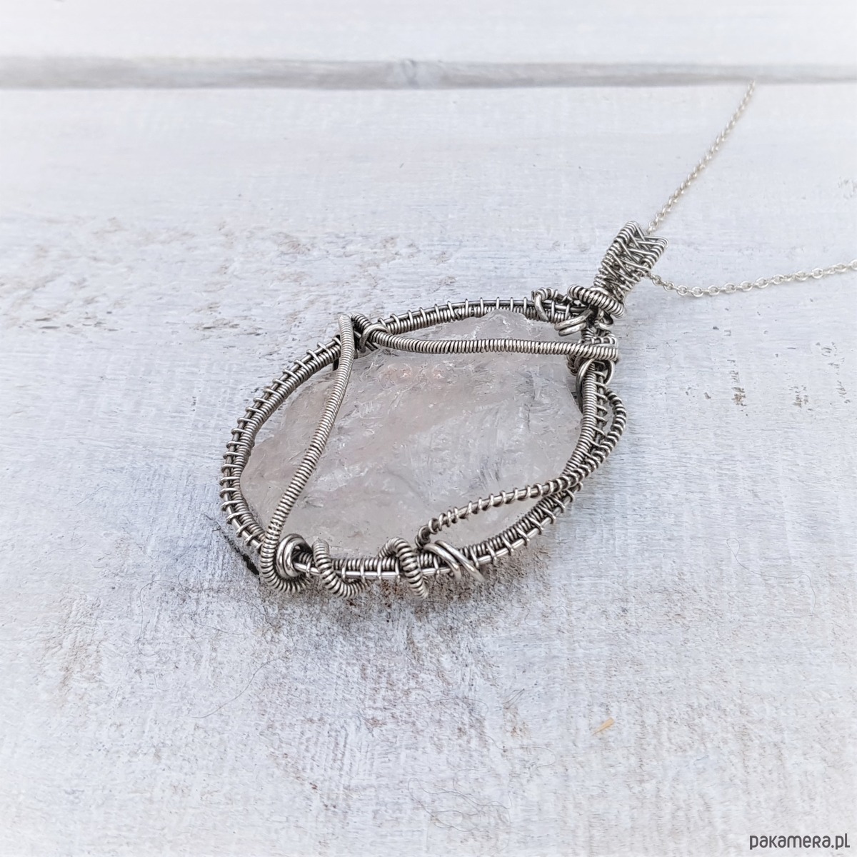 Zawieszka wykonana ręcznie metodą wire-wrappingu z kryształu górskiego w stanie naturalnym, nieciętego i nieszlifowanego pochodzącego z Brazylii. Do wykonania wisiorka użyłam srebrnego drutu najwyższej próby 999, jest pokryty oksydą i wypolerowany. Wymiary zawieszki 63x38mm, z łańcuszkiem długości około 48-50 cm.