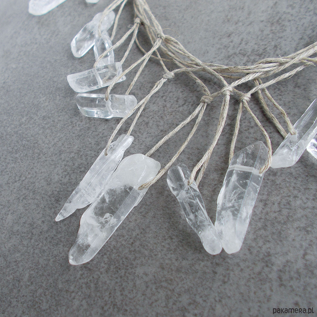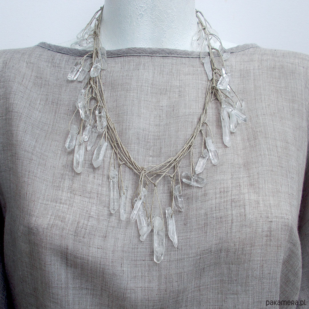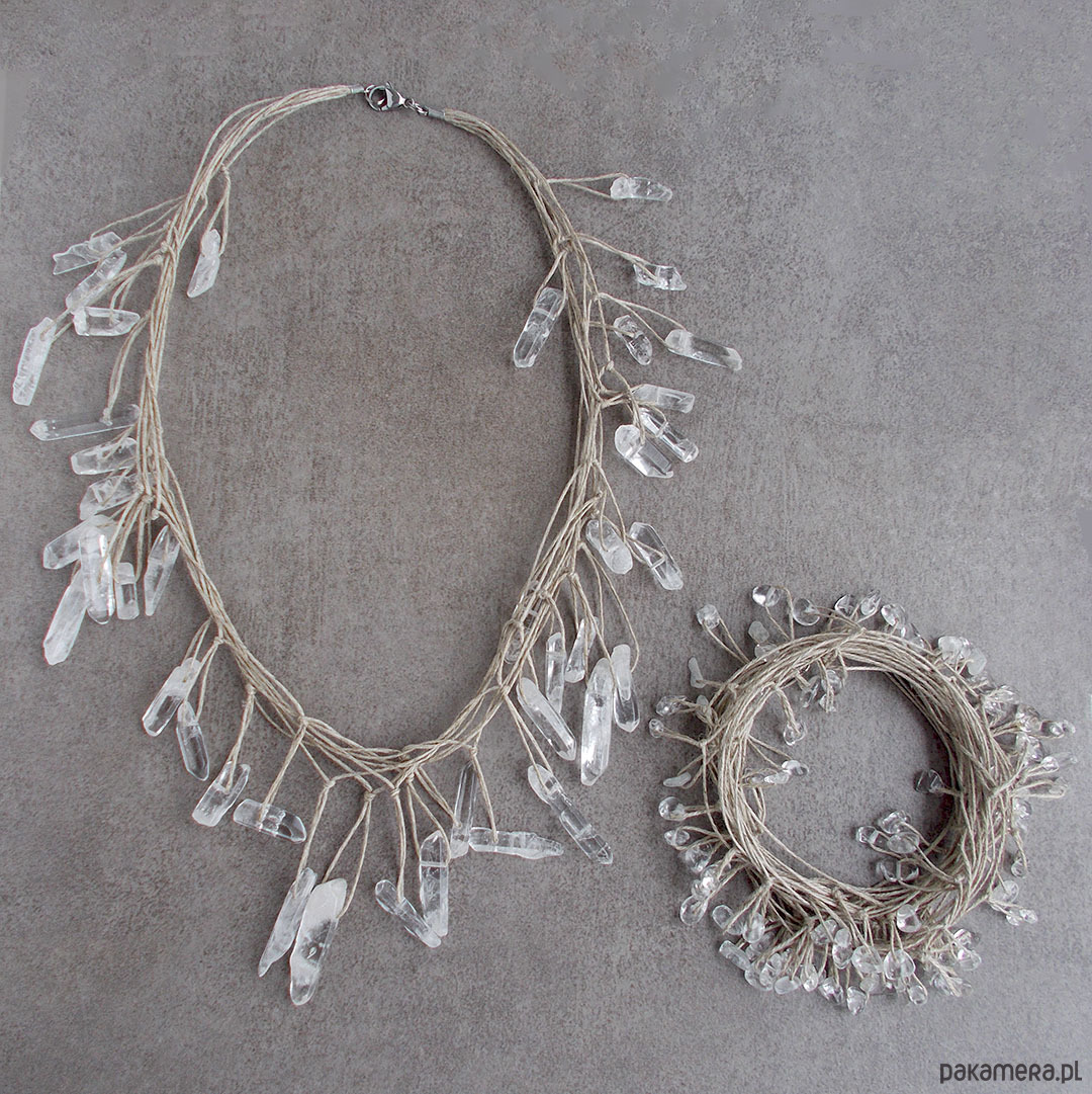 Komplet wyjątkowej biżuterii wyplecionej z naturalnego lnu i pięknych, surowych kamieni kryształu górskiego
