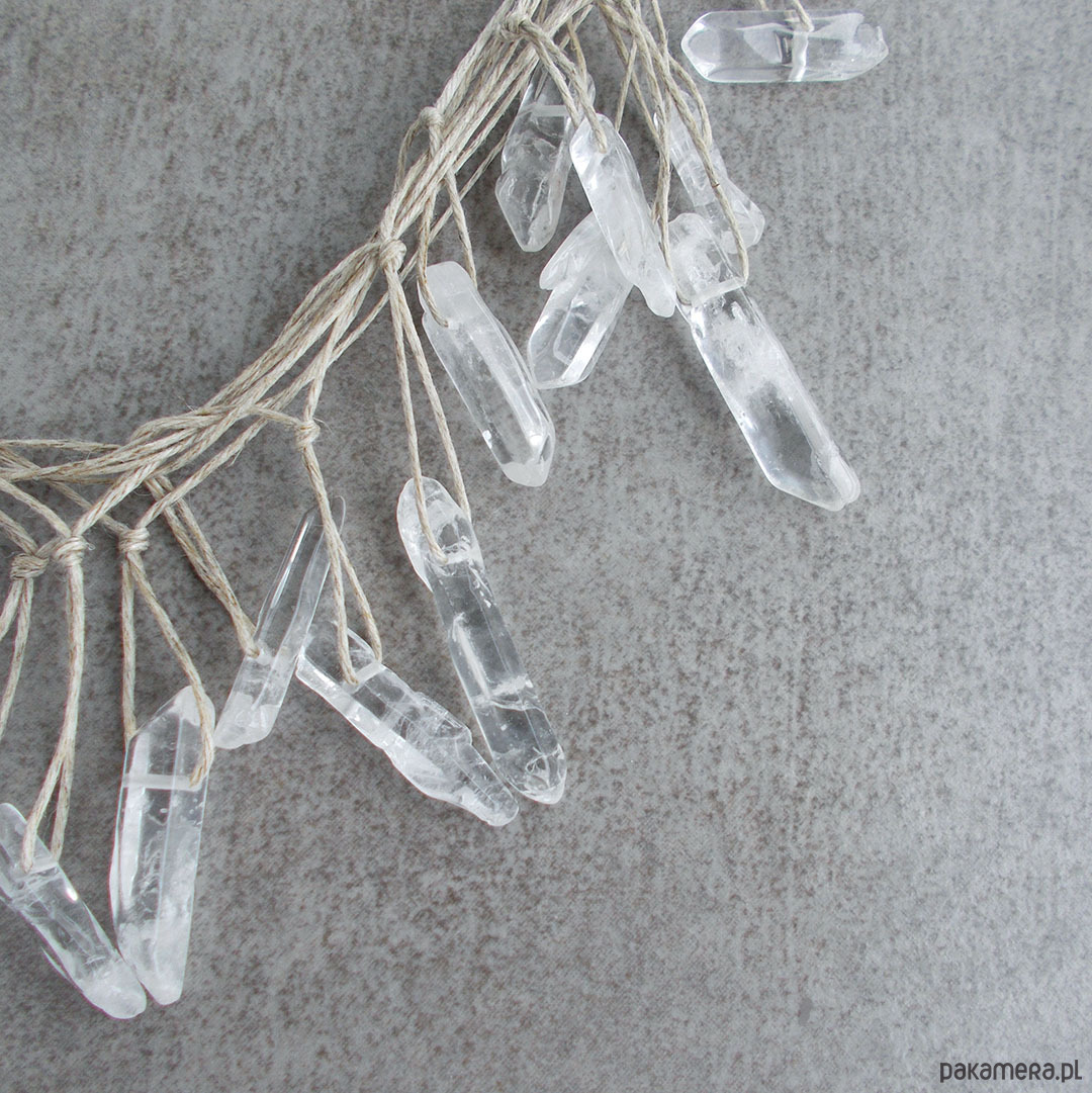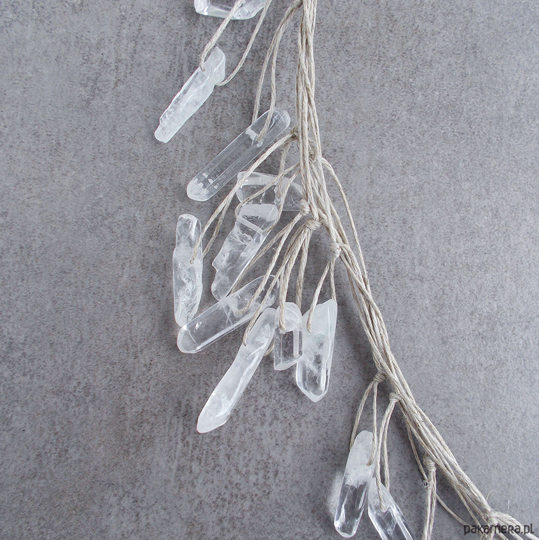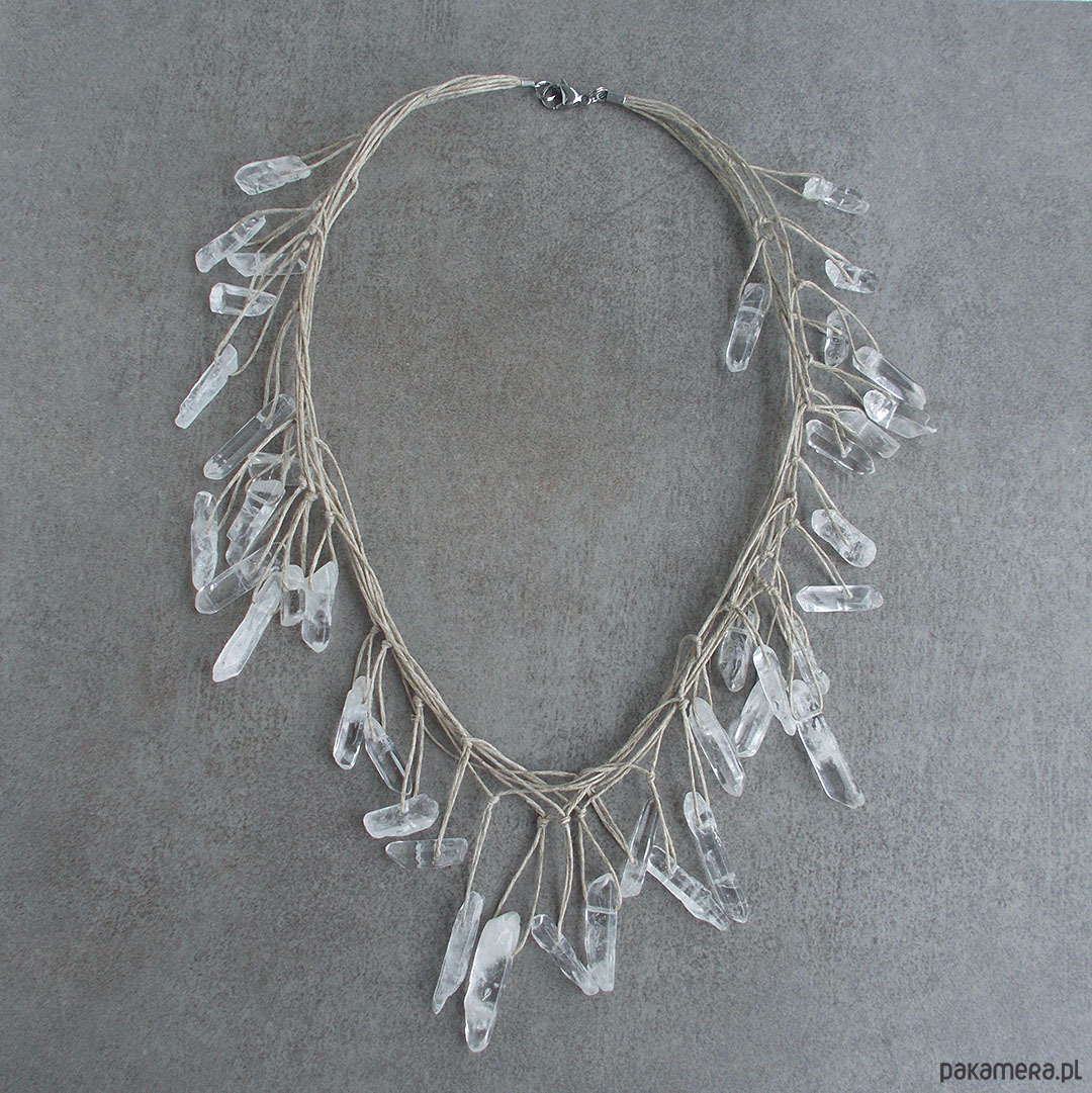 Komplet wyjątkowej biżuterii wyplecionej z naturalnego lnu i pięknych, surowych kamieni kryształu górskiego