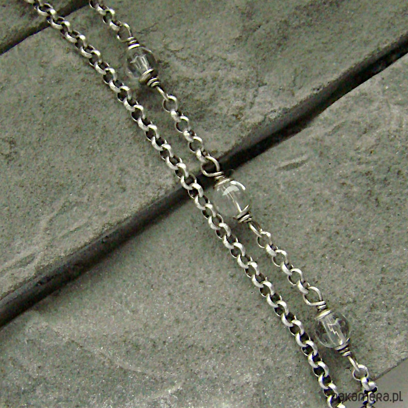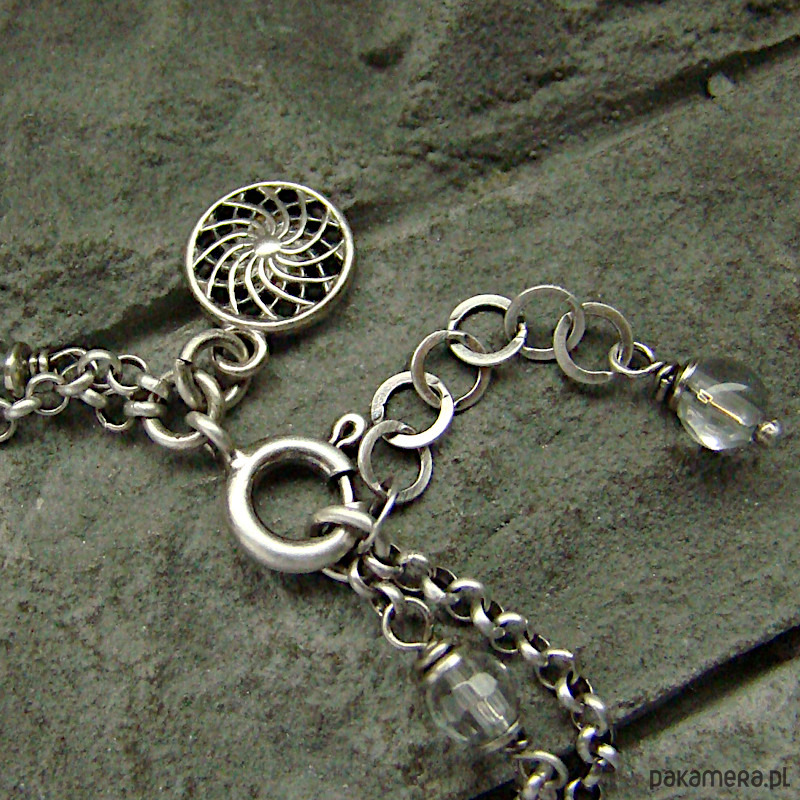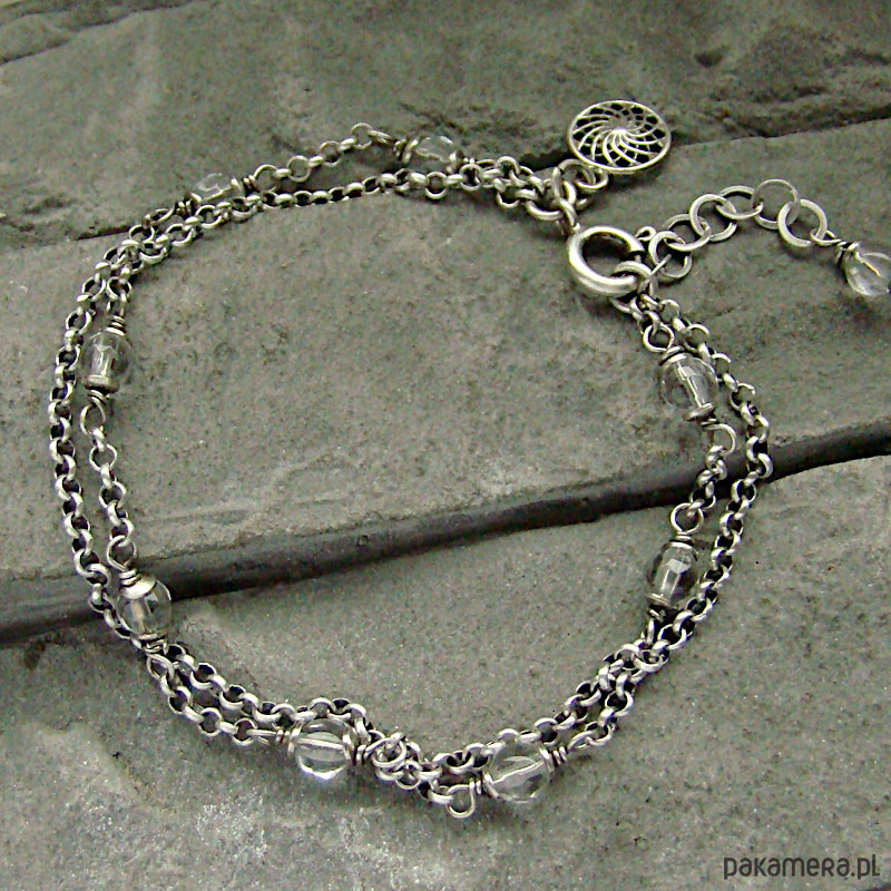 Delikatna, kobieca i wyjątkowa bransoletka na co dzień i nie tylko. Wykonana w całości z oksydowanego srebra próby 925 oraz fasetowanych kulek kryształu górskiego wielkości ok. 4 mm. Przy zapieciu filigranowa zawieszka rozeta. Całkowita długość bransoletki regulowana od 18 cm do 20 cm. W mojej galerii naszyjnik do kompletu. Ozdobnie zapakowana.