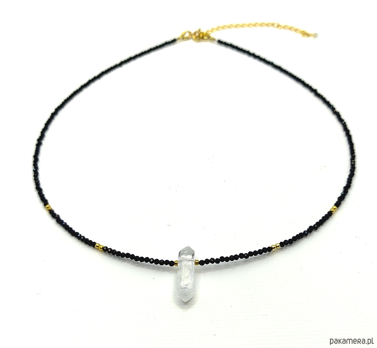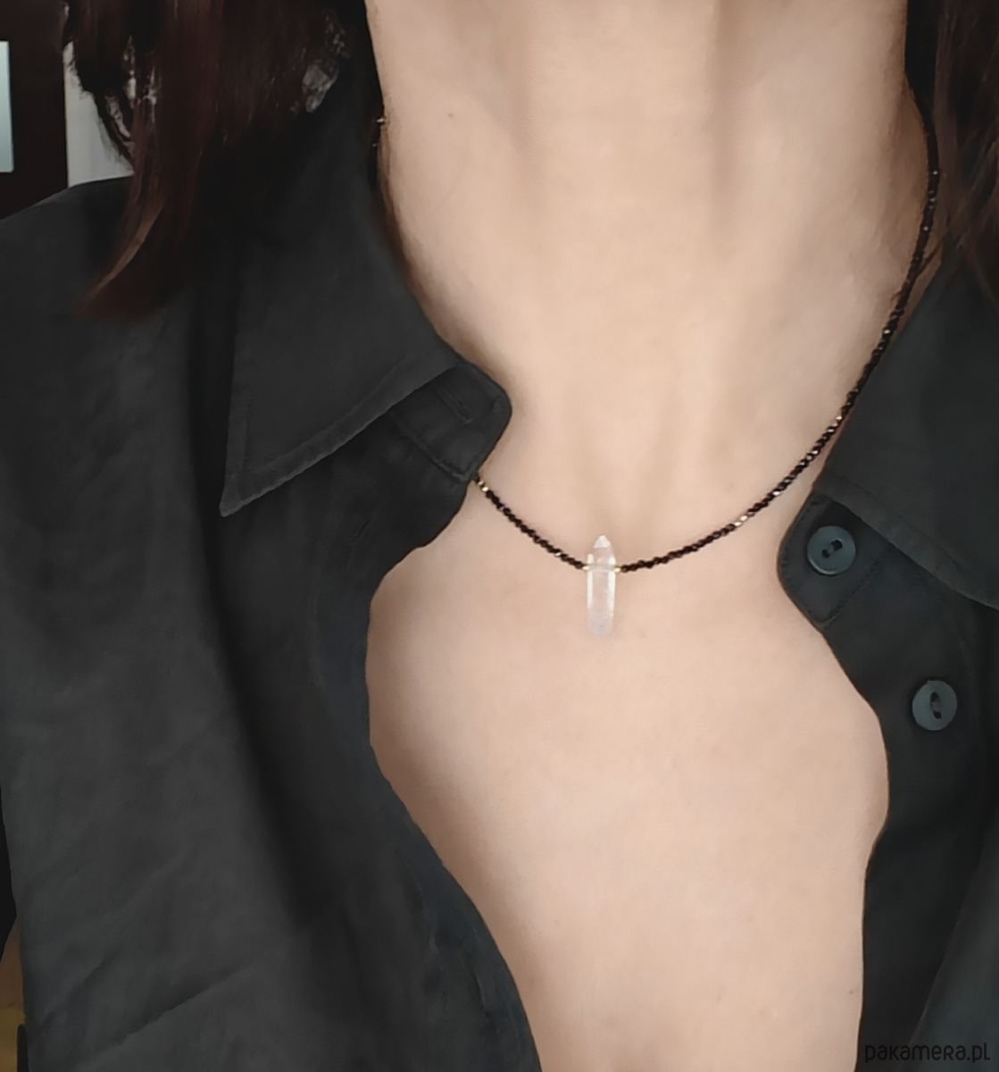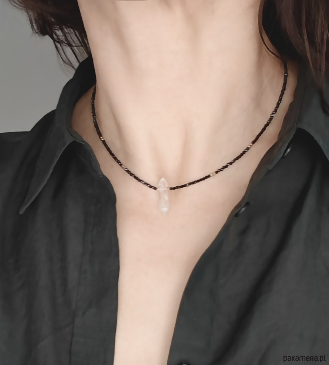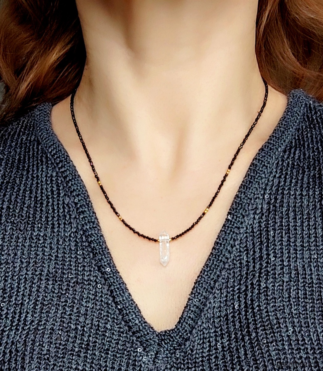 Naszyjnik z kryształem górskim symbolizującym klarowność myśli, transparentność i duży potencjał rozwoju. Jego blask pięknie kontrastuje z czernią fasetowanego turmalinu oraz złoconego srebra. Prezentowany kryształ górski jest delikatny, podłużny, bardzo zgrabny. Biżuteria na wiele okazji.