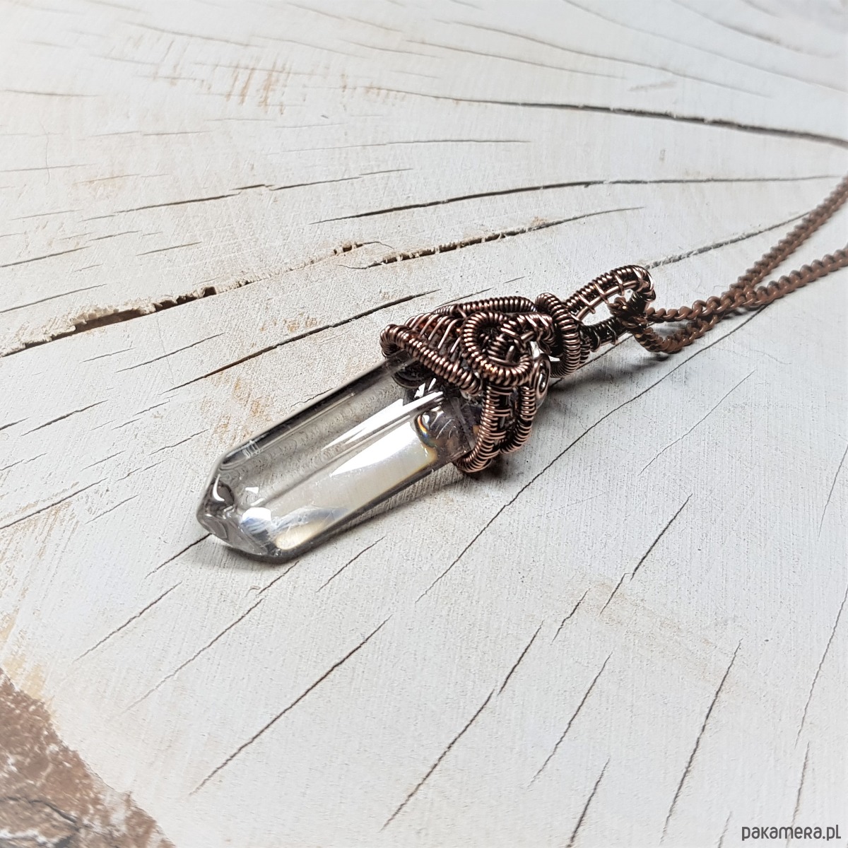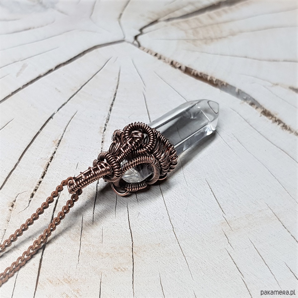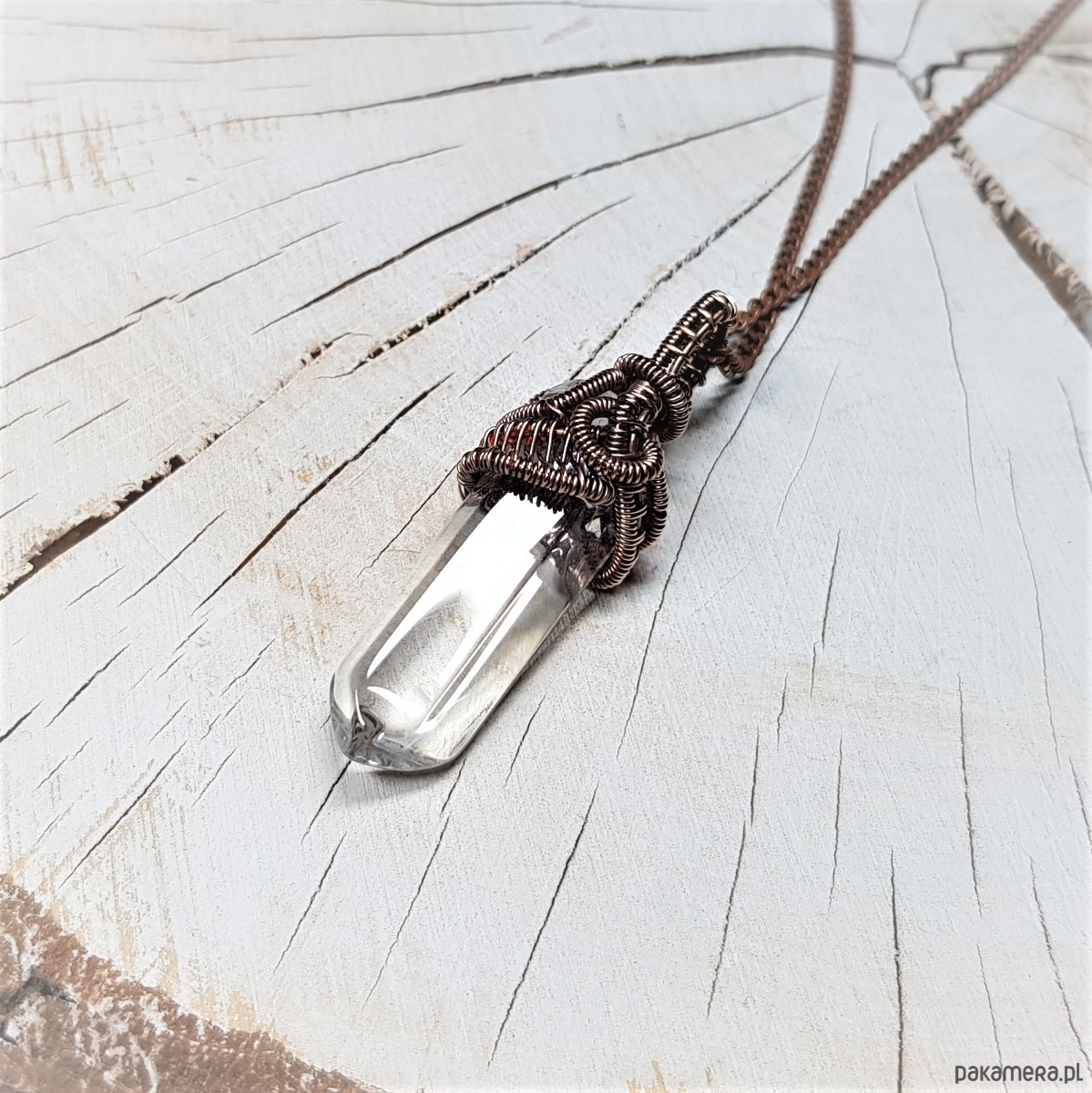 Zawieszka wykonana ręcznie metodą wire-wrappingu z kryształu górskiego w kształcie sopla. Do wykonania wisiorka użyłam miedzianego drutu który następnie przyciemniłam oksydą i wypolerowałam w celu uzyskania efektu szlachetnego postarzenia . Zawieszka ma wymiary 47x15mm z łańcuszkiem długości około 48-50 cm .