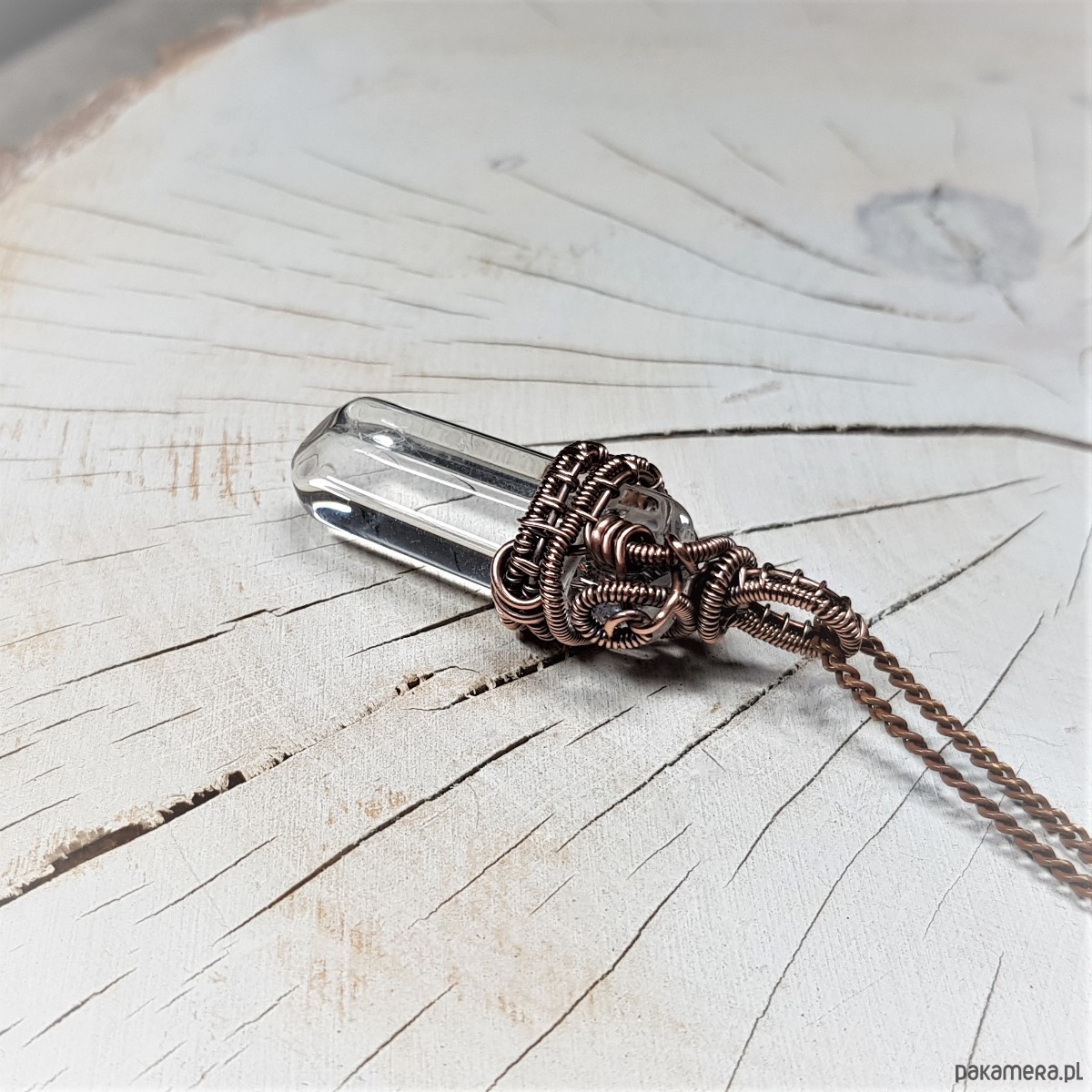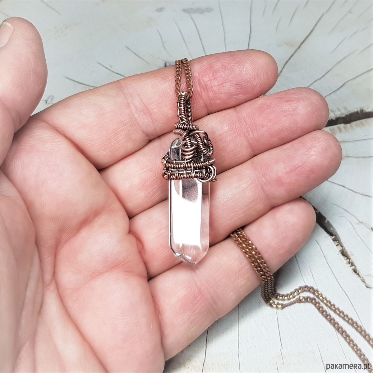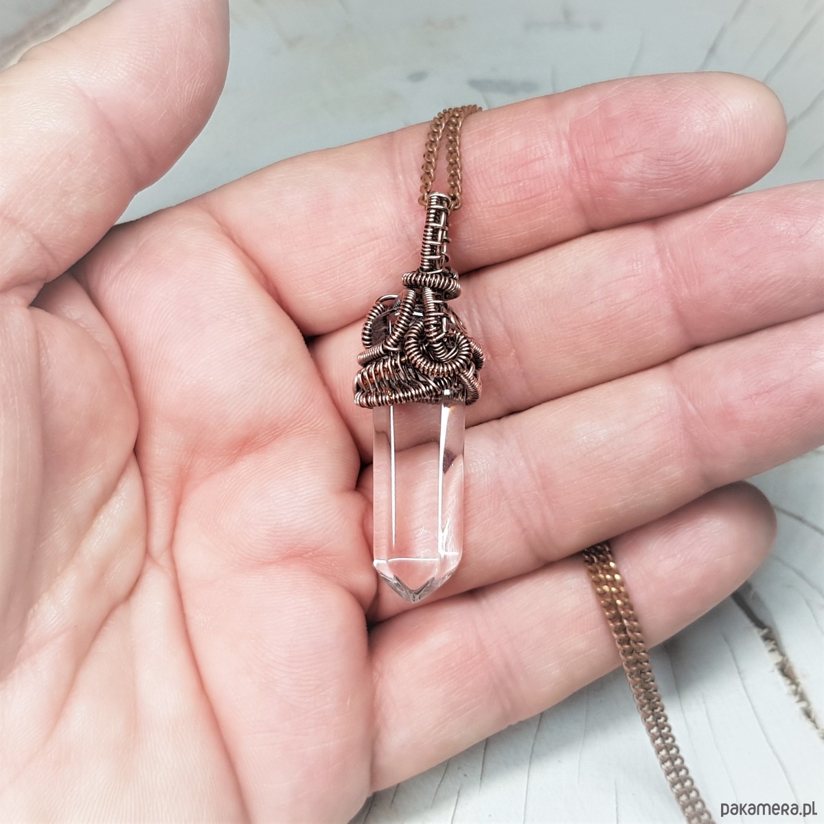 Zawieszka wykonana ręcznie metodą wire-wrappingu z kryształu górskiego w kształcie sopla. Do wykonania wisiorka użyłam miedzianego drutu który następnie przyciemniłam oksydą i wypolerowałam w celu uzyskania efektu szlachetnego postarzenia . Zawieszka ma wymiary 47x15mm z łańcuszkiem długości około 48-50 cm .