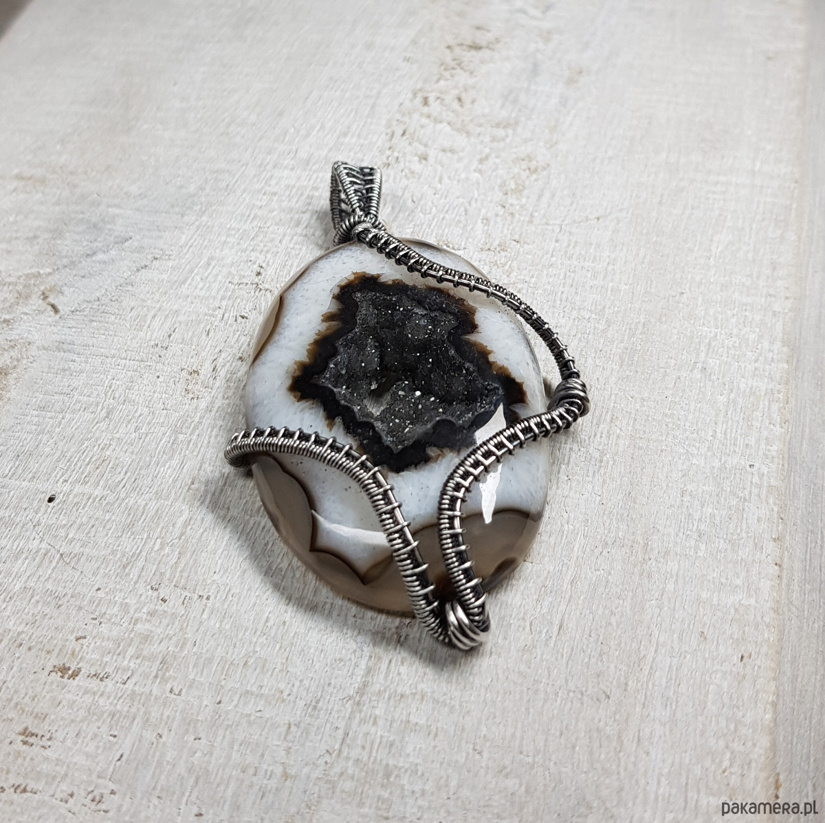 Zawieszka wykonana ręcznie metodą wire-wrappingu której głównym elementem jest agat z przepiękną kryształową druzą pośrodku. Wewnątrz grafitowej druzy setki kryształków połyskują lustrzanym blaskiem. Agat jest wyjątkowy, a kryształy wewnątrz druzy pięknie wykształcone i lśniące. Do wykonania wisiorka użyłam srebra najwyższej próby 999 które następnie oksydowałam i wypolerowałam w celu uzyskania szlachetnego efektu postarzenia . Wymiary zawieszki 66x38mm z łańcuszkiem długości około 45-50 cm.