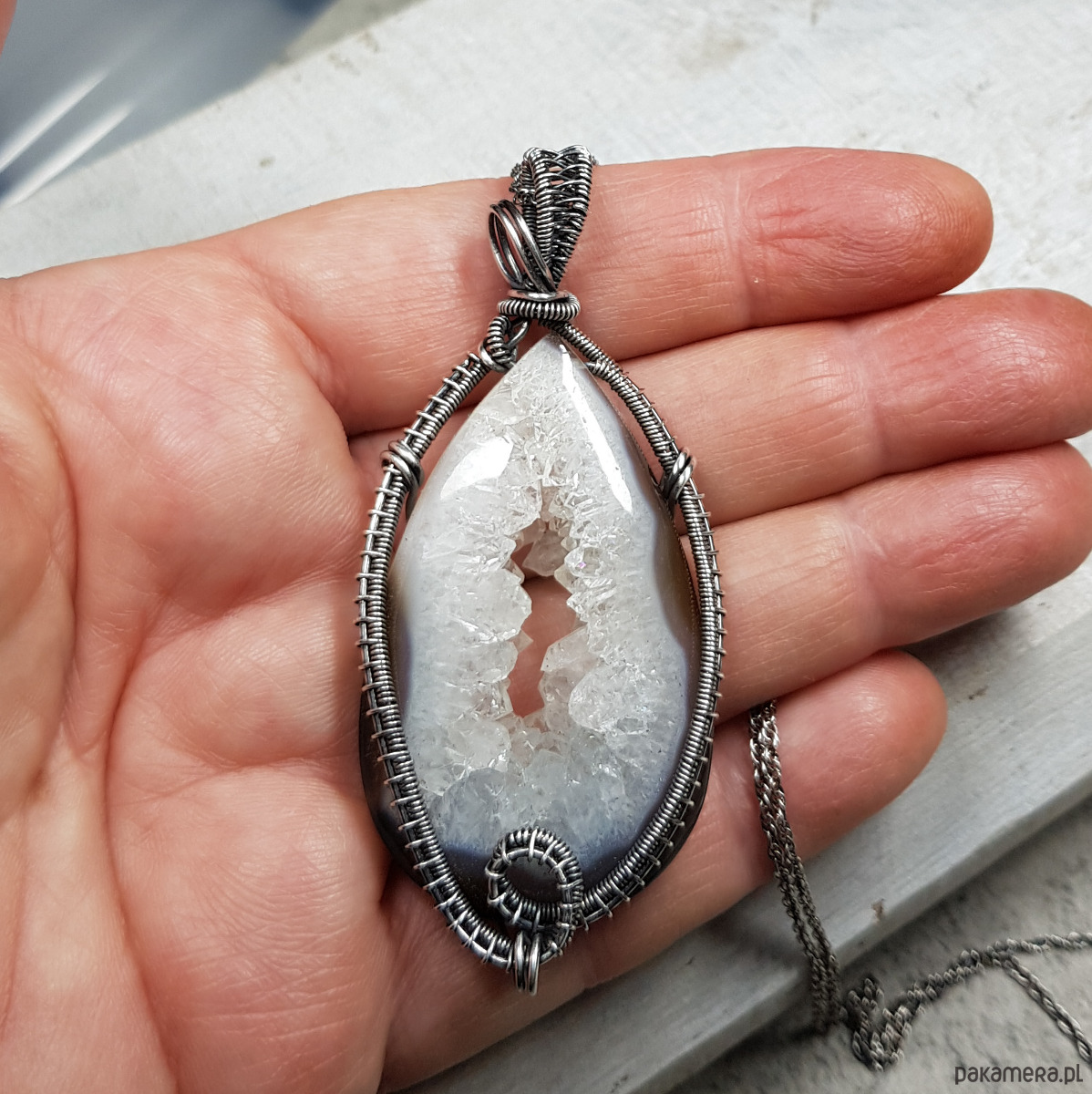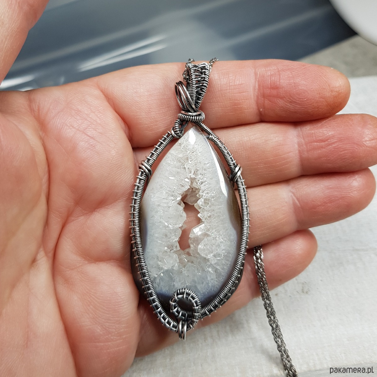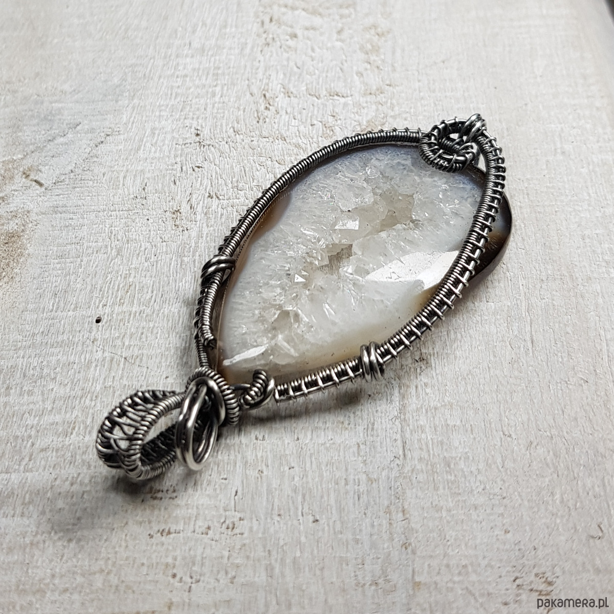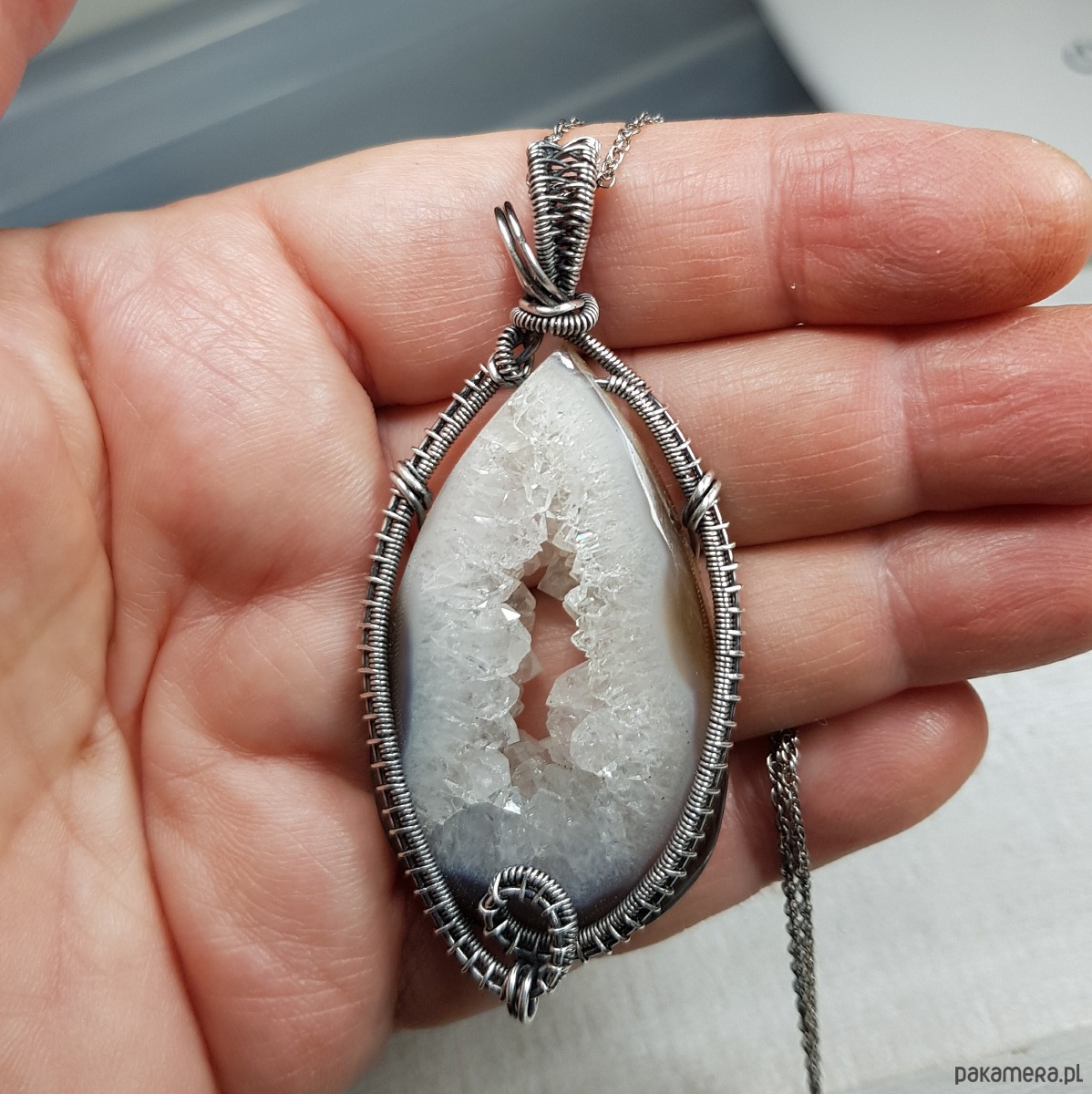 Zawieszka wykonana ręcznie metodą wire-wrappingu której głównym elementem jest agat z przepiękną kryształową druzą pośrodku. Wewnątrz śnieżno białej druzy setki kryształków połyskują lustrzanym blaskiem. Agat jest wyjątkowy, a kryształy wewnątrz druzy pięknie wykształcone i lśniące. Do wykonania wisiorka użyłam srebra najwyższej próby 999 które następnie oksydowałam i wypolerowałam w celu uzyskania szlachetnego efektu postarzenia . Wymiary zawieszki 71x32mm z łańcuszkiem długości około 45-50 cm.