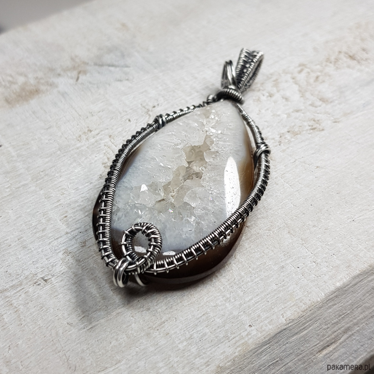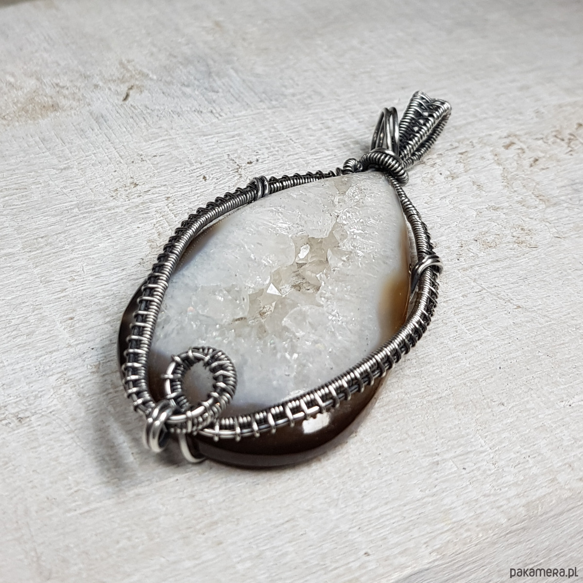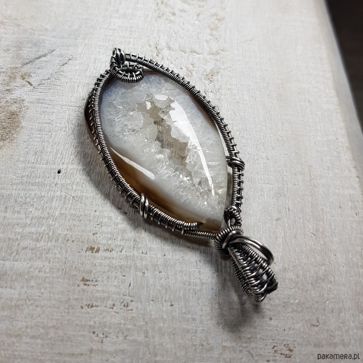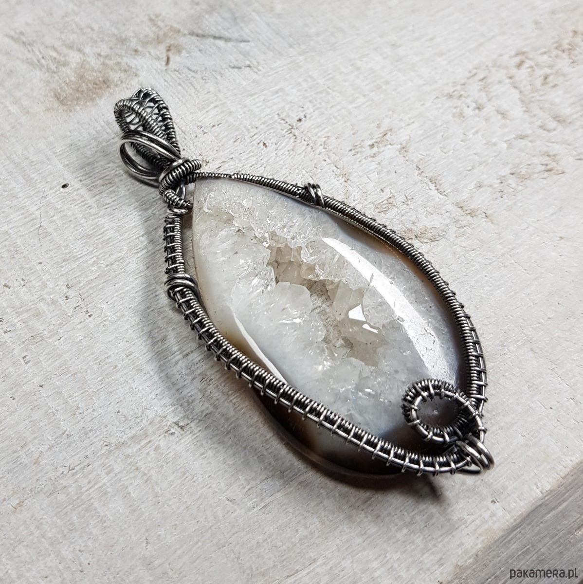 Zawieszka wykonana ręcznie metodą wire-wrappingu której głównym elementem jest agat z przepiękną kryształową druzą pośrodku. Wewnątrz śnieżno białej druzy setki kryształków połyskują lustrzanym blaskiem. Agat jest wyjątkowy, a kryształy wewnątrz druzy pięknie wykształcone i lśniące. Do wykonania wisiorka użyłam srebra najwyższej próby 999 które następnie oksydowałam i wypolerowałam w celu uzyskania szlachetnego efektu postarzenia . Wymiary zawieszki 71x32mm z łańcuszkiem długości około 45-50 cm.