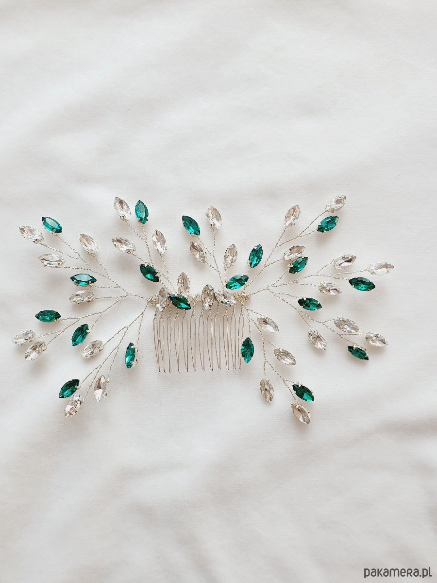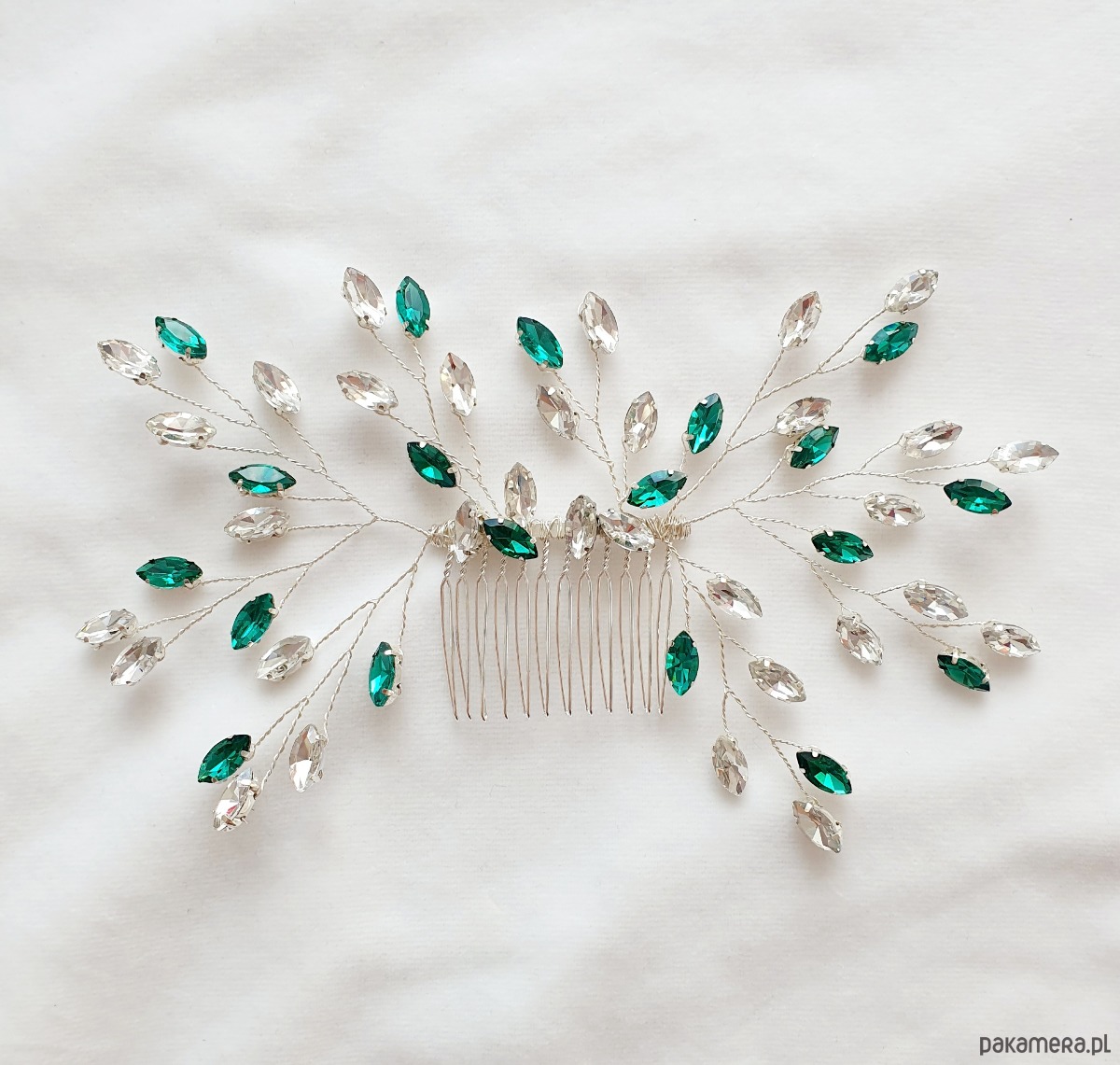 Grzebyk wypleciony na elastycznym druciku dzięki czemu można go dopasować do każdej fryzury. Do wykonania go zostały użyte oprawione kryształki Preciosa w kolorze clear oraz w kolorze butelkowej zieleni.