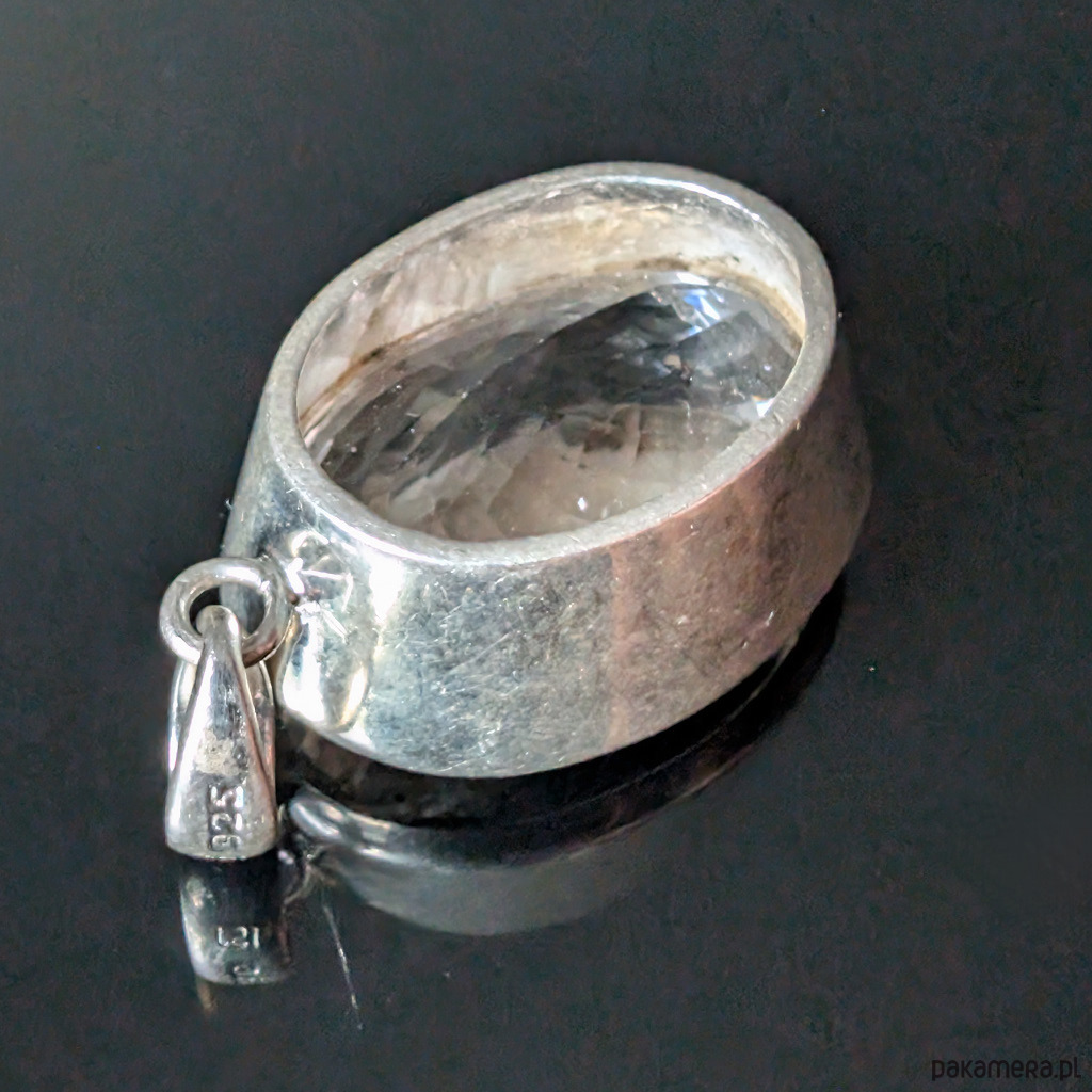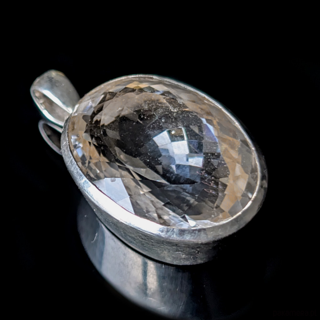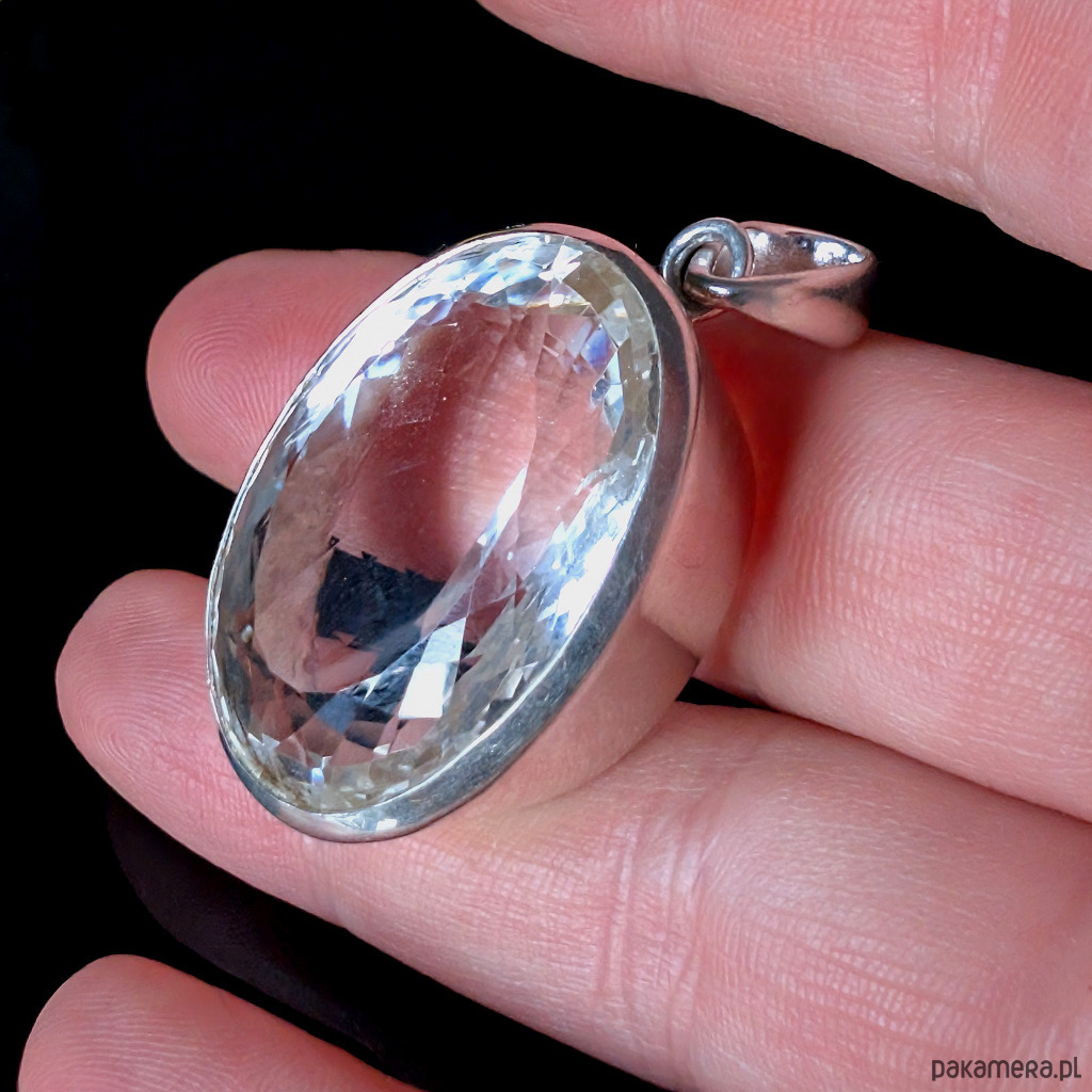 Wisior z kryształem kwarcu zwanym górskim. Niezwykłe, ultraczyste lustro minerału spotęgowane precyzyjnym szlifem. Przepiękny, duzy okaz. Kryształ oprawiony w srebro pr.925. Wymiary całego wisiora 30 x 22 mm, grubość 14 mm. Długość z krawatką 42 mm. Waga 22,8 grama. Otwarty tył wisiora ukazuje niezwykłe piękno kamienia w pełnej krasie. Wykonany przez dostawcę kamieni. Wisior zapakowany w ozdobne pudełeczko.