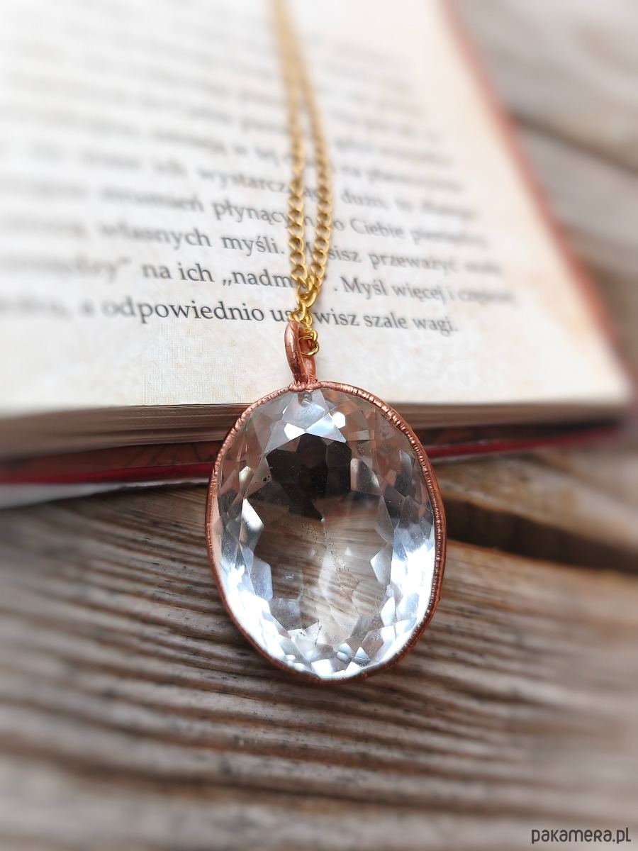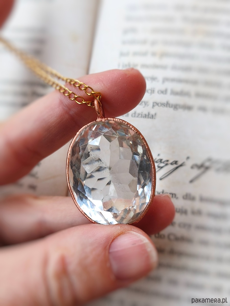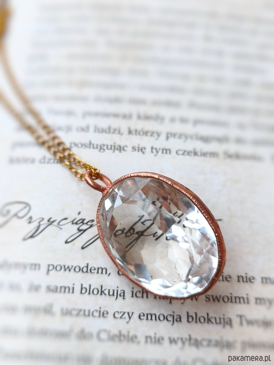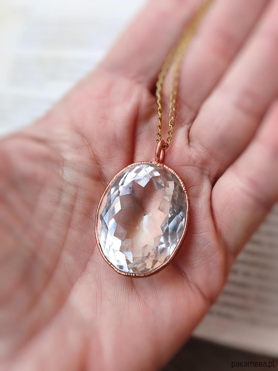 Oprawę wykonaliśmy techniką elektroformowania, która pozwala miedzi miękko otulić kamień i podkreślić jego kształt. Każdy egzemplarz jest unikalny, a ciepły odcień miedzi harmonijnie współgra z przejrzystością kryształu.