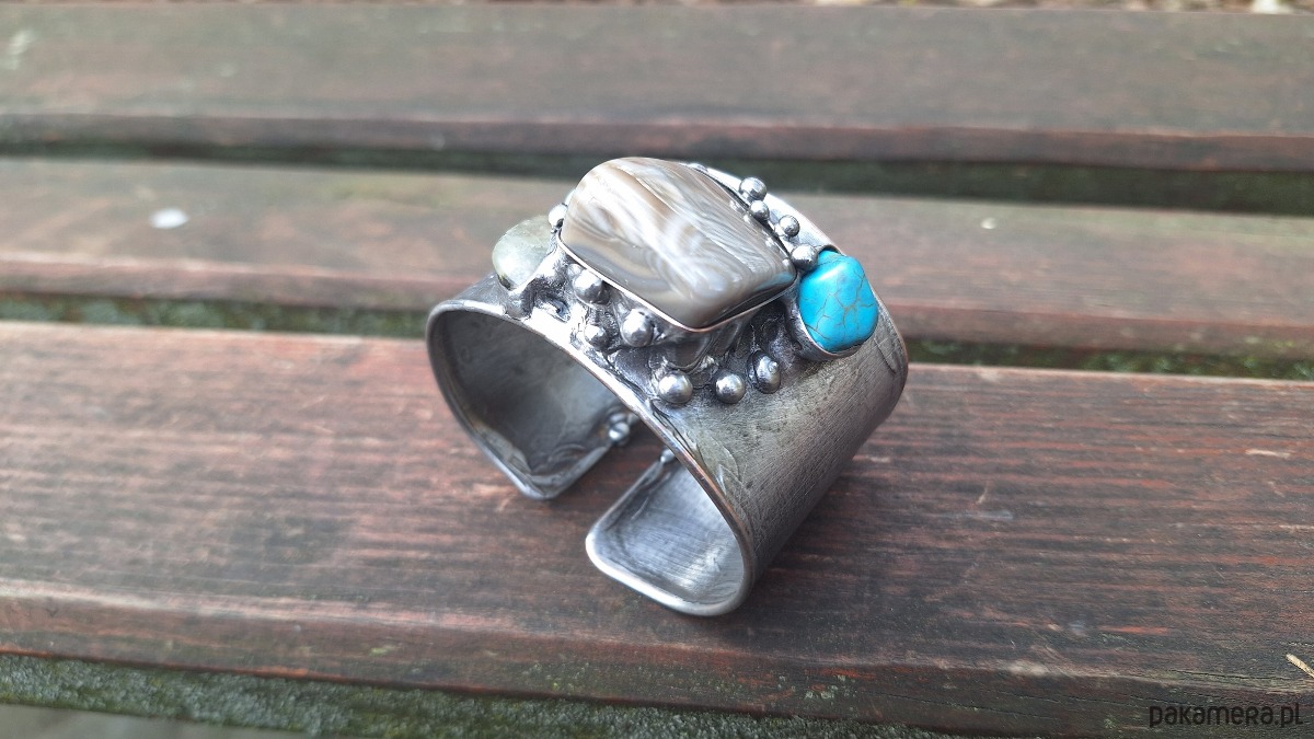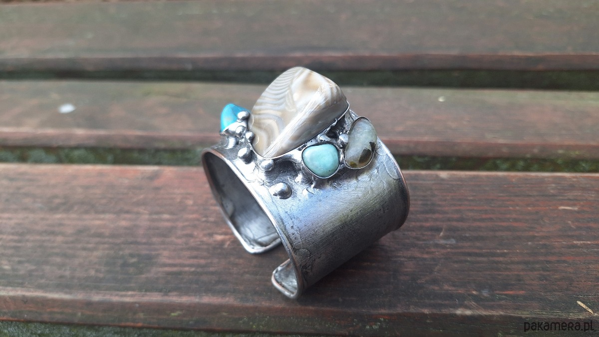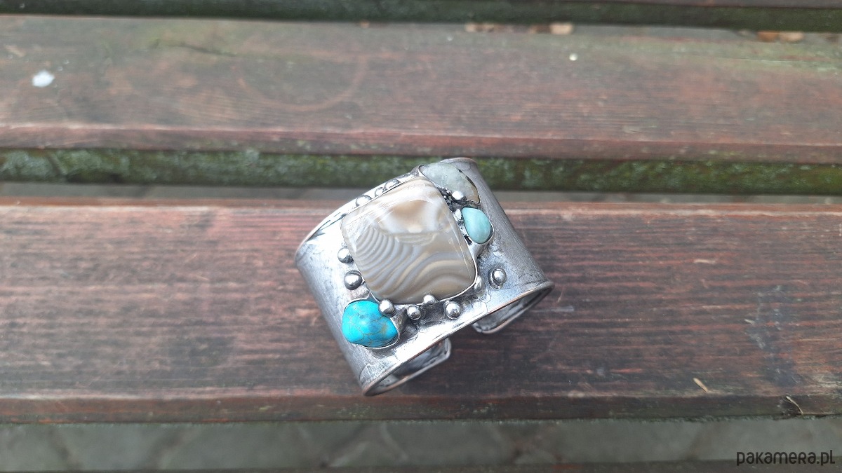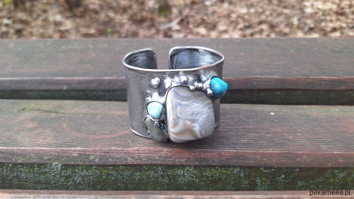 Lekka bransoleta wykonana z miedzi, cyny, howlitu, amazonitu, prenitu i krzemienia pasiastego. Szerokość ok. 4. 5 cm; regulowana.