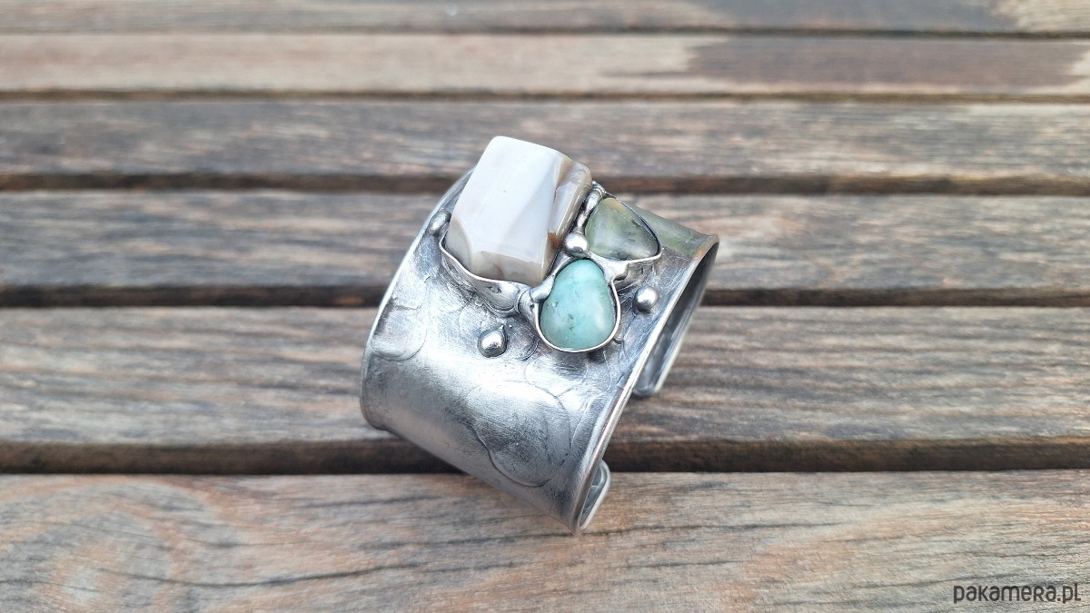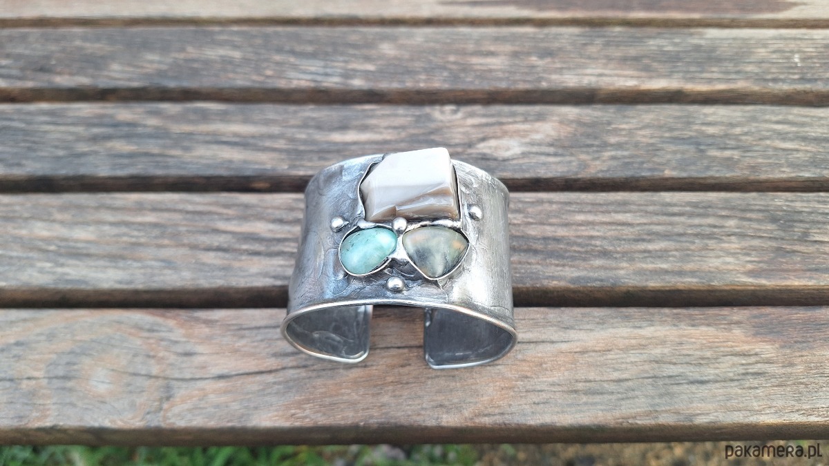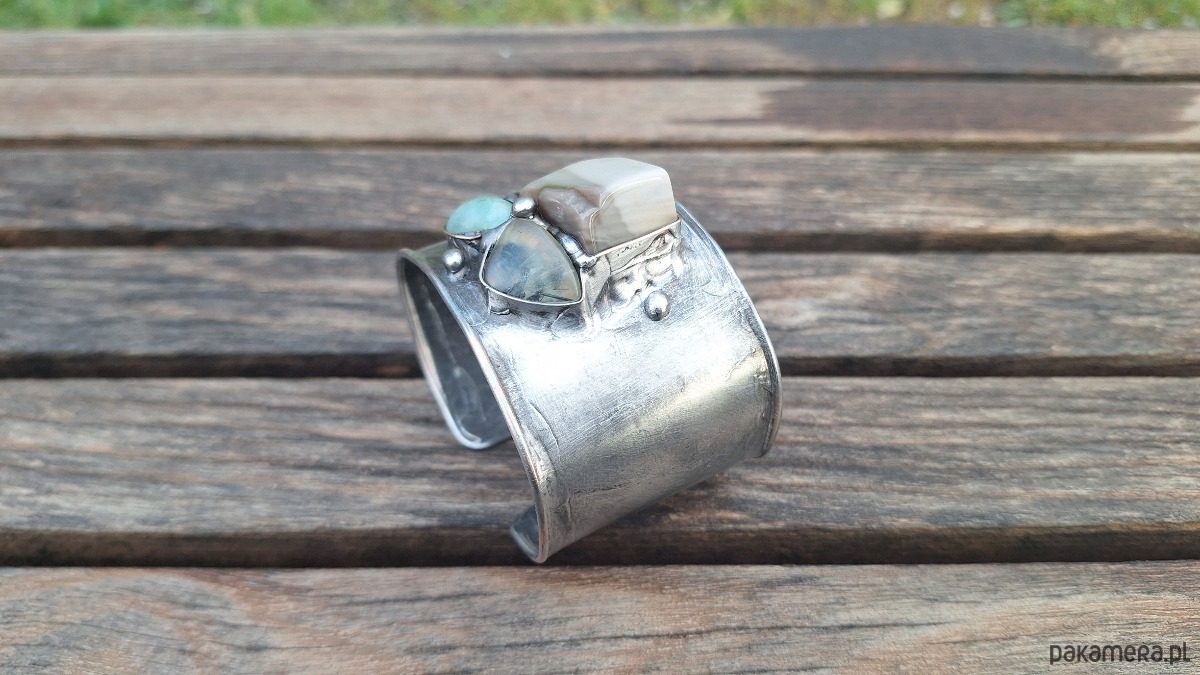 Lekka bransoleta wykonana z miedzi, cyny, amazonitu, prenitu i krzemienia pasiastego. Szerokość ok. 4. 5 cm; regulowana.