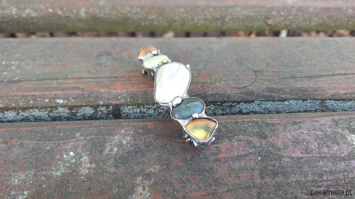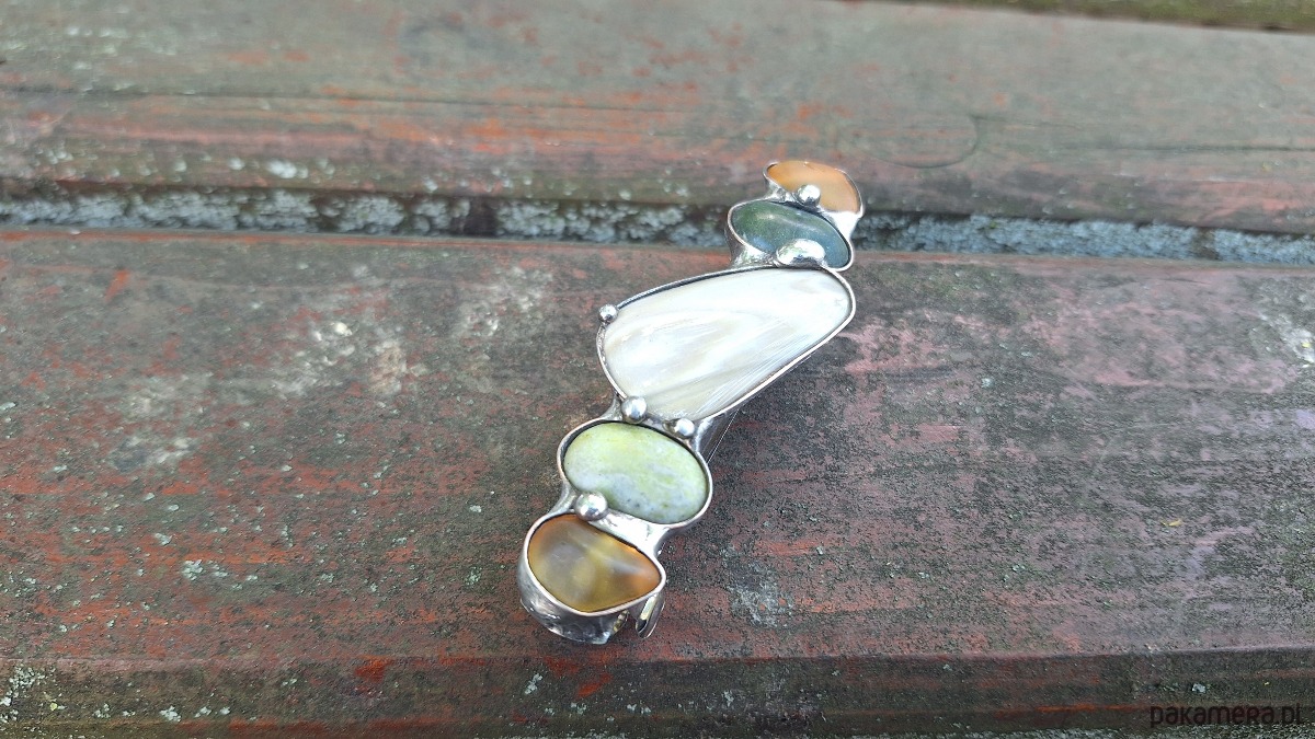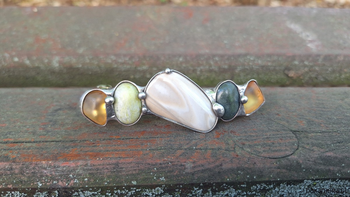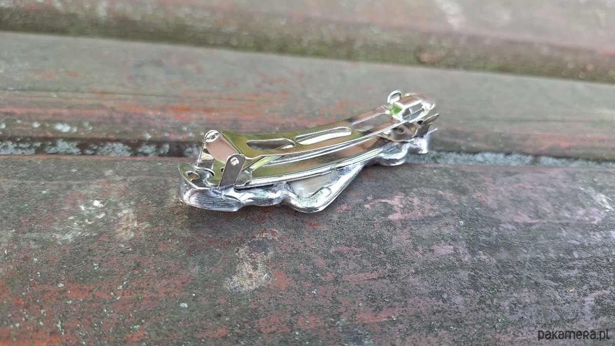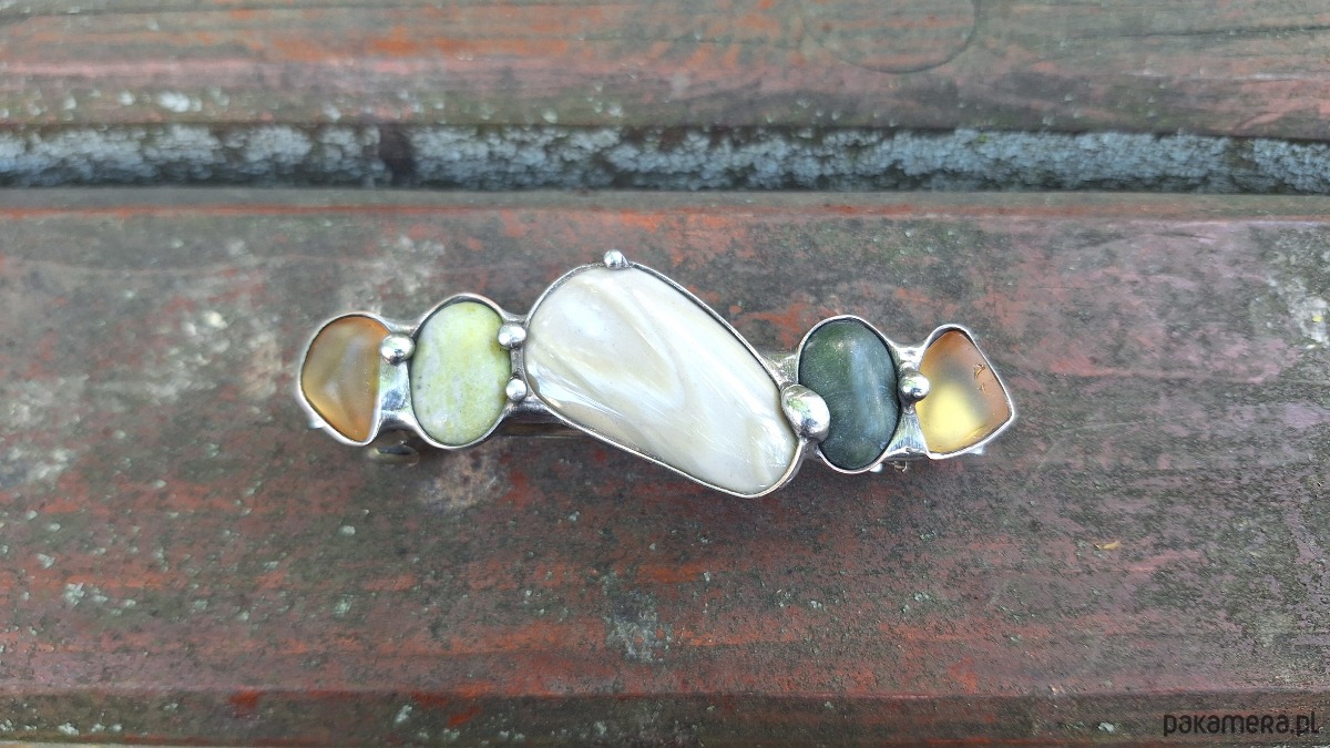 Klamra do włosów, wykonana z miedzi, cyny, szkła, jaspisów i krzemienia pasiastego. Zapięcie metalowe, automatyczne, ok. 6 cm. Wymiary ok. 8 na 2 cm.