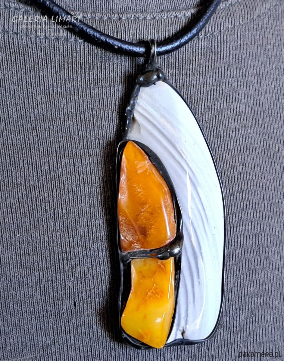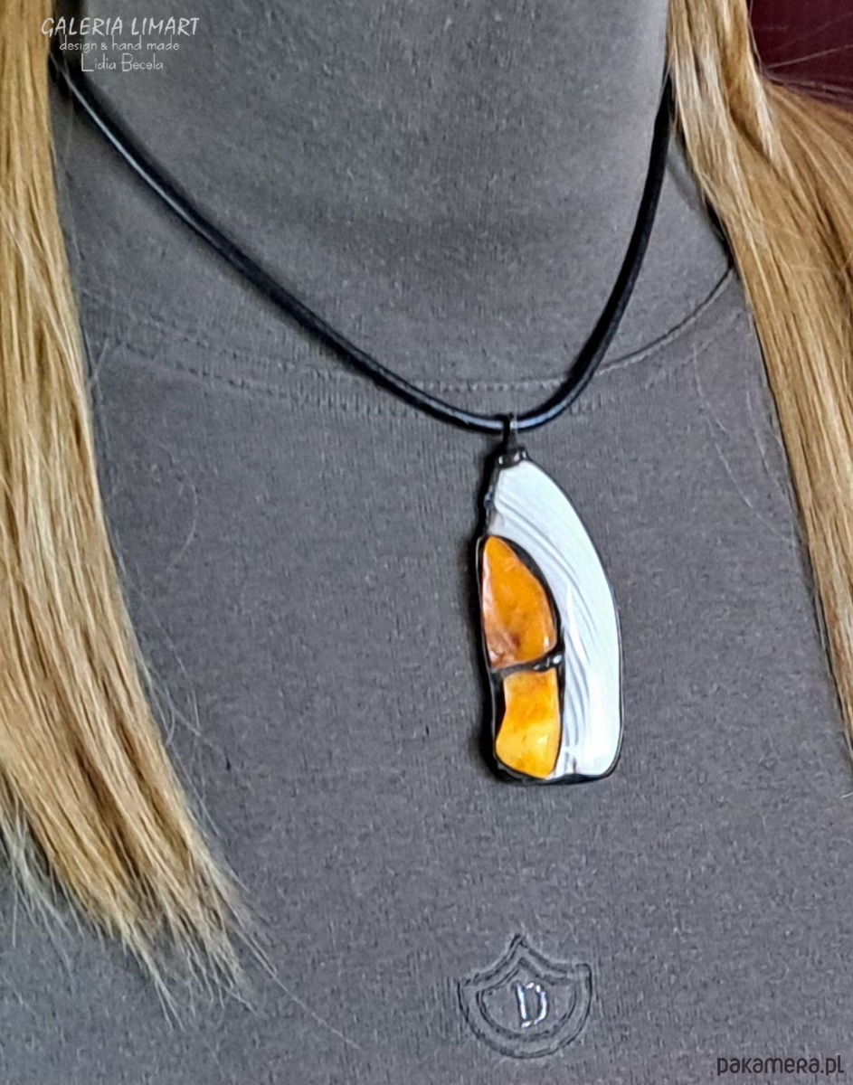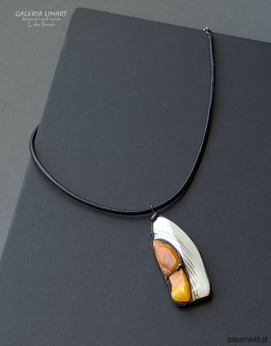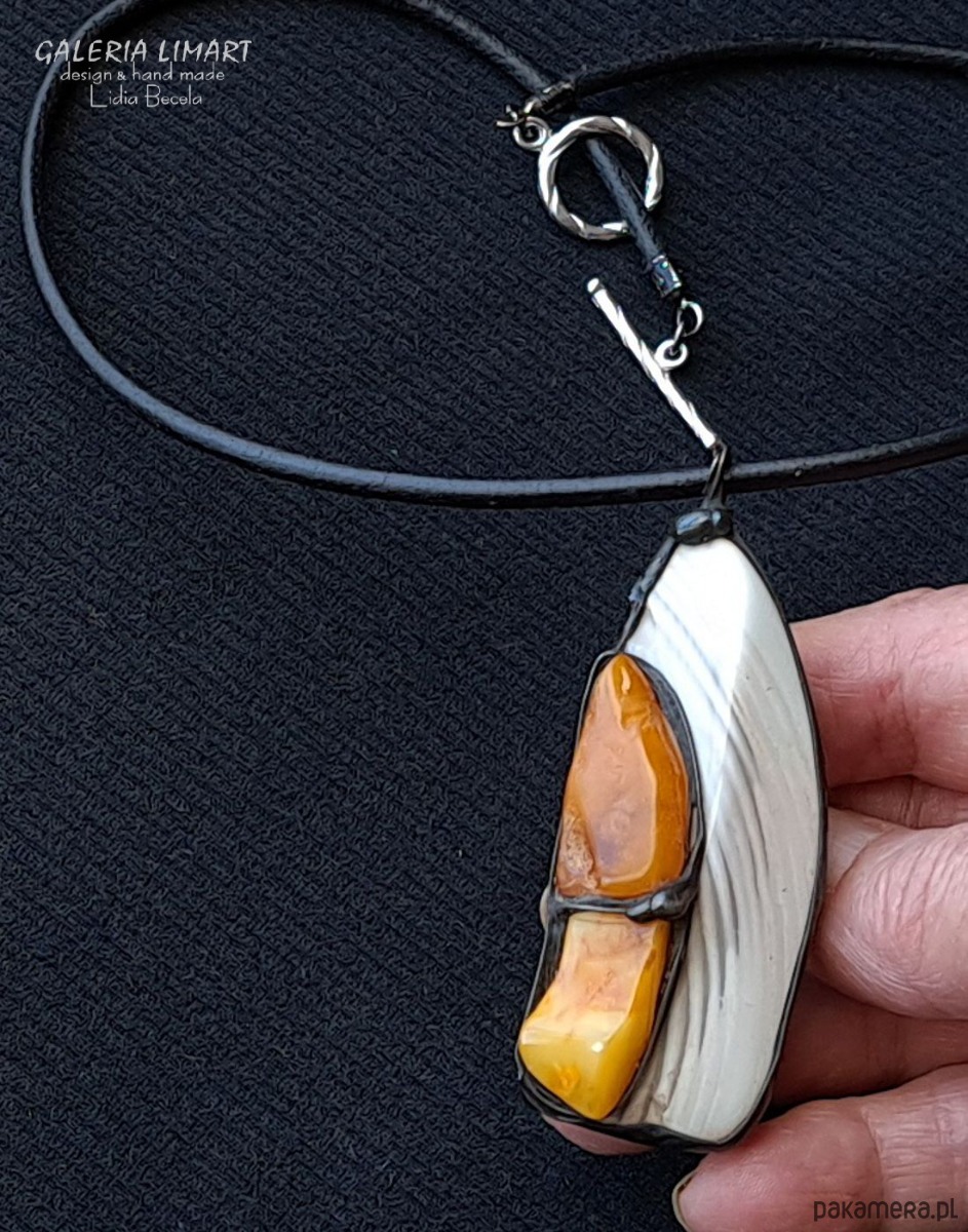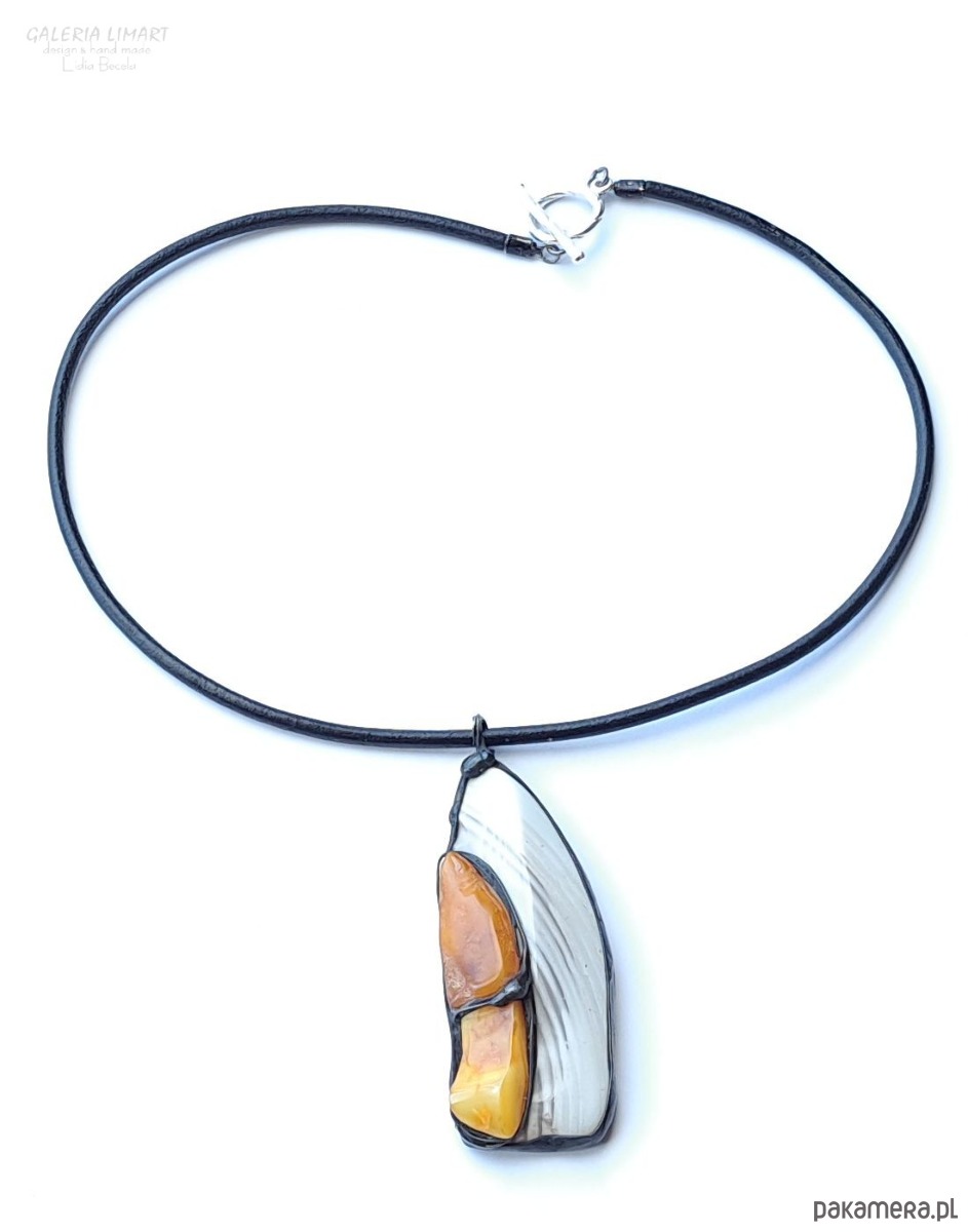 Krzemień pasiasty i bursztyn w designerskim wisiorze ręcznie robionym gift LUX