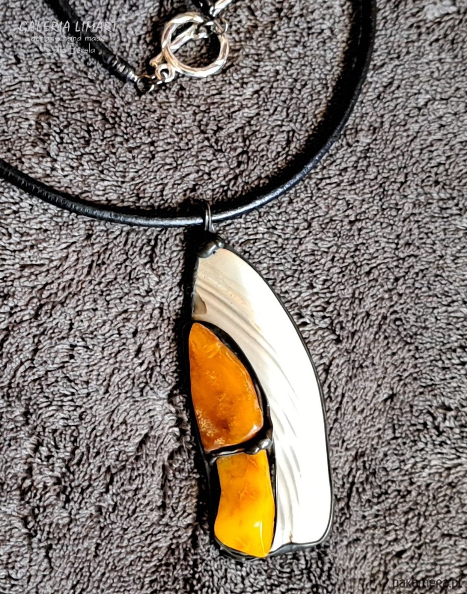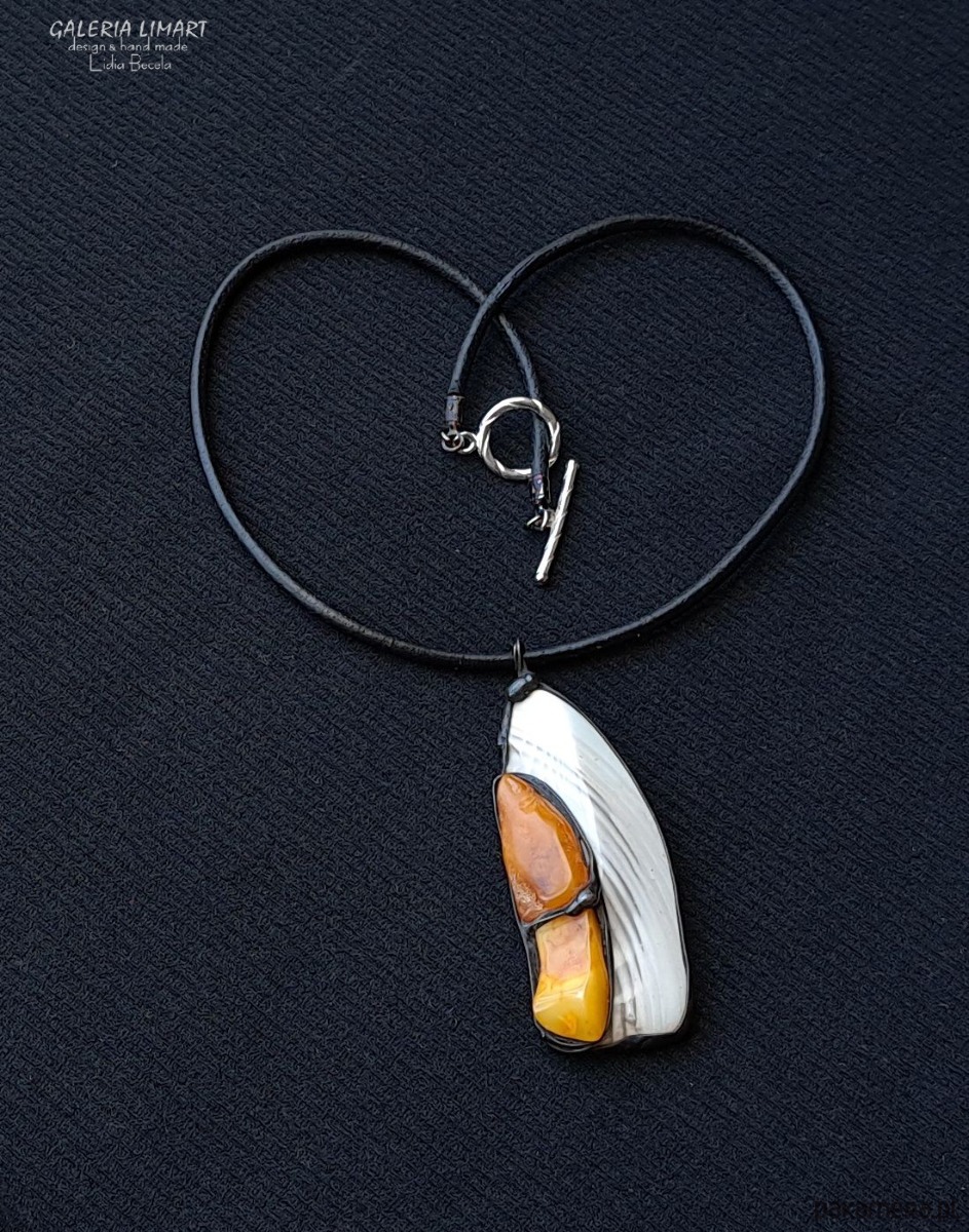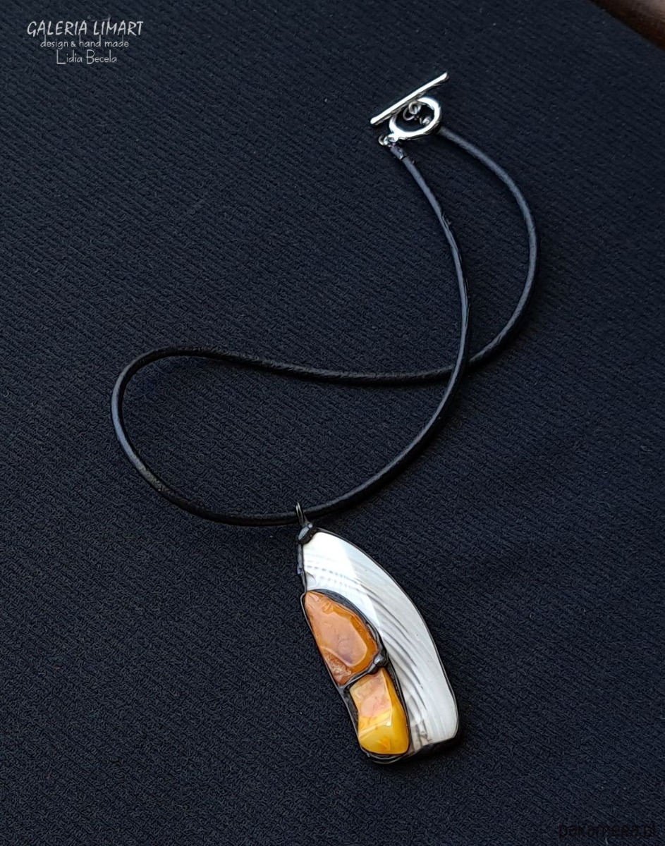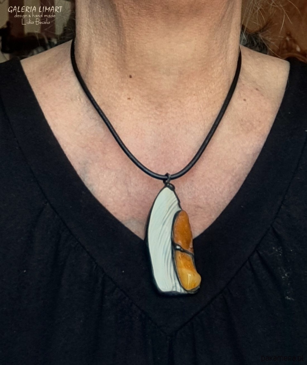 Krzemień pasiasty i bursztyn w designerskim wisiorze ręcznie robionym gift LUX
