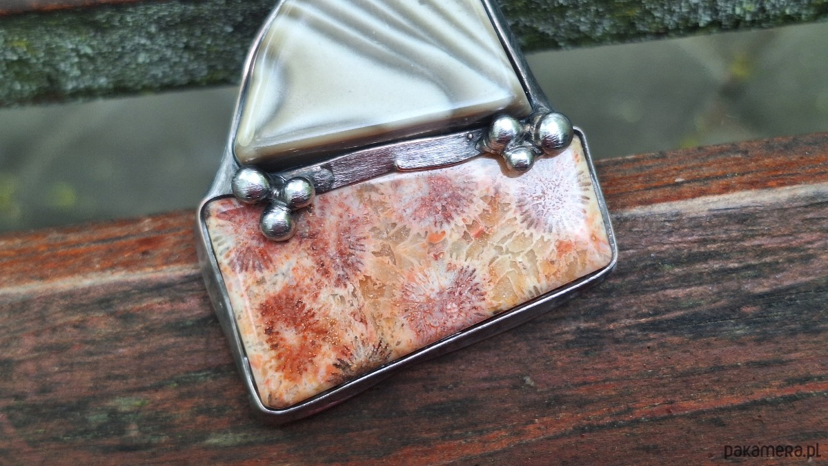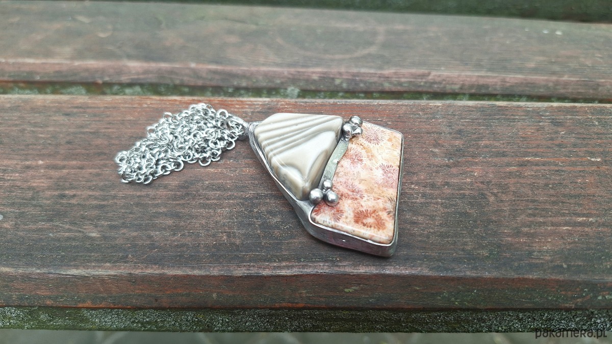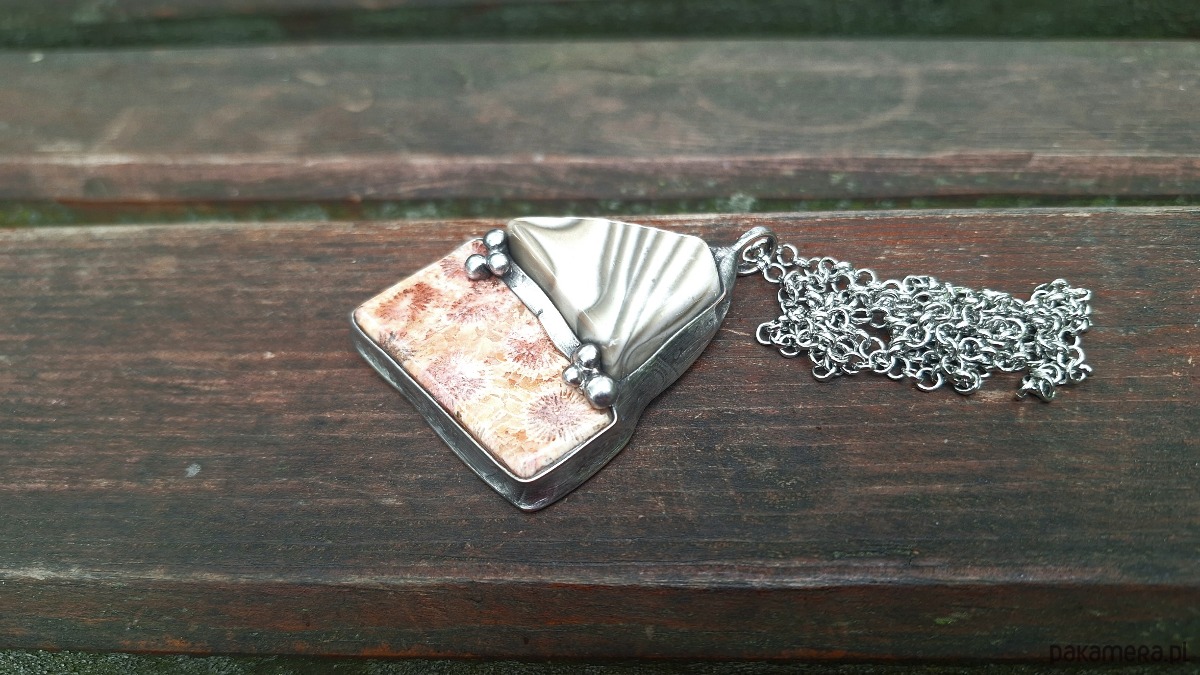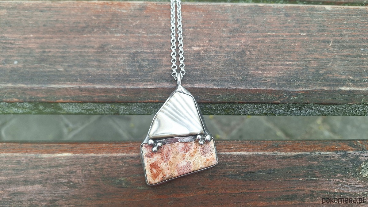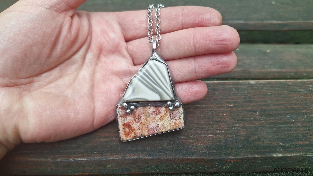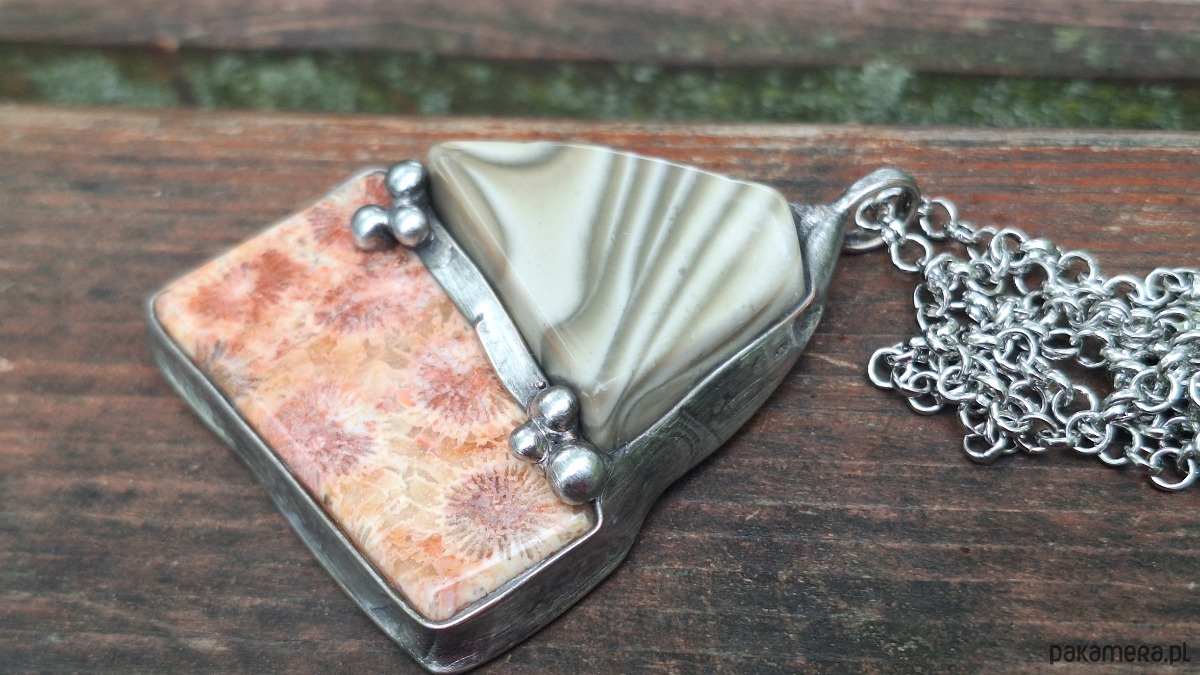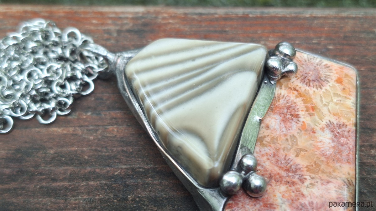 Wisiorek wykonany z miedzi, cyny, koralowca i krzemienia pasiastego. Wymiary ok. 5.5 na 4 cm. Zawieszony na łańcuszku o długości ok. 50 cm.
