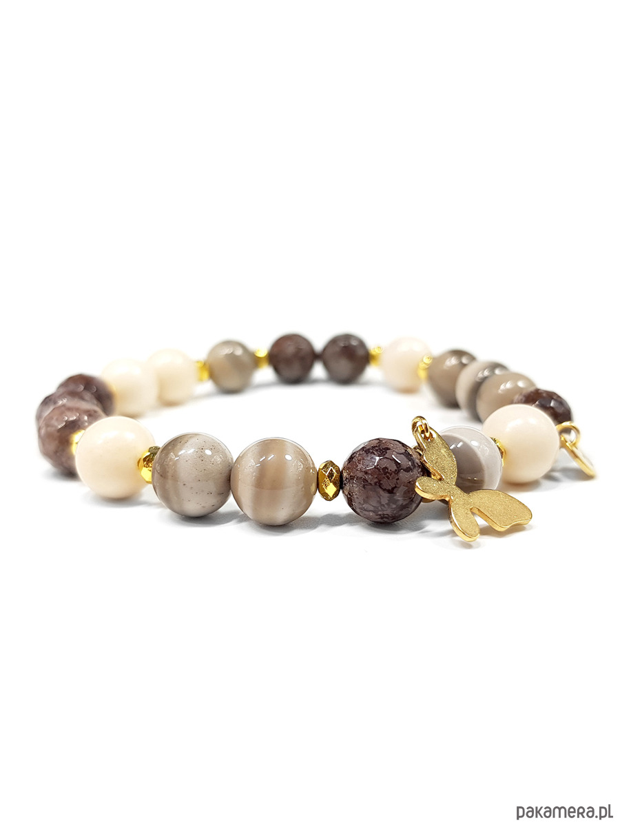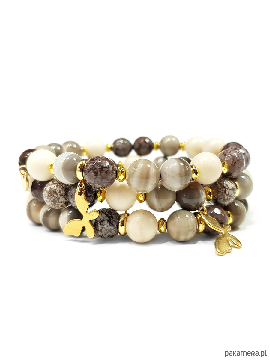 Bransoletka wykonana z kamieni naturalnych - krzemienia pasiastego, brązowego obsydianu śnieżnego, kamienia rzecznego i hematytu oraz mocnej, silikonowej gumki i elementów z pozłacanej stali chirurgicznej.