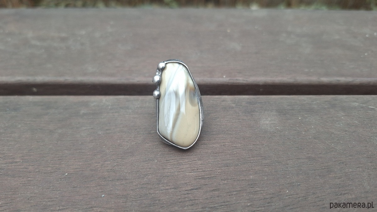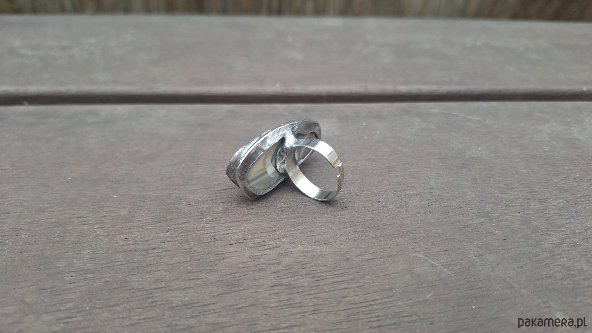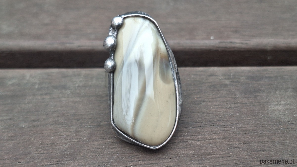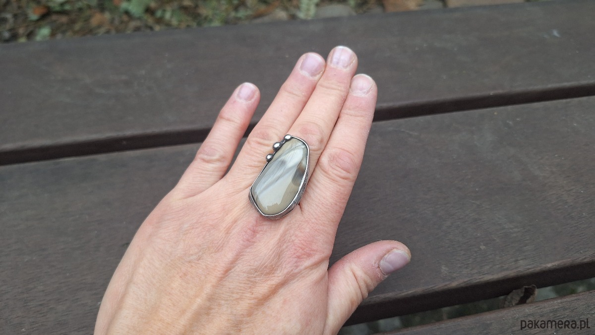 Pierścionek wykonany z miedzi, cyny i krzemienia pasiastego. Wymiary ok. 3.5 na 2 cm. Regulowany. Nie jest ciężki.
