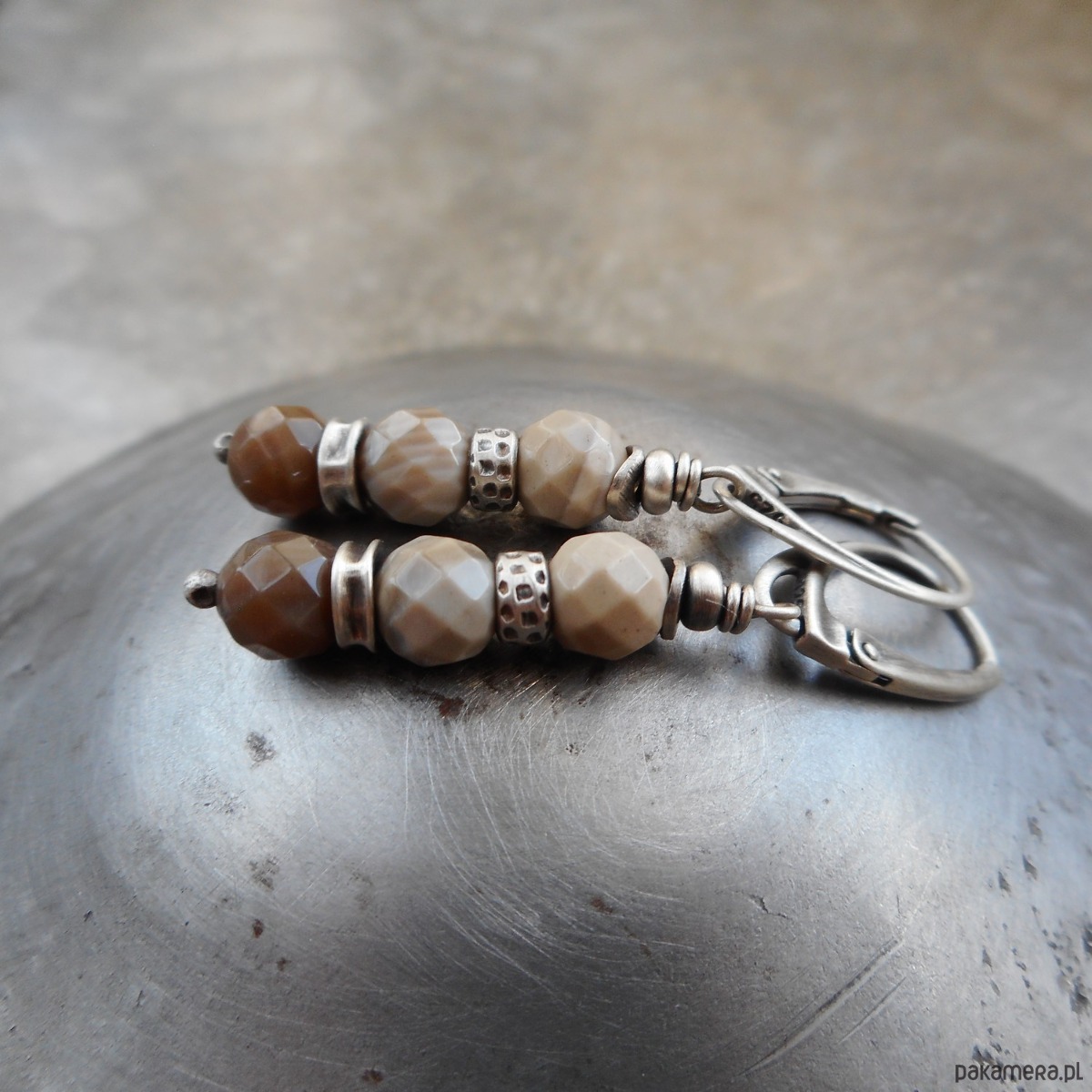 Wyjątkowe, proste w formie kolczyki z kamieni naturalnych i szlachetnego srebra; klasyczne i eleganckie, z pięknym beżowo-brązowym krzemieniem pasiastym nazywanym polskim diamentem. Do kompletu polecam bransoletkę dostępną w mojej galerii.