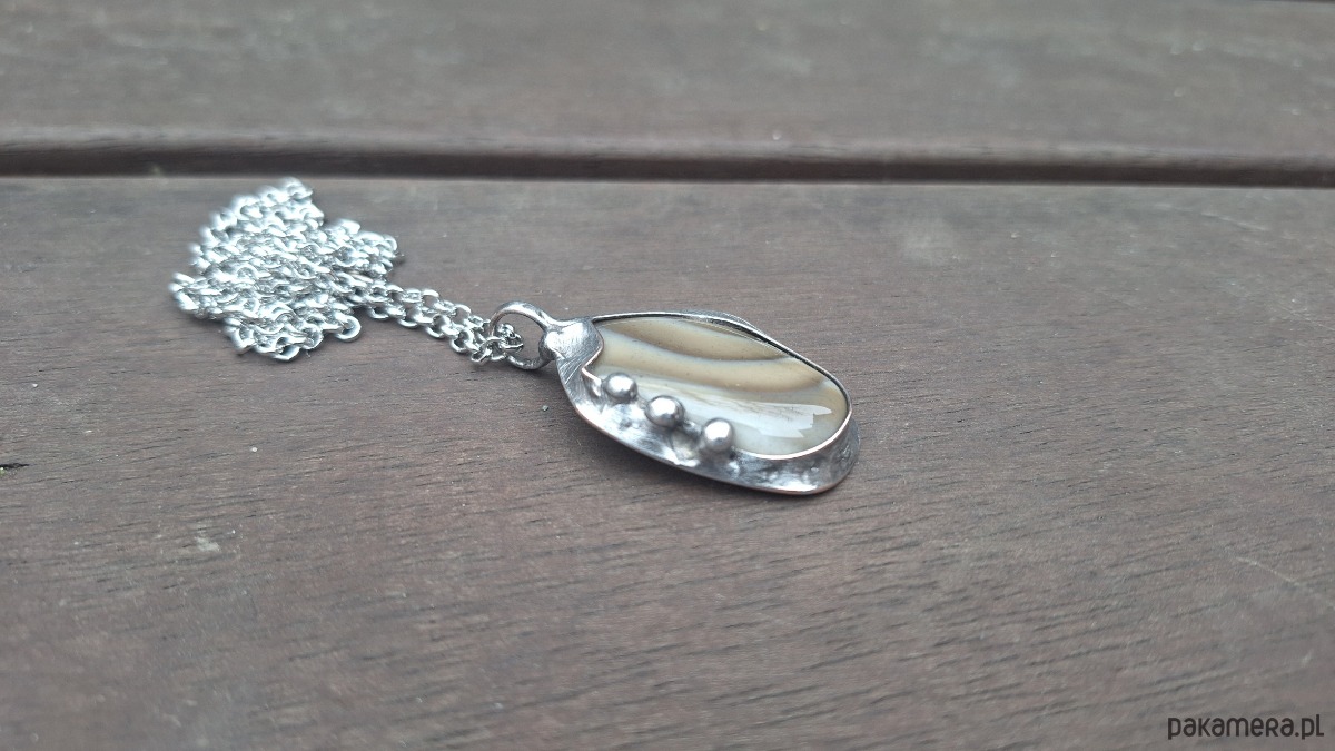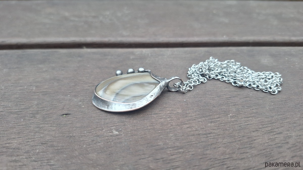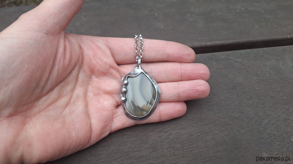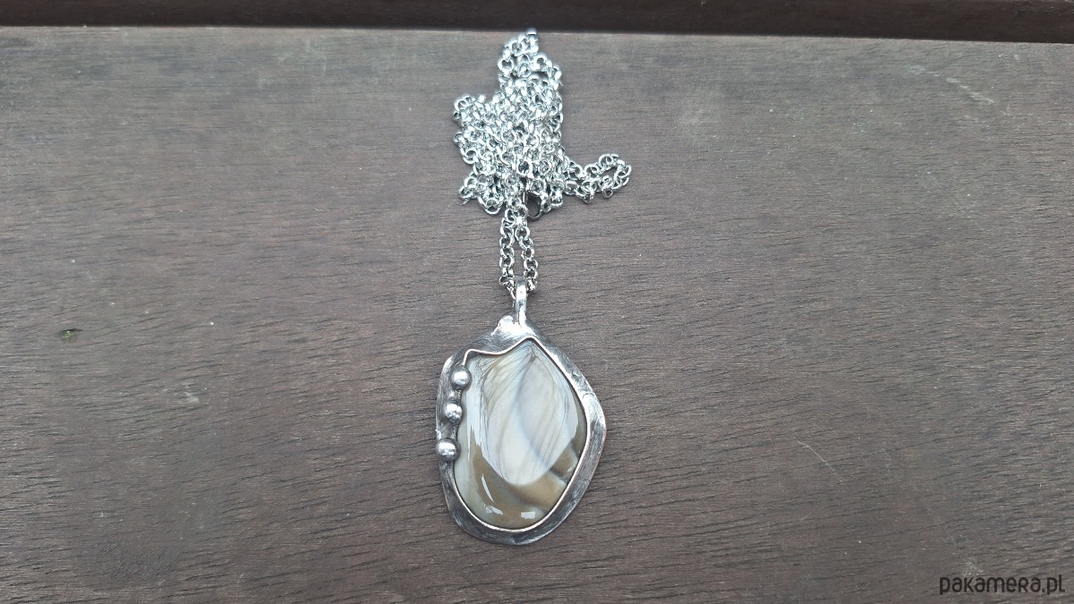Wisiorek wykonany z miedzi, cyny i krzemienia pasiastego. Wymiary ok. 4 na 3 cm. Zawieszony na łańcuszku o długości ok. 50 cm.