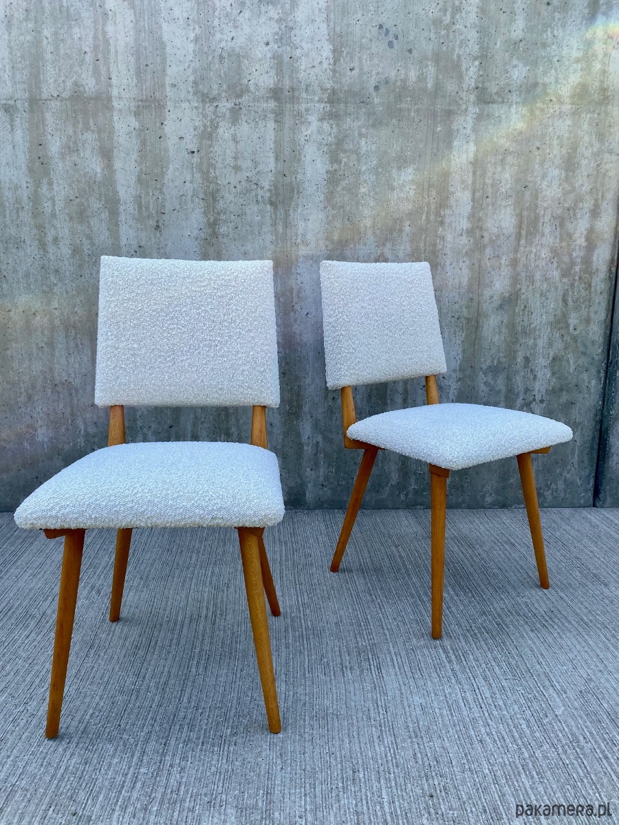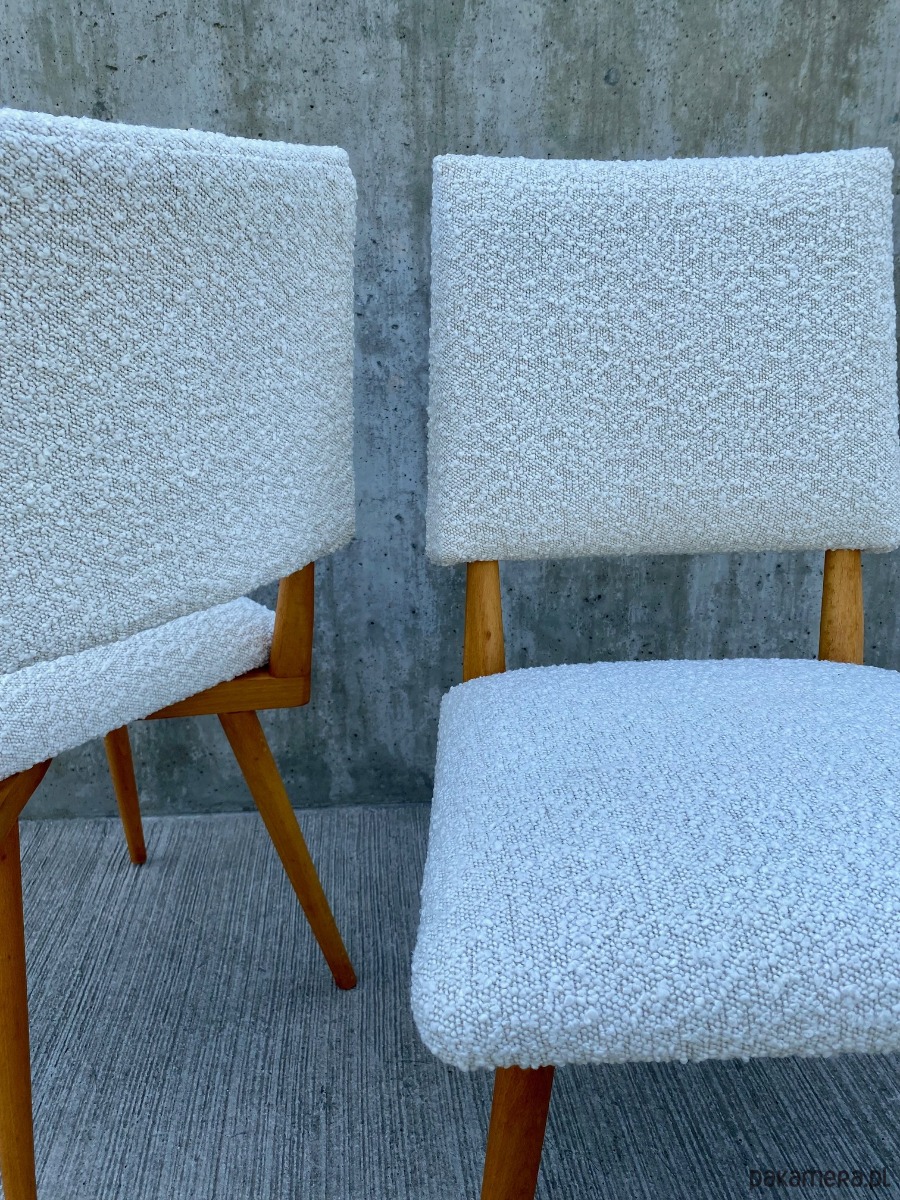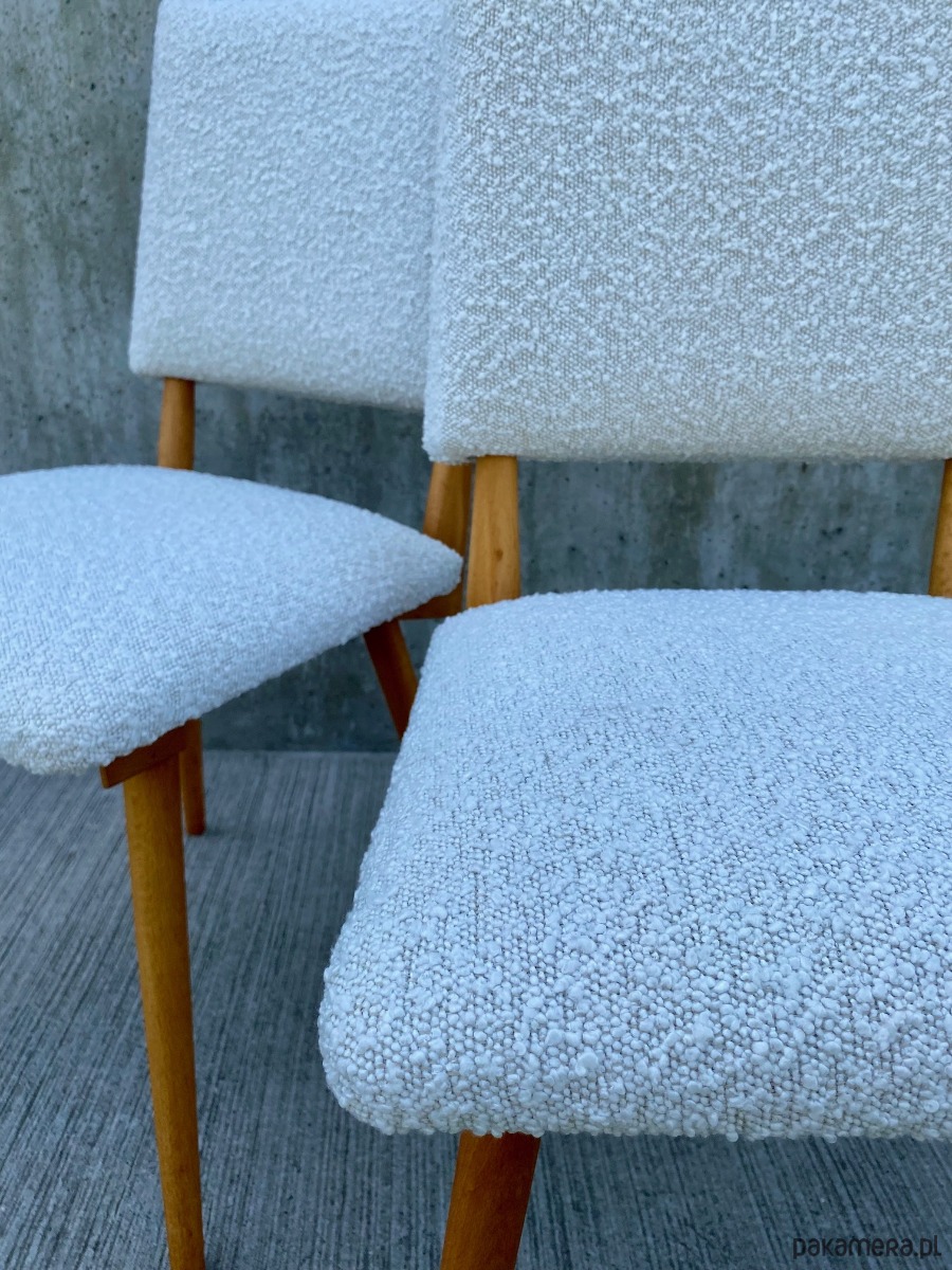 wygodne, ergonomiczne krzesła o ciekawej, dynamicznej formie, na oparciach i siedziskach wysokiej jakości tkanina boucle, pod tkaniną sprężyny faliste oraz mata kokosowa