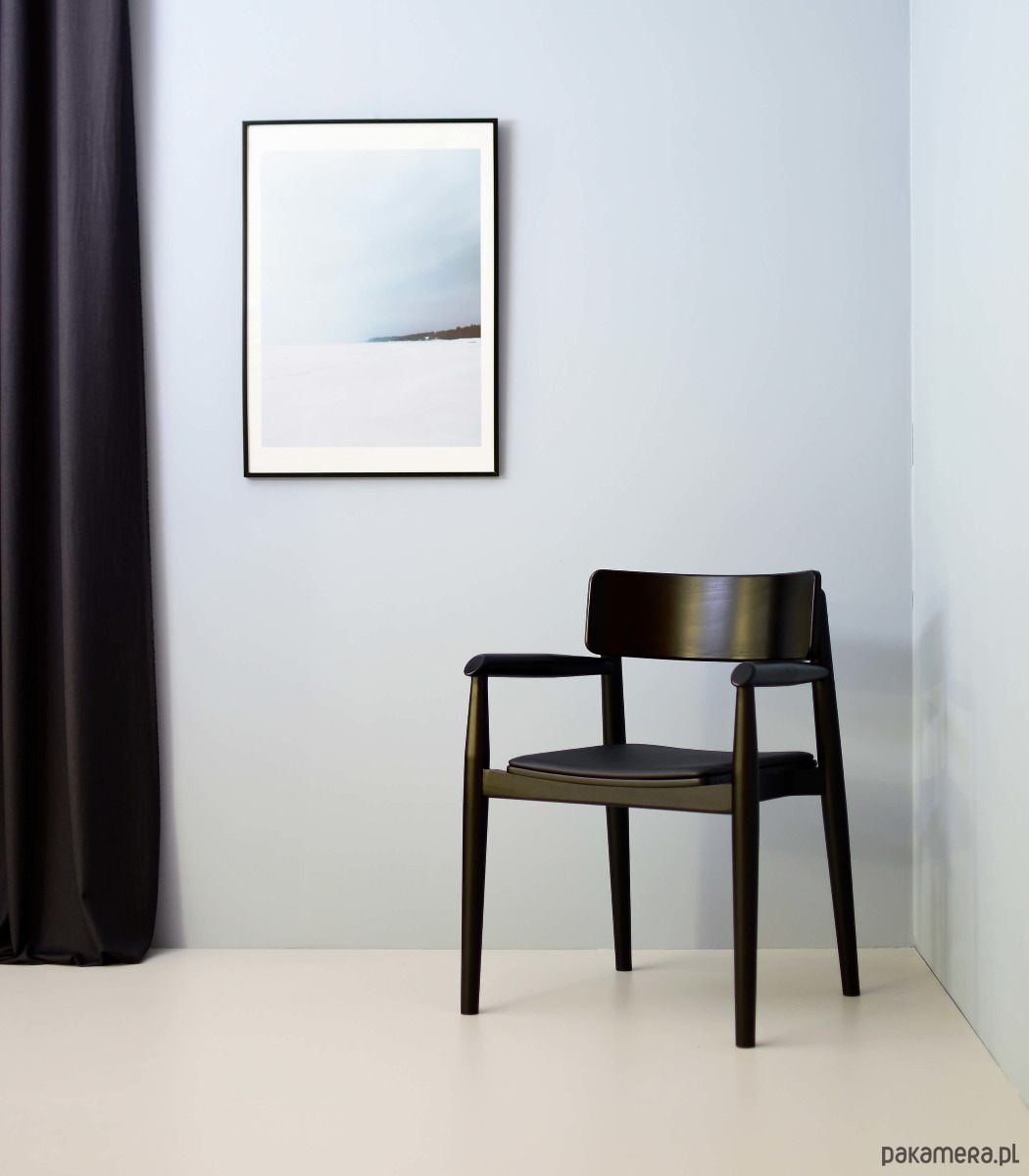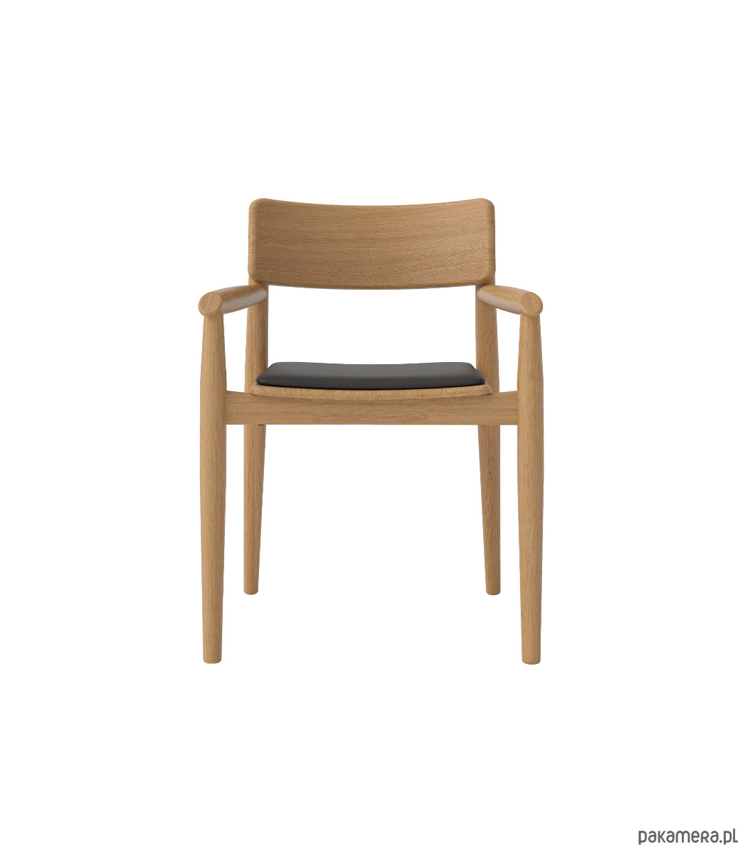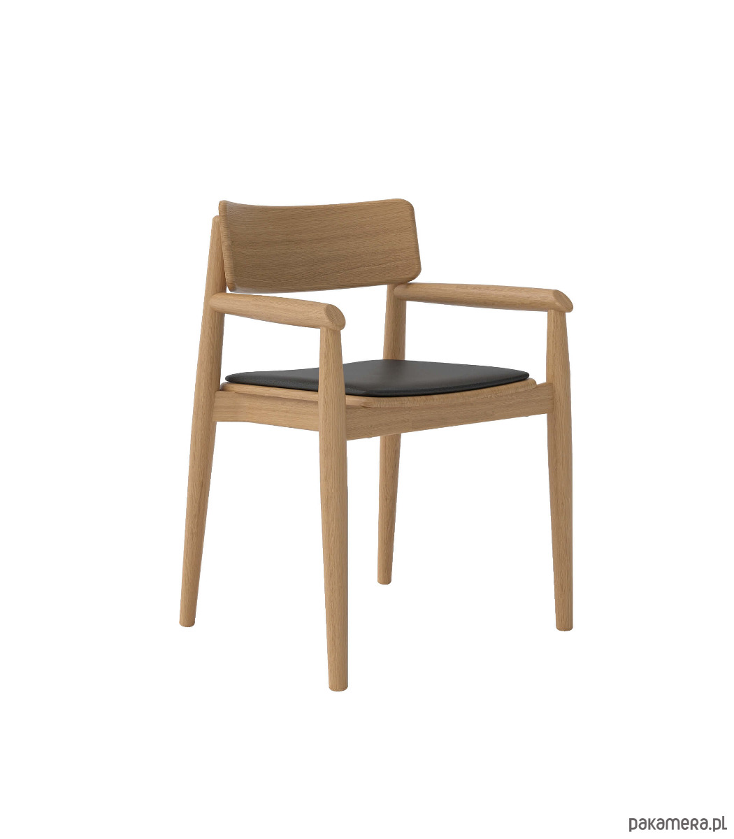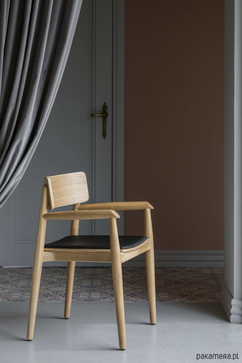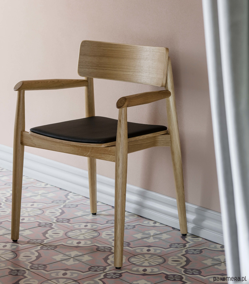 Piękne, dębowe krzesło w stylu skandynawskim o ponadczasowej formie. Jego uniwersalny design pozwala na zastosowanie w nowoczesnych wnętrzach o dowolnej stylistyce. Krzesło jest ciężkie i stabilne. Oparcie krzesła znajduje się nisko, ale zapewnia bardzo dobry komfort siedzenia. To drewniane krzesło z podłokietnikami pokryte jest tkaniną typu ekoskóra marki Davis z kolekcji MADRYT, przeznaczoną do intensywnego użytkowania (50.000 cykli).