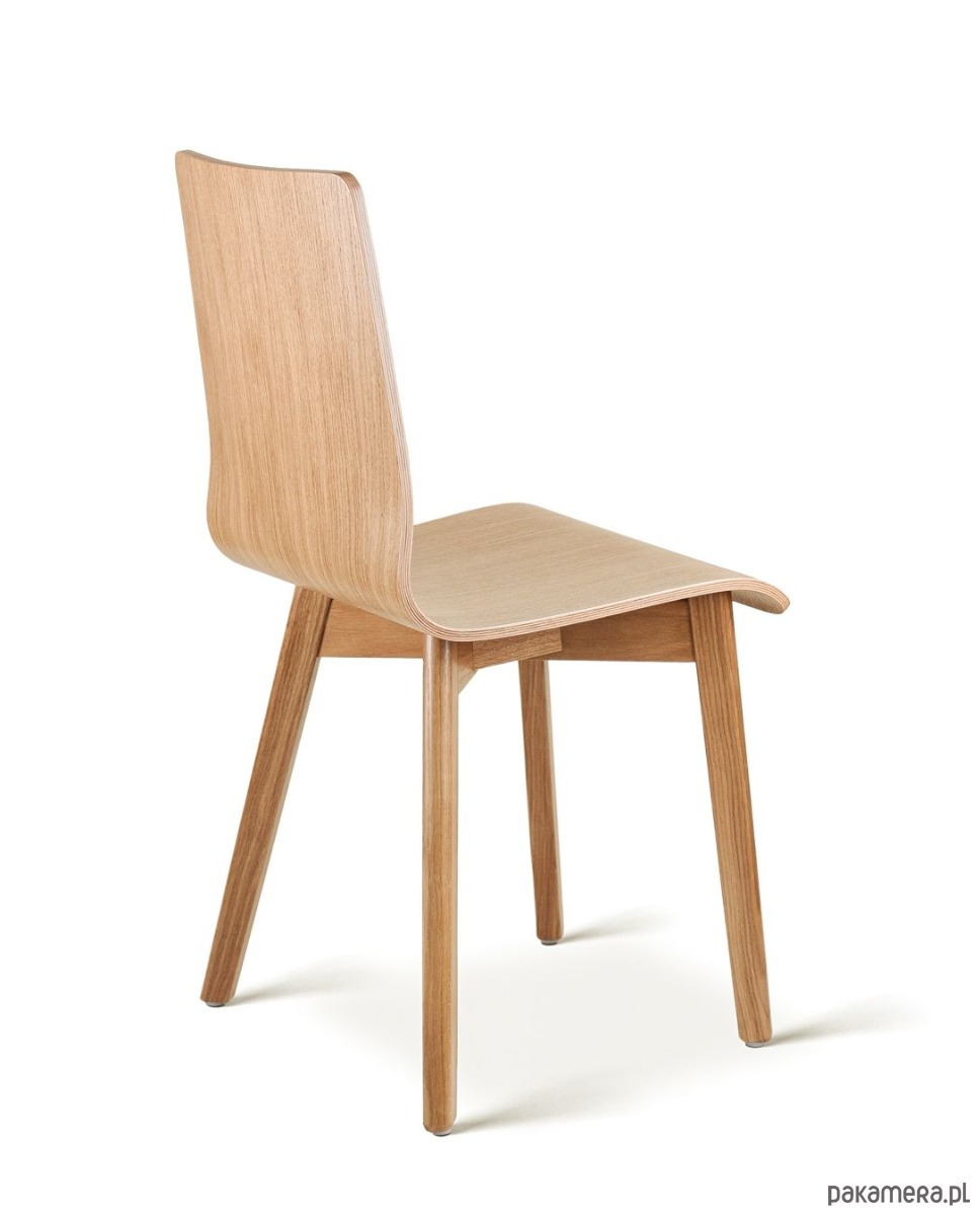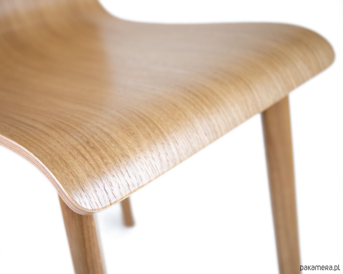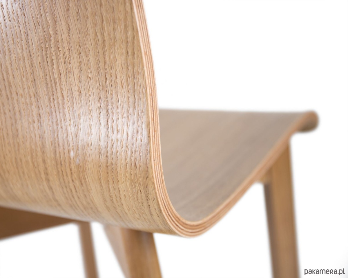 Naturalny fornir dębowy i solidne nogi z litego drewna nadają krzesłu lekkości wizualnej przy zachowaniu stabilności. Brak tapicerki czyni je wyjątkowo praktycznym – łatwym w pielęgnacji i odpornym na codzienne użytkowanie.