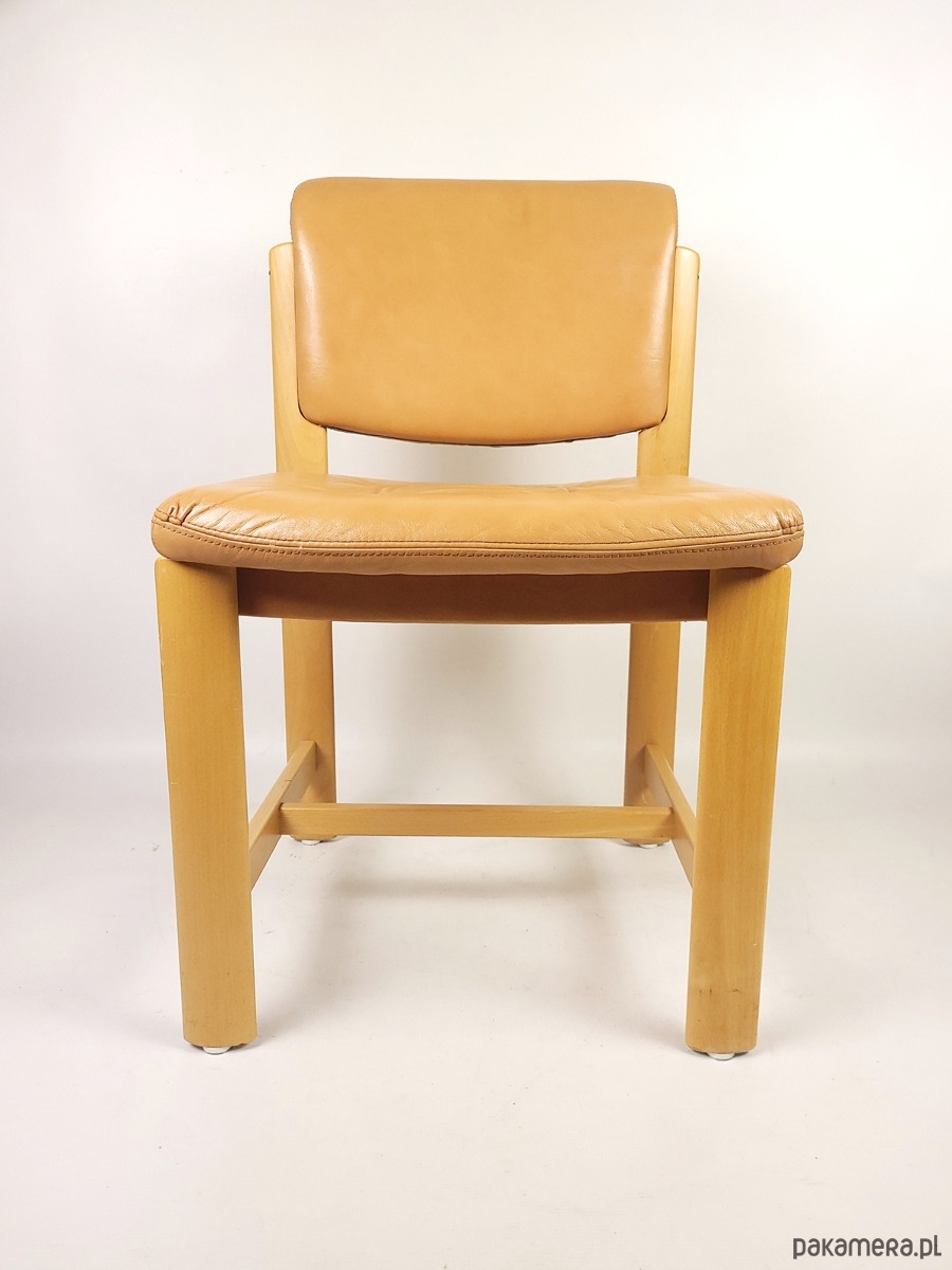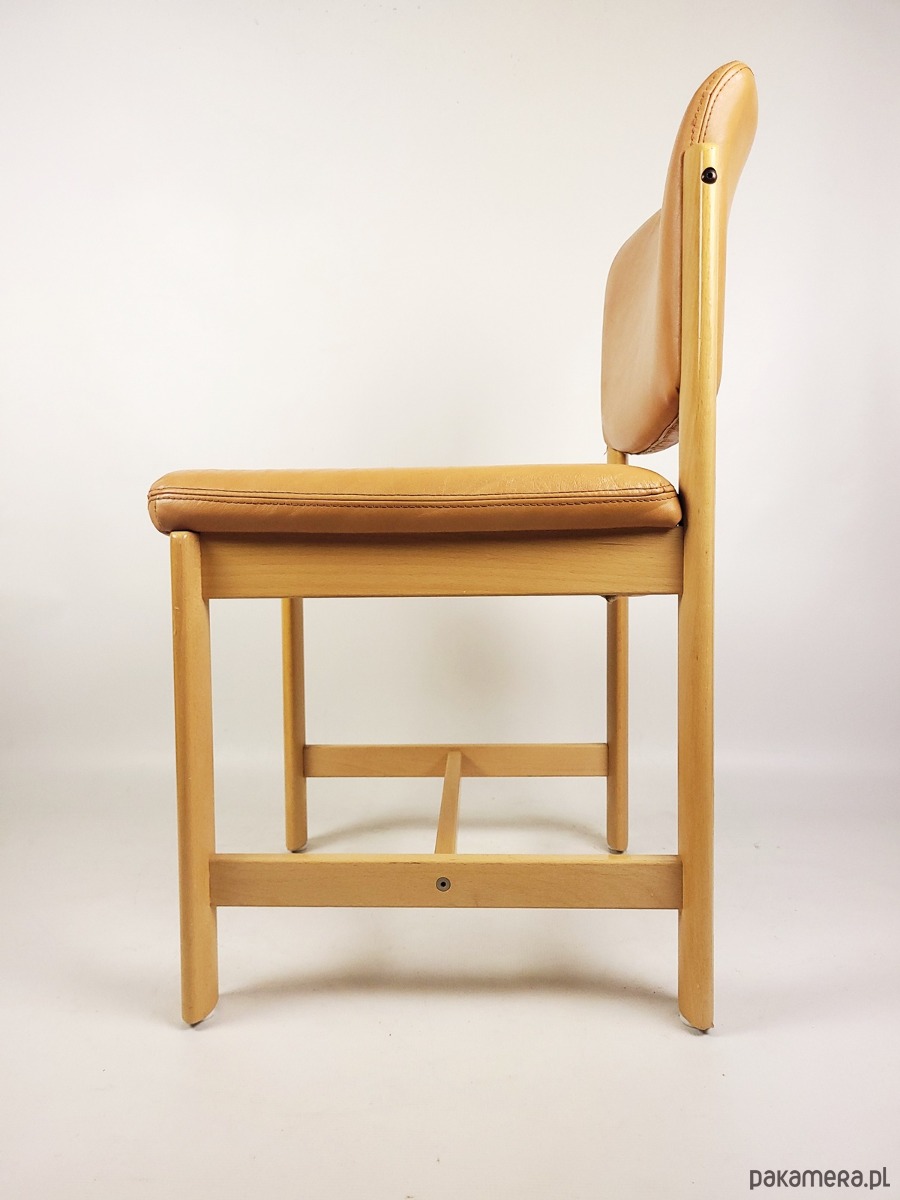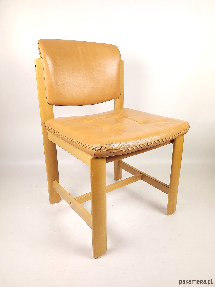 Krzesło duńskie marki Ulferis z 70. o prostej, modernistycznej linii. Jasna, drewniana konstrukcja zestawiona z tapicerowanym skórzanym siedziskiem i oparciem w ciepłym, miodowym odcieniu tworzy ponadczasowy, skandynawski charakter.