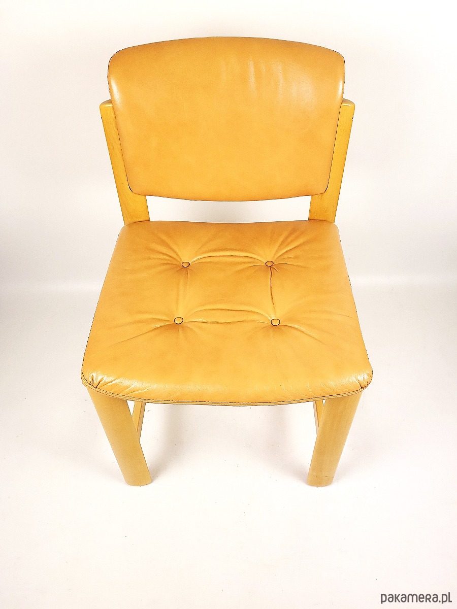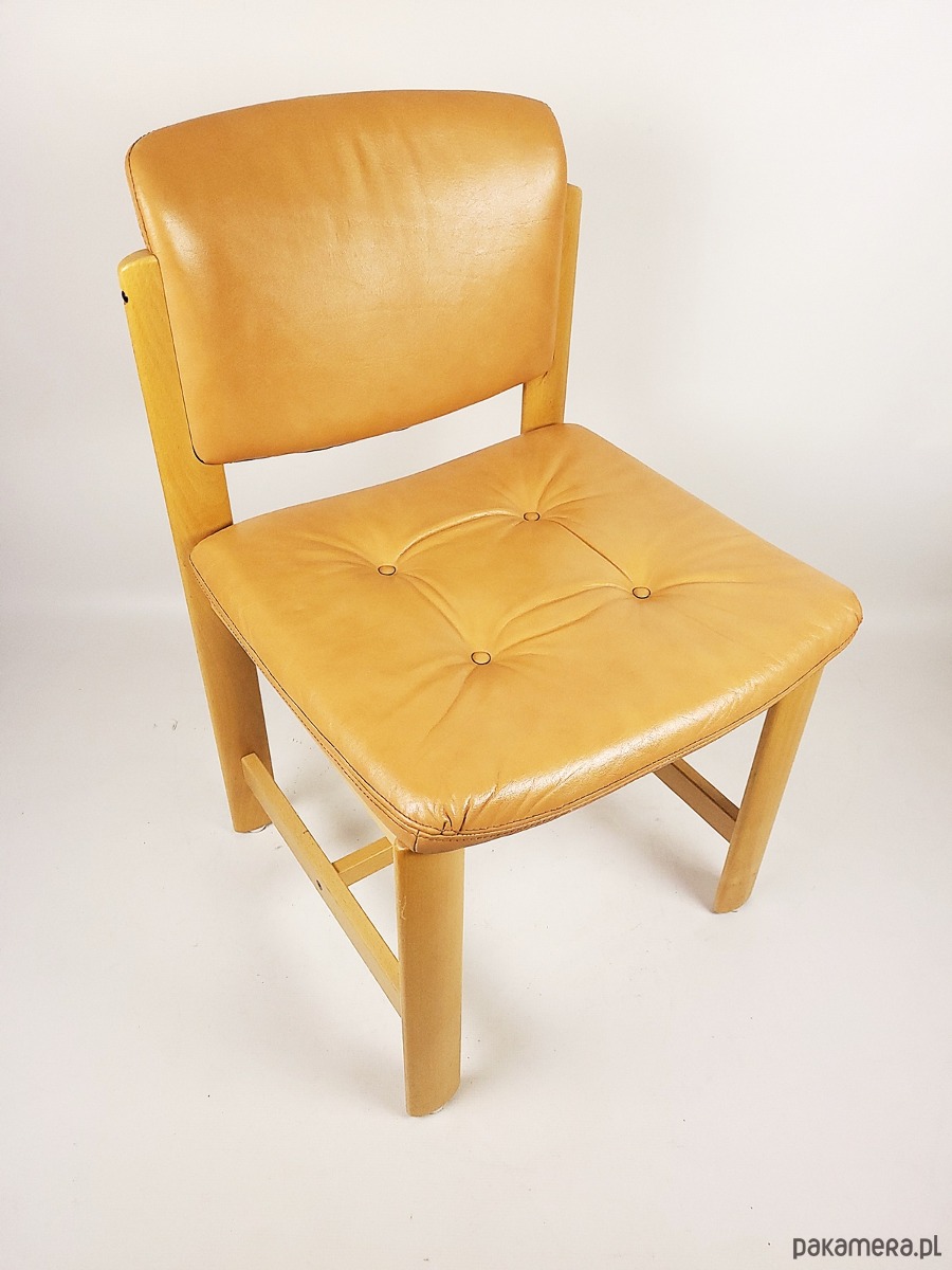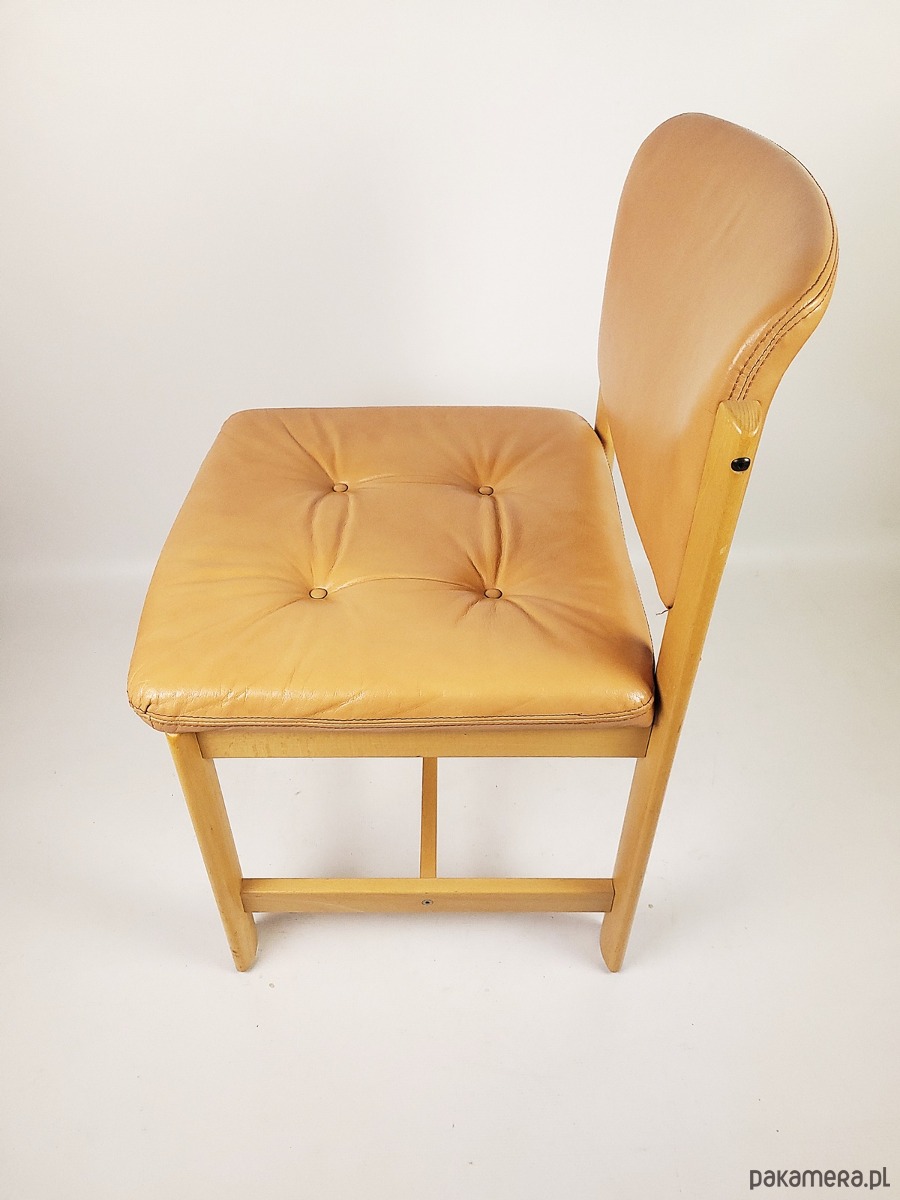 Krzesło duńskie marki Ulferis z 70. o prostej, modernistycznej linii. Jasna, drewniana konstrukcja zestawiona z tapicerowanym skórzanym siedziskiem i oparciem w ciepłym, miodowym odcieniu tworzy ponadczasowy, skandynawski charakter.