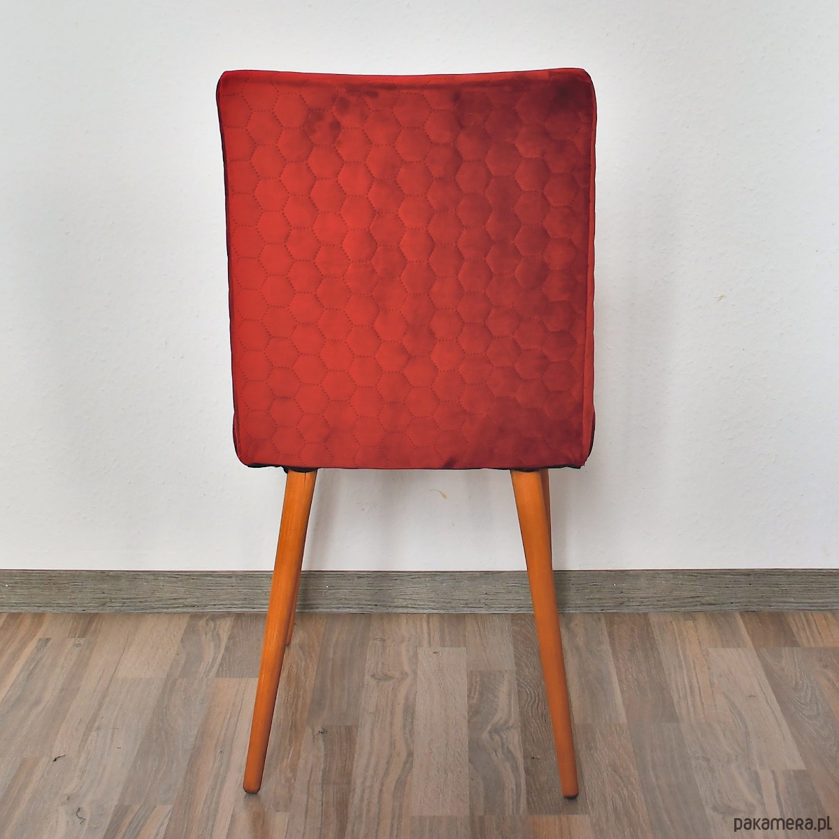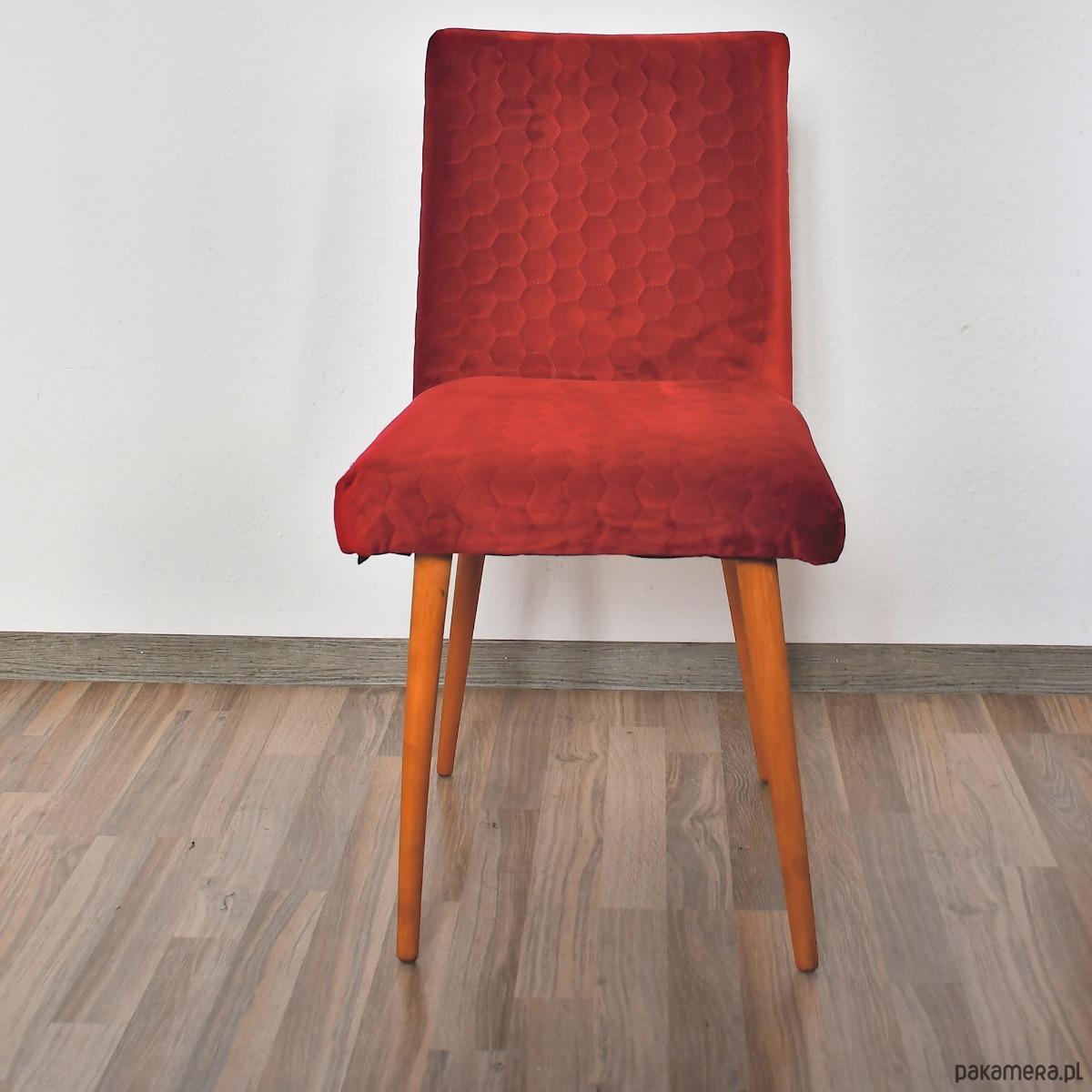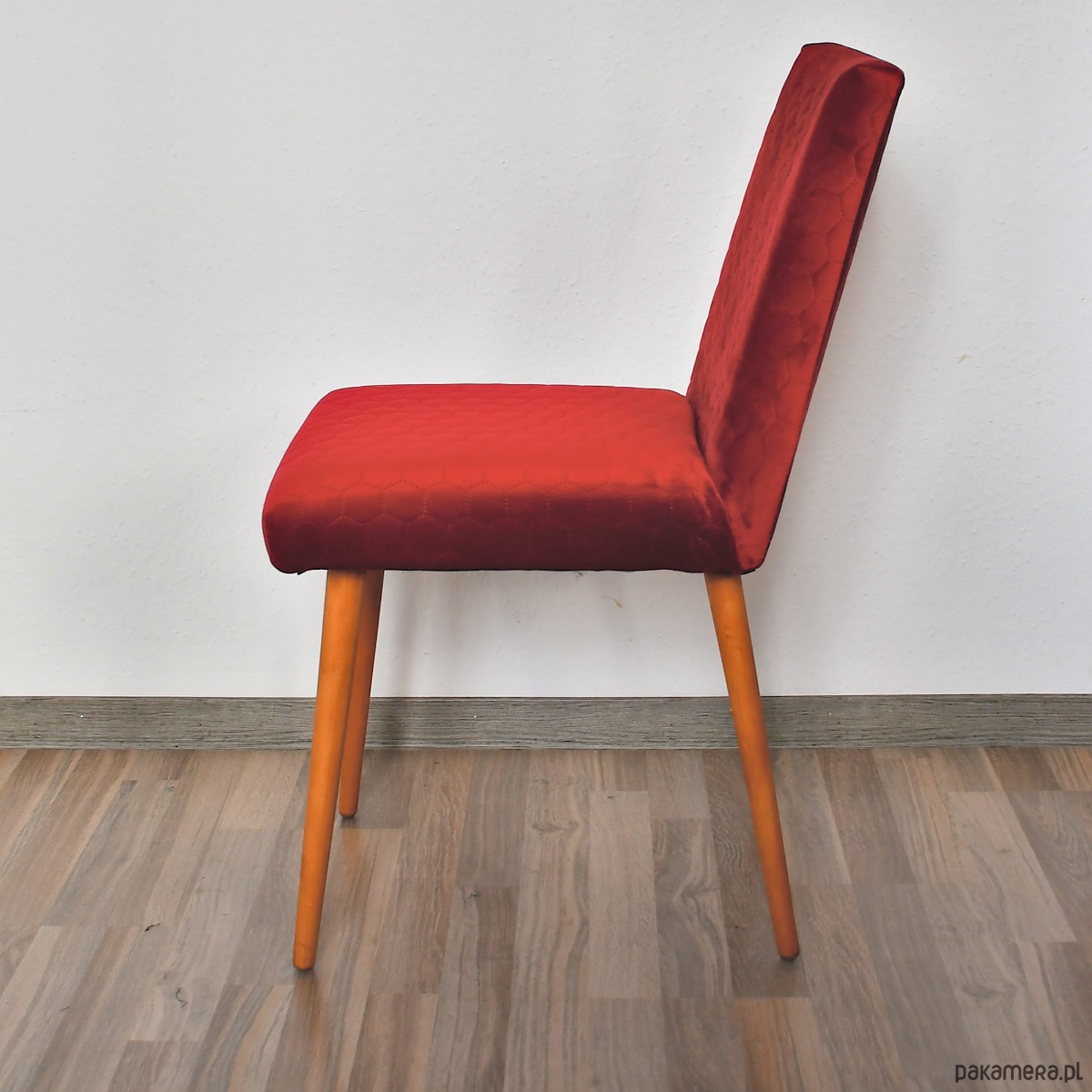 Krzesło po kompleksowej renowacji. Bukowe nóżki zostały oczyszczone, ponownie wklejone w ramę krzesła, pokryte bejcą w kolorze olchy oraz wykończone politurą szelakową. Część tapicerowana zyskała nowe wypełnienie, całość wykończona wysoko gatunkową tkaniną pikowaną. Siedzisko na sprężynach. Dostępnych mamy pięć sztuk takich krzeseł w różnych kolorach.