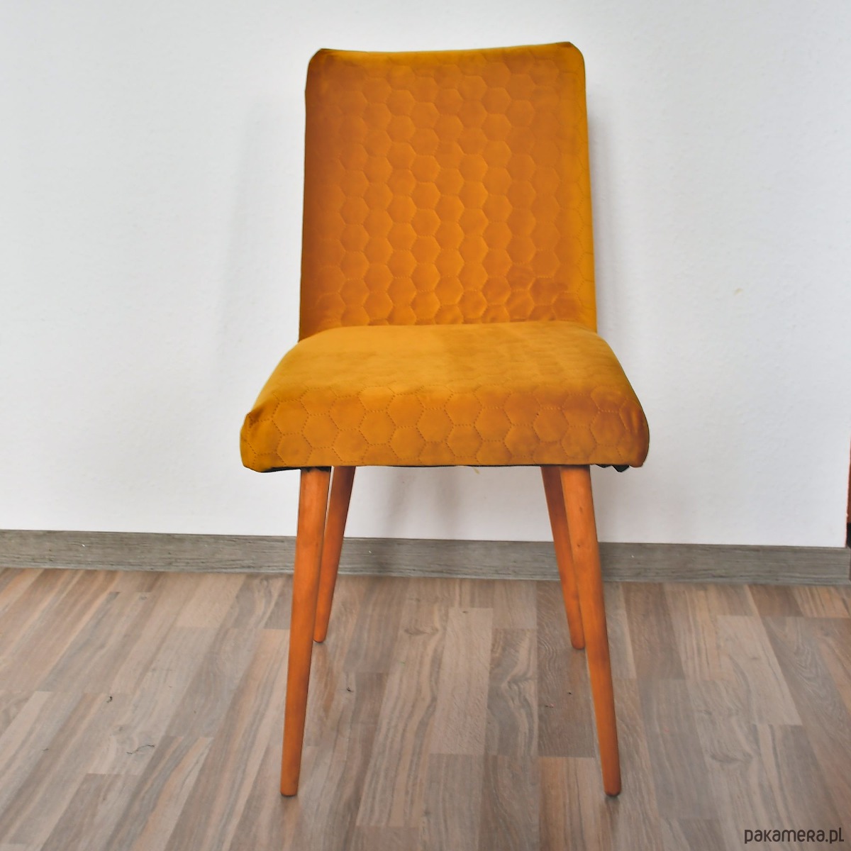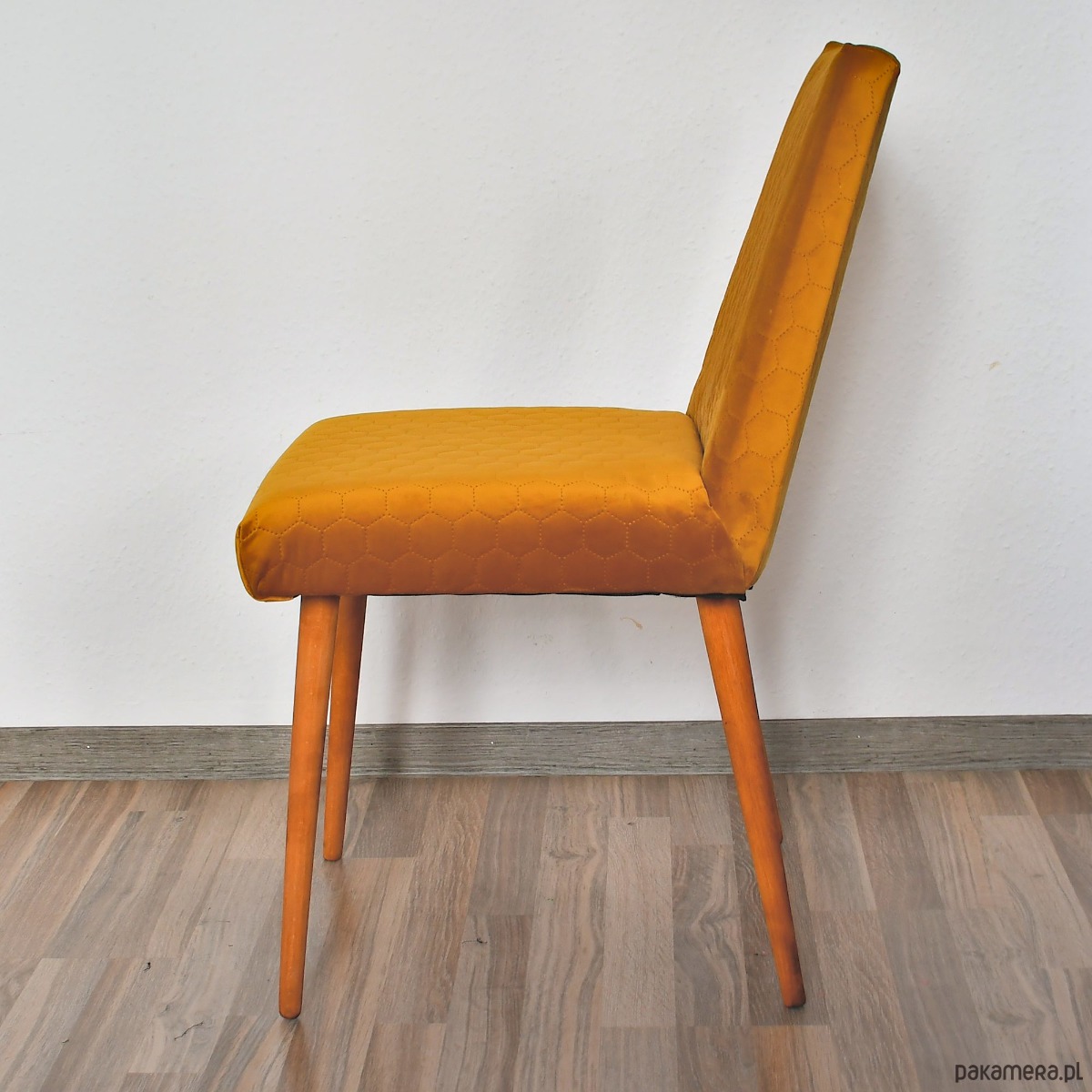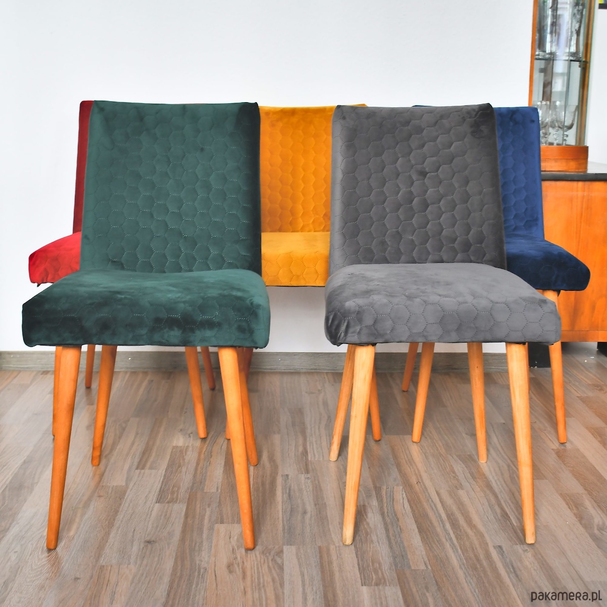Krzesło po kompleksowej renowacji. Bukowe nóżki zostały oczyszczone, ponownie wklejone w ramę krzesła, pokryte bejcą w kolorze olchy oraz wykończone politurą szelakową. Część tapicerowana zyskała nowe wypełnienie, całość wykończona wysoko gatunkową tkaniną pikowaną. Siedzisko na sprężynach. Dostępnych mamy pięć sztuk takich krzeseł w różnych kolorach.