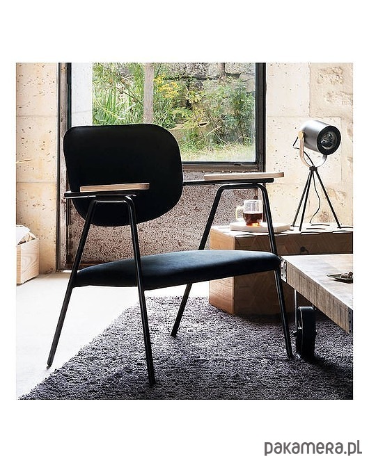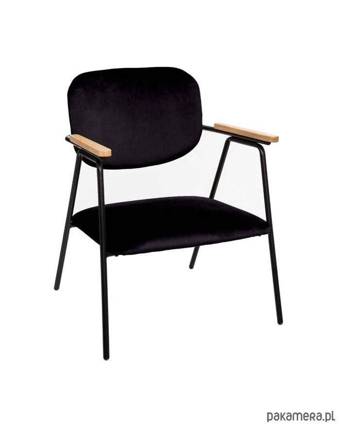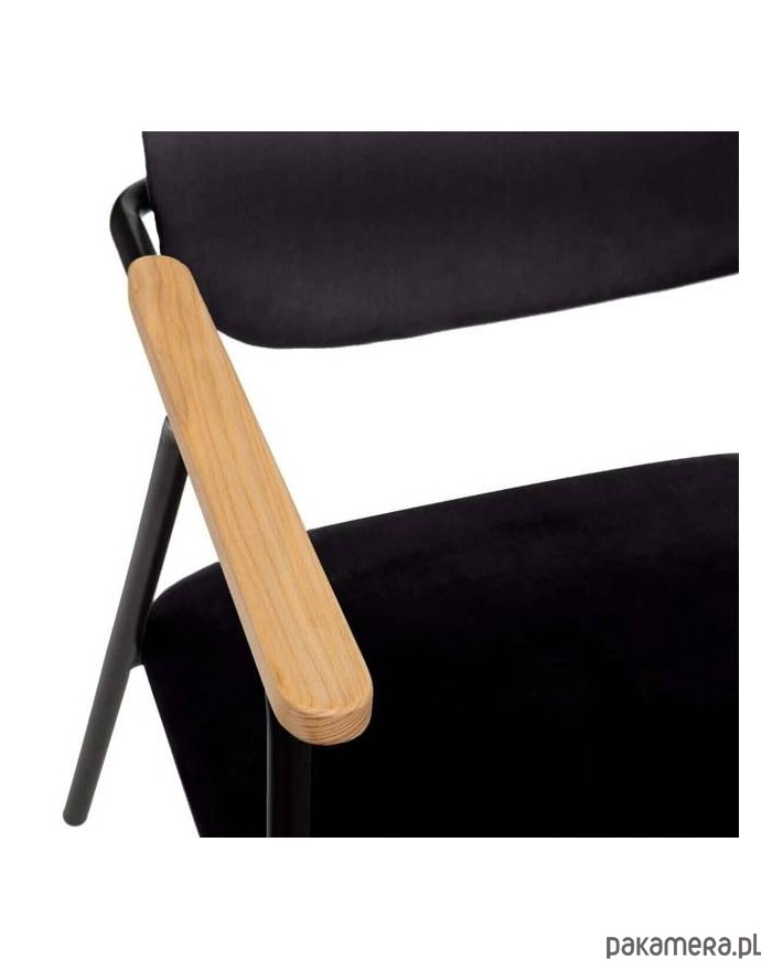 Tapicerowane welurem krzesło o metalowym stelażu. Wyposażone zostało w drewniane podłokietniki. Bardzo wygodny mebel, pasuje do wielu rodzajów wnętrz.