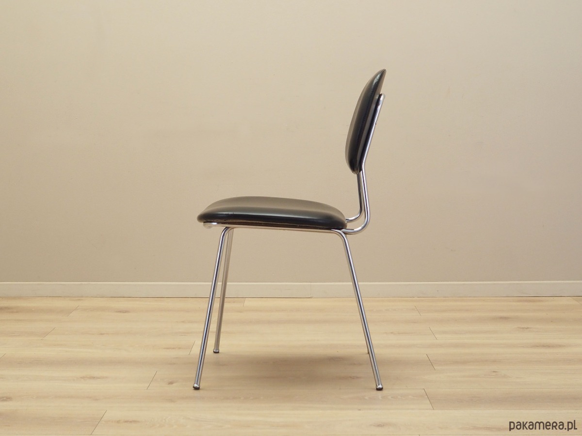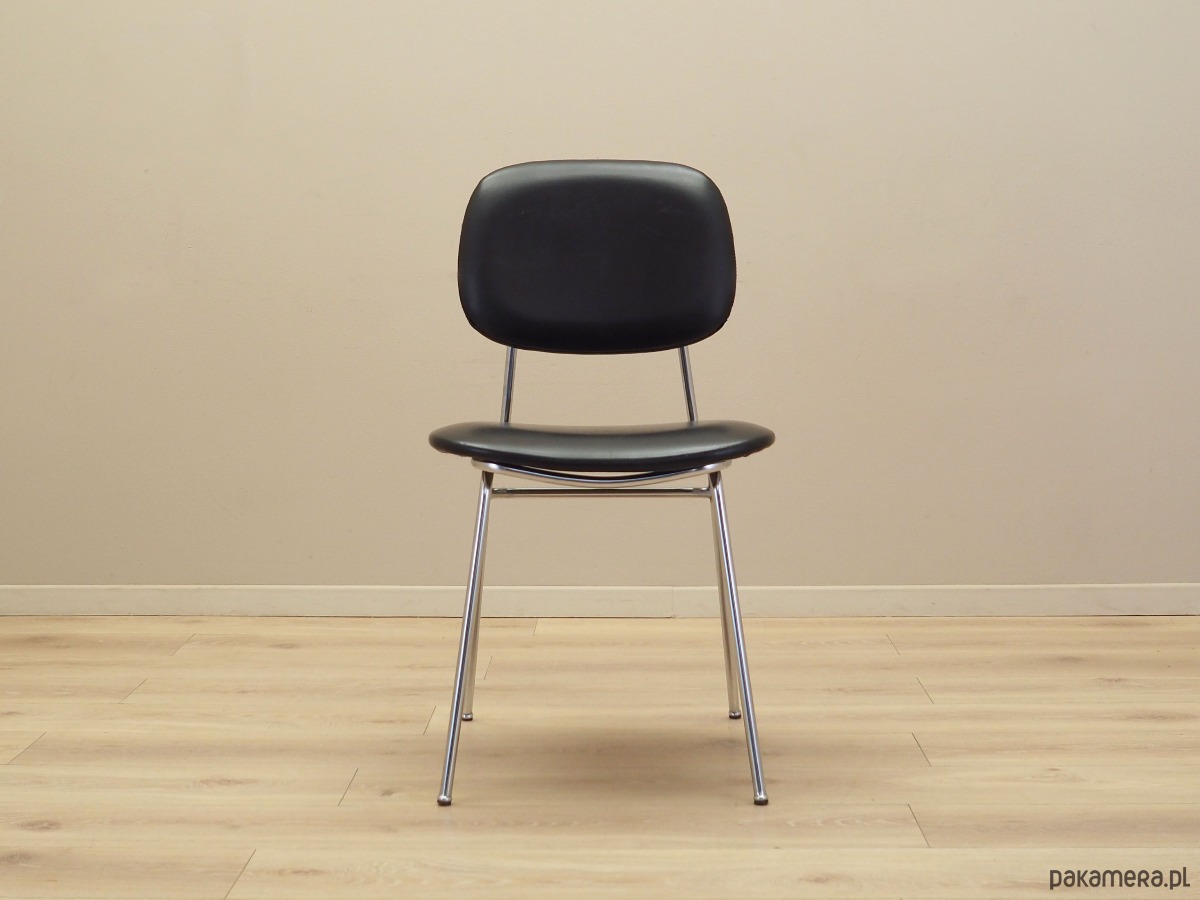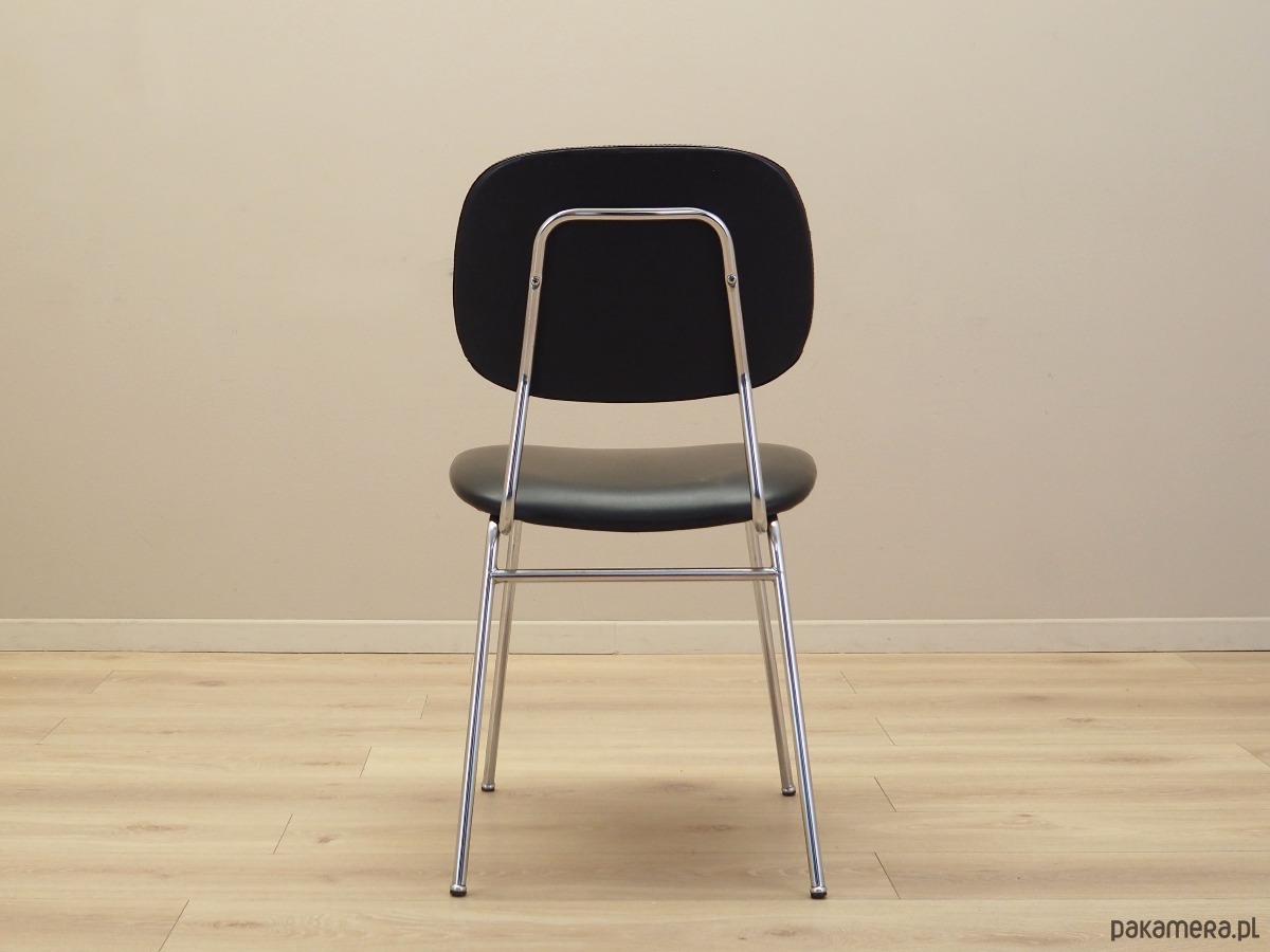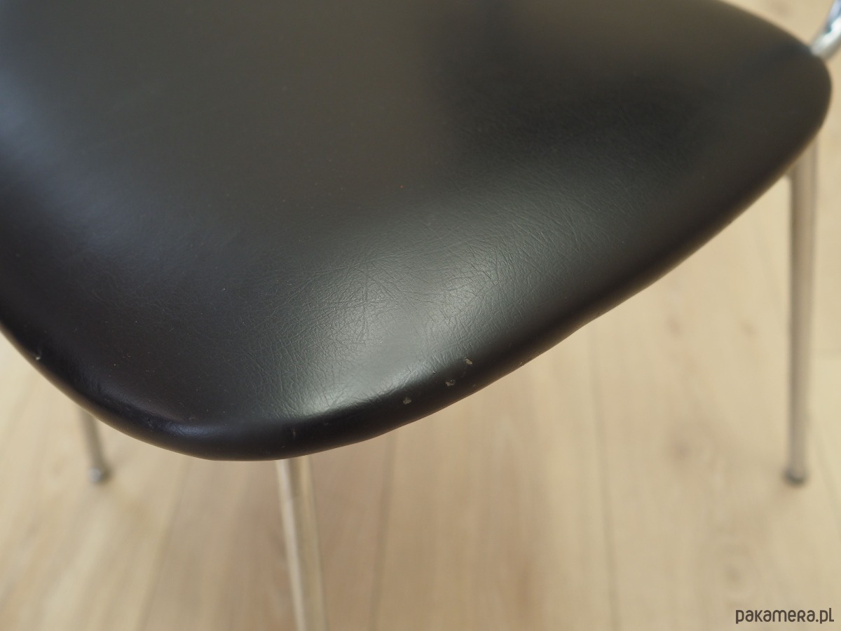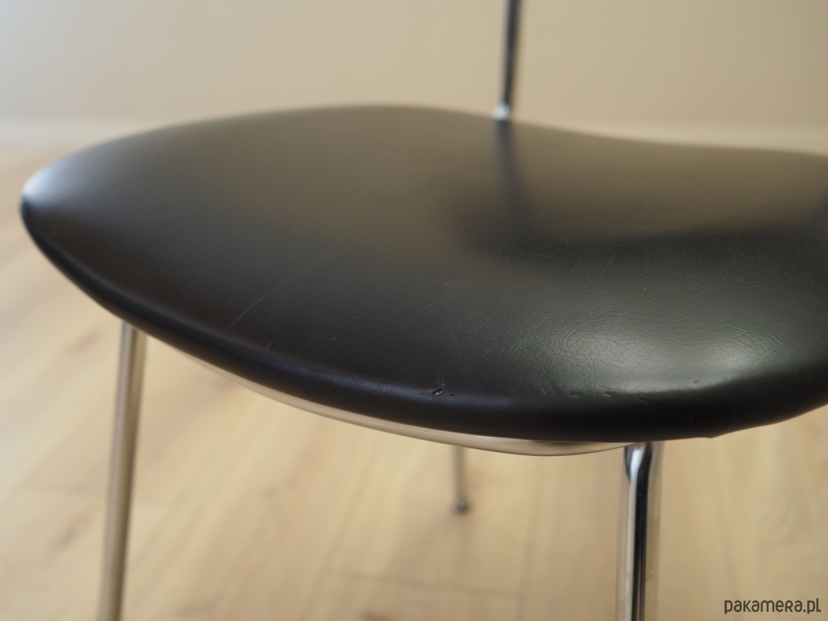 Konstrukcja wykonana z metalu. Krzesło posiada oryginalną tapicerkę. Tapicerka została wykonana w kolorze czarnym, wykorzystana została wysokogatunkowa ekoskóra.