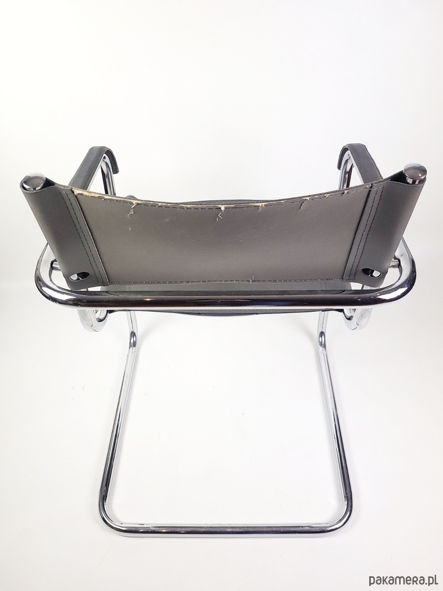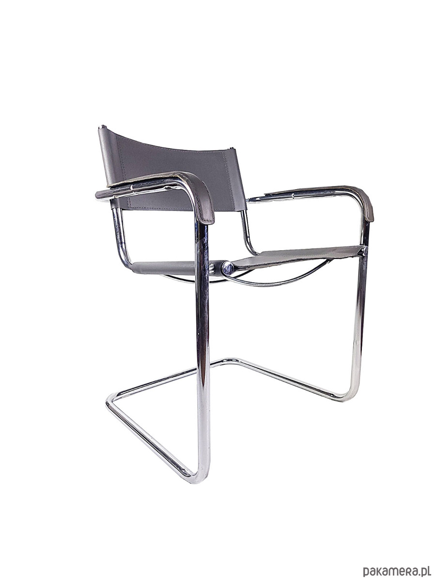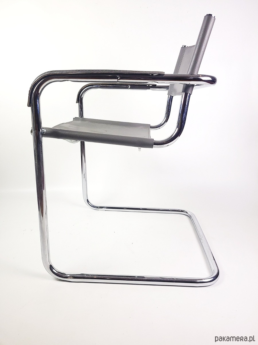 Krzesło proj. Martina Stam na chromowanej giętej konstrukcji z charakterystycznym siedziskiem oraz oparciem z Ekoskóry. Projekt inspirowany modernizmem XX wieku – lekki wizualnie, a jednocześnie solidny i wygodny. Naturalne ślady użytkowania podkreślają autentyczny charakter mebla. Idealne do wnętrz w stylu retro, loft lub mid-century. Krzesło posiada spękania widoczne na oparciu i pod siedziskiem. Dostępne 2 sztuki.