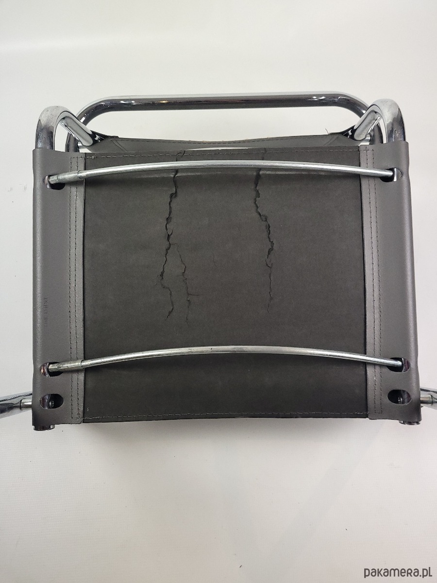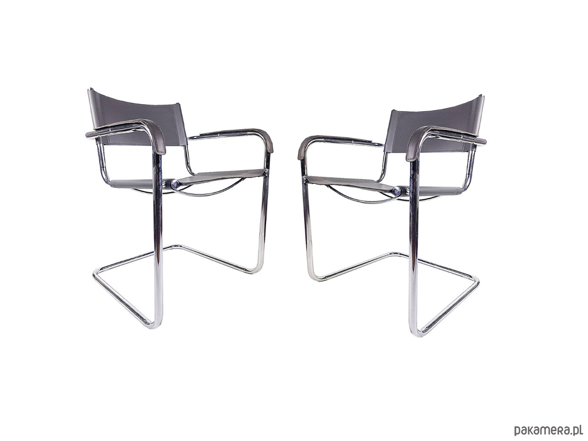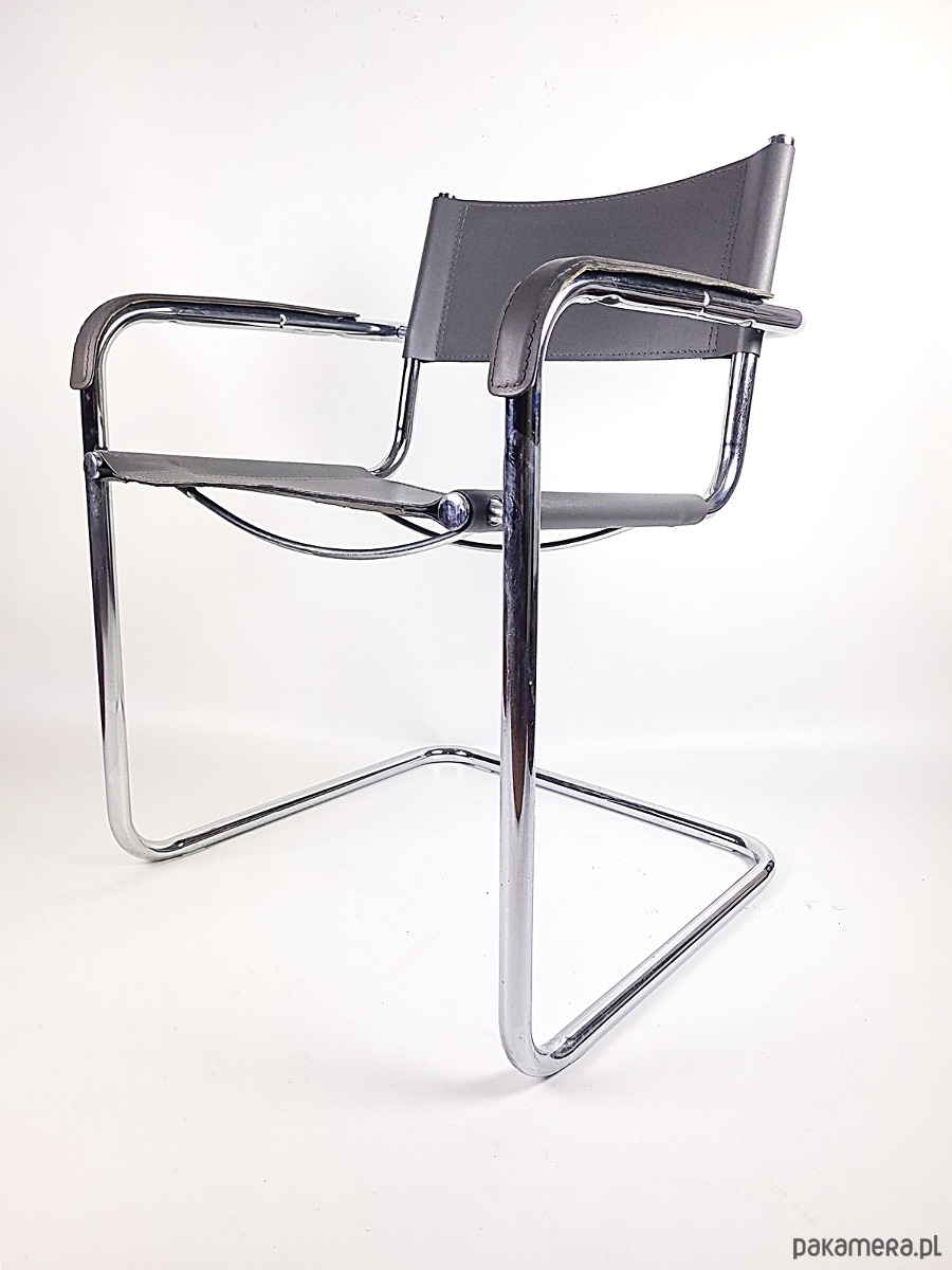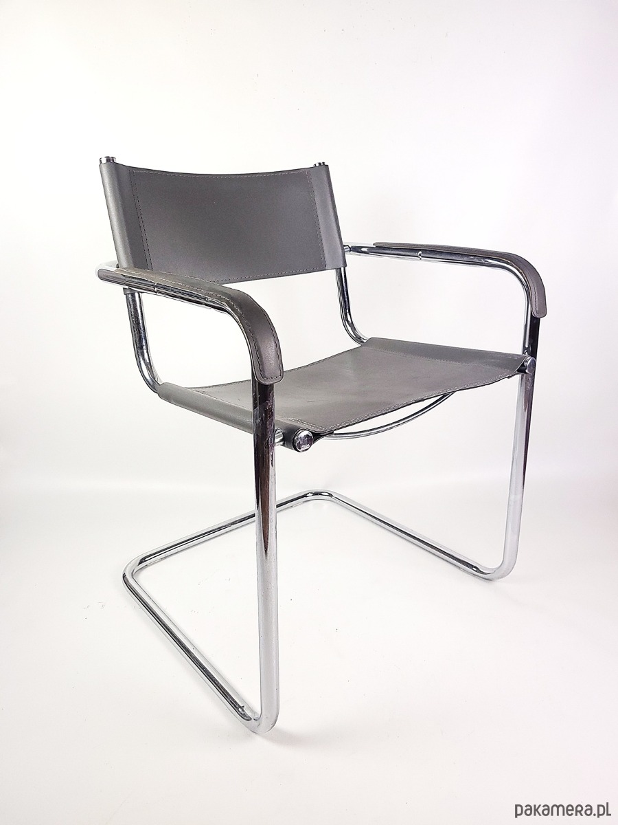 Krzesło proj. Martina Stam na chromowanej giętej konstrukcji z charakterystycznym siedziskiem oraz oparciem z Ekoskóry. Projekt inspirowany modernizmem XX wieku – lekki wizualnie, a jednocześnie solidny i wygodny. Naturalne ślady użytkowania podkreślają autentyczny charakter mebla. Idealne do wnętrz w stylu retro, loft lub mid-century. Krzesło posiada spękania widoczne na oparciu i pod siedziskiem. Dostępne 2 sztuki.