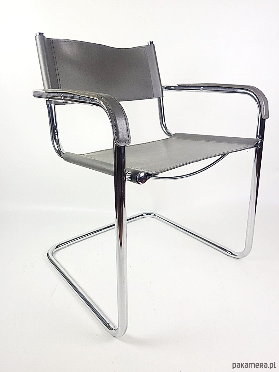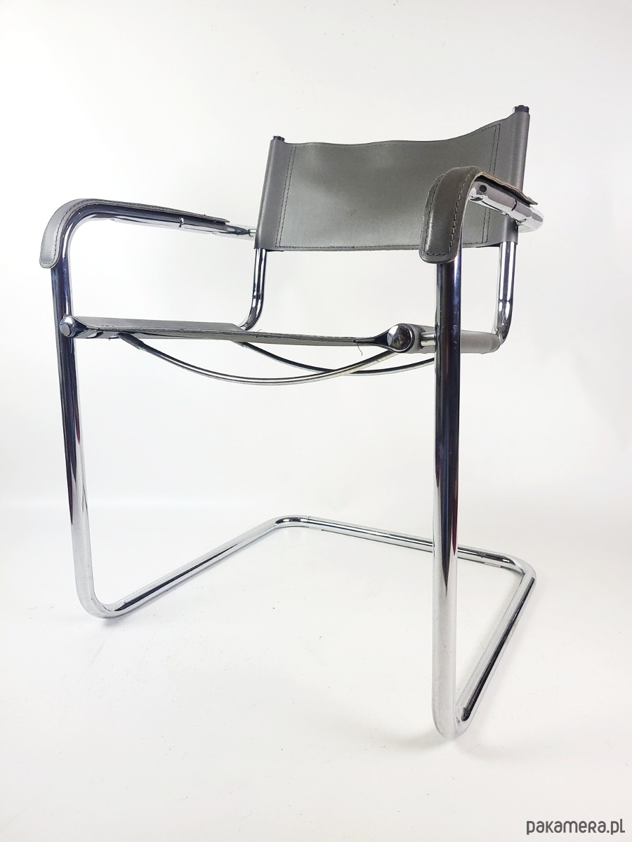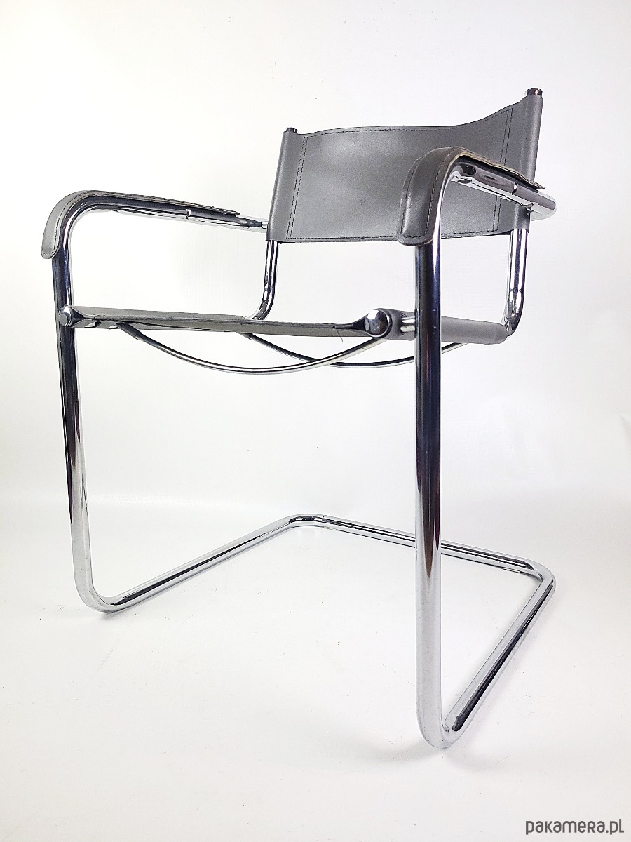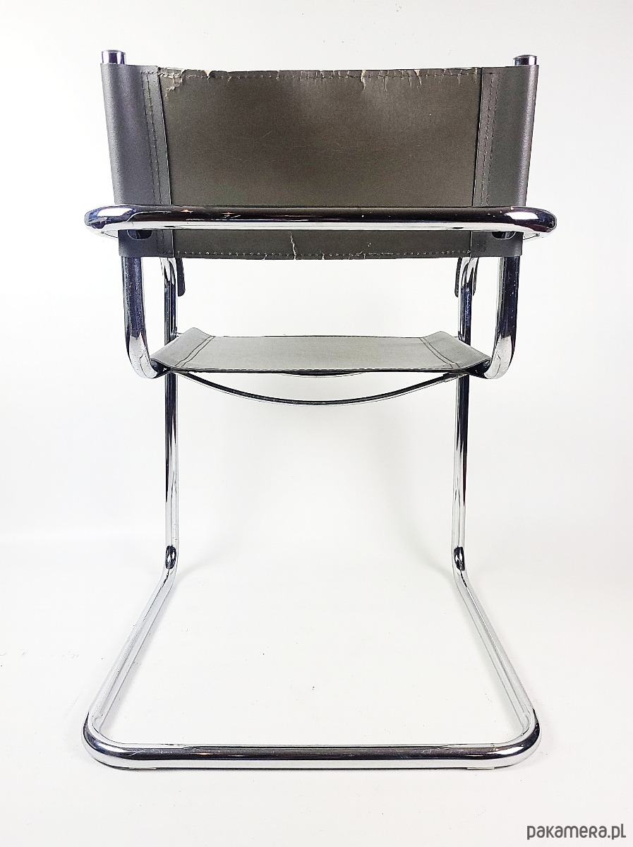Krzesło proj. Martina Stam na chromowanej giętej konstrukcji z charakterystycznym siedziskiem oraz oparciem z Ekoskóry. Projekt inspirowany modernizmem XX wieku – lekki wizualnie, a jednocześnie solidny i wygodny. Naturalne ślady użytkowania podkreślają autentyczny charakter mebla. Idealne do wnętrz w stylu retro, loft lub mid-century. Krzesło posiada spękania widoczne na oparciu i pod siedziskiem. Dostępne 2 sztuki.