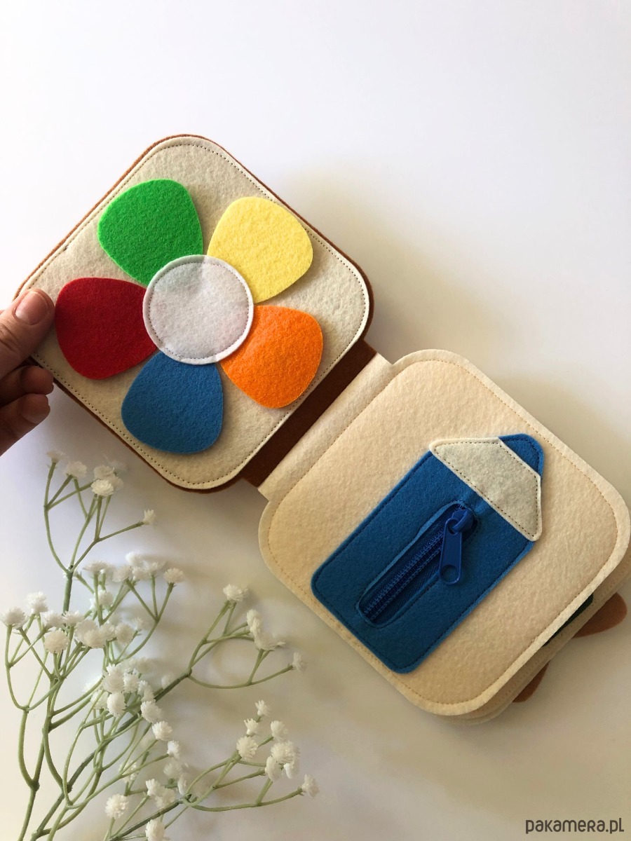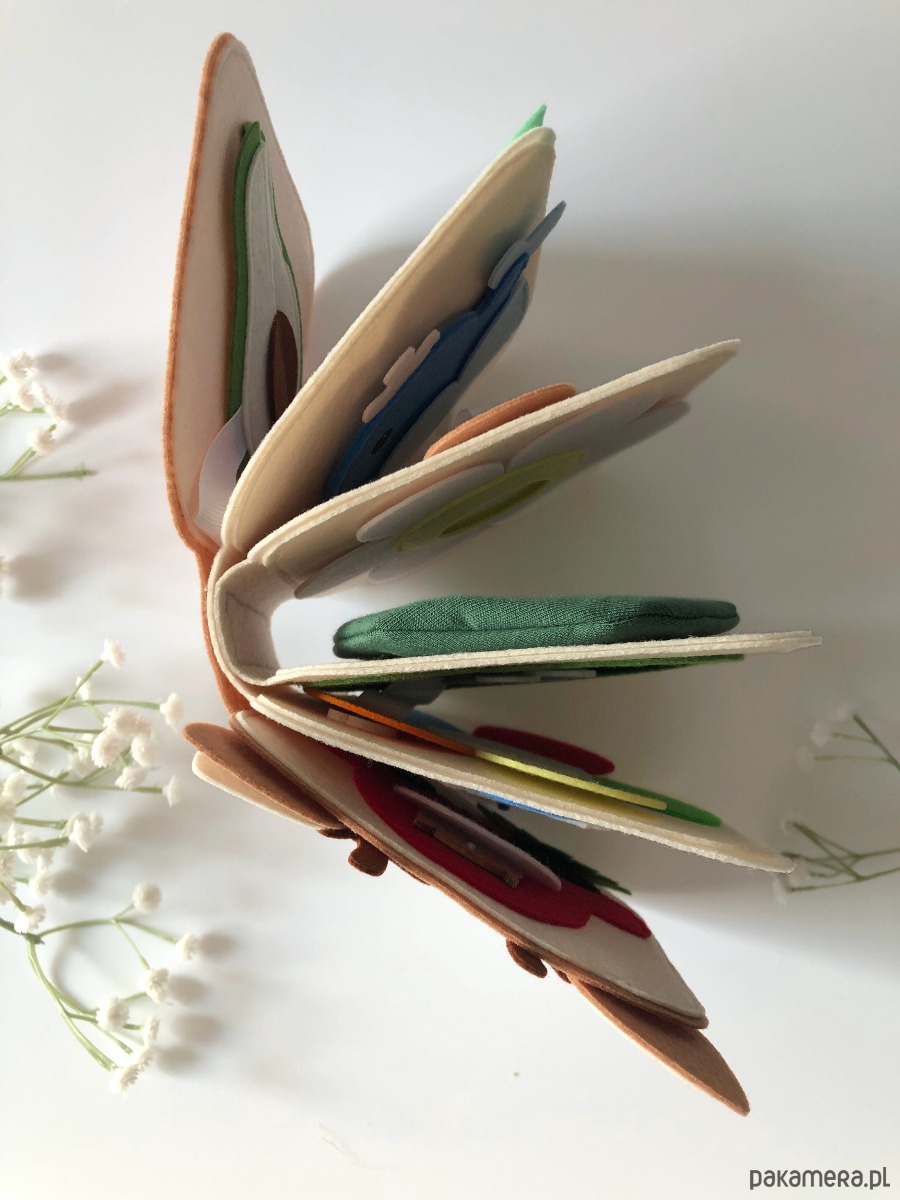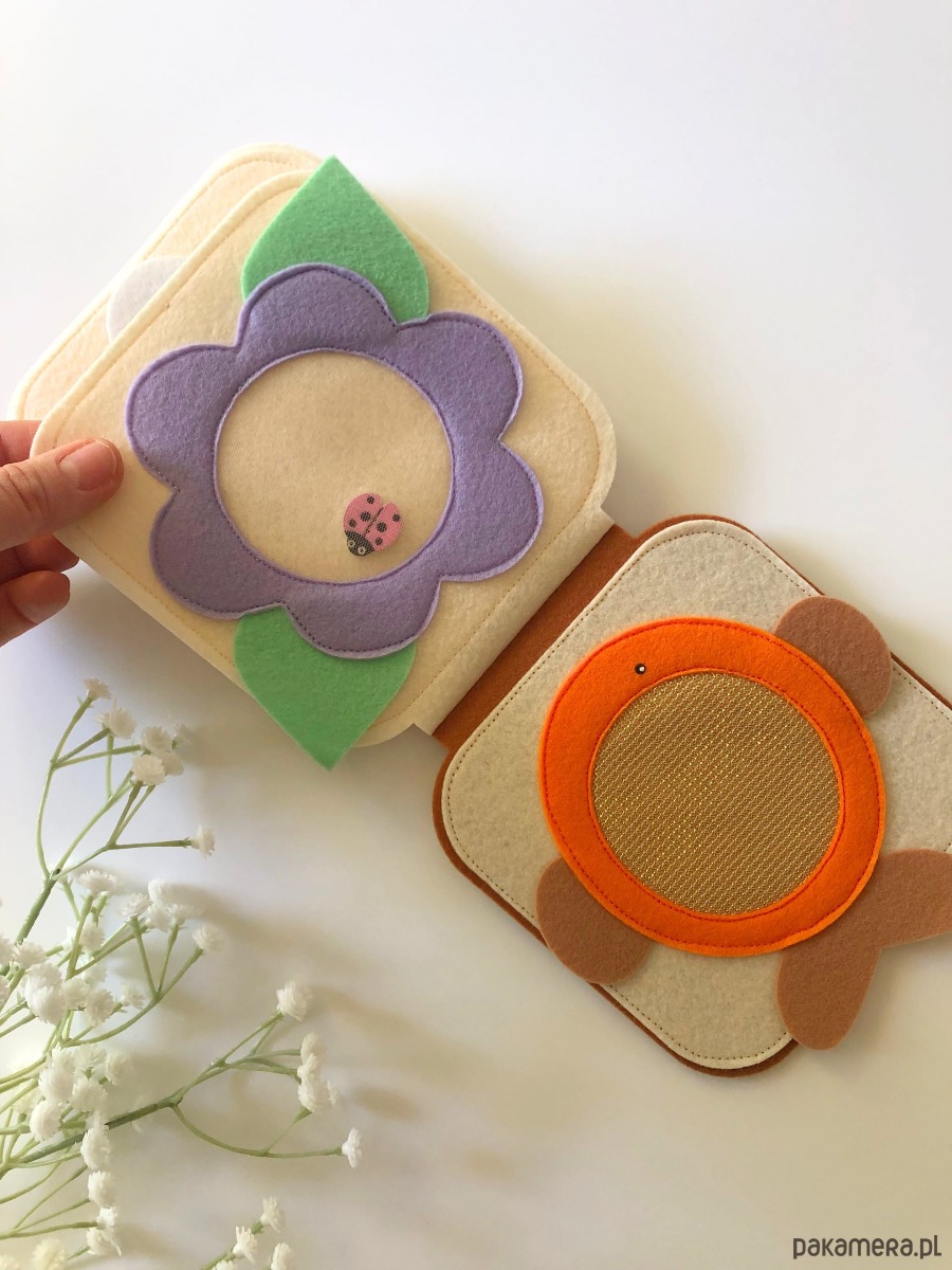 Urocza filcowa książeczka jest idealnym pomysłem na prezent! Wspiera rozwój dziecka, zawiera różne faktury tkanin, elementy szeleszczące, przesuwane oraz piękne żywe kolory. Książeczka manipulacyjna jest miękka i lekka zatem idealna w każdej podróży. Filcowa książeczka została uszyta z bezpiecznych materiałów najwyższej jakości. Zaletą tej książeczki jest to, że może być prana w pralce w temperaturze do 30°C na delikatnym cyklu, co zapewni