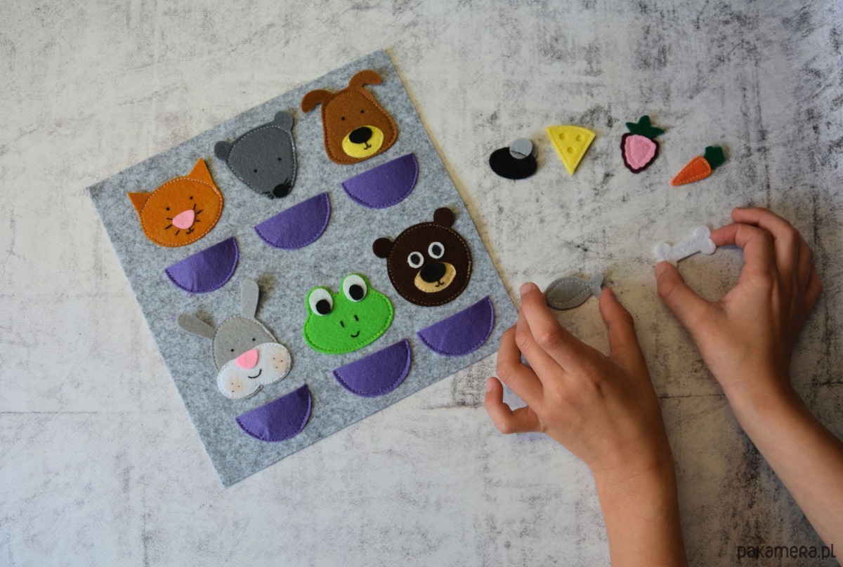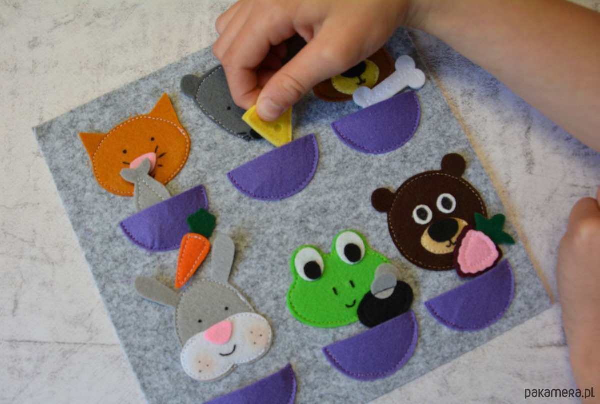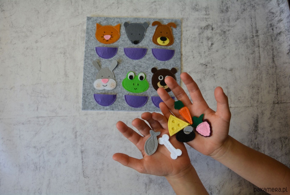 Dopasuj jedzenie do właściwego zwierzątka: kotka, myszki, pieska, królika, żabki oraz niedźwiadka