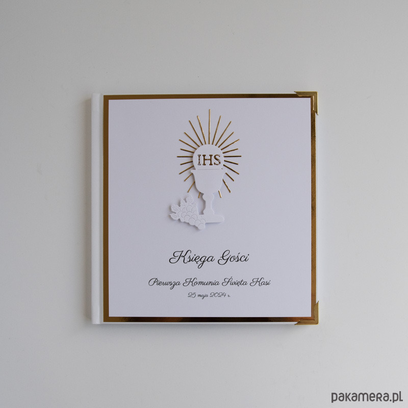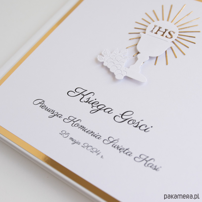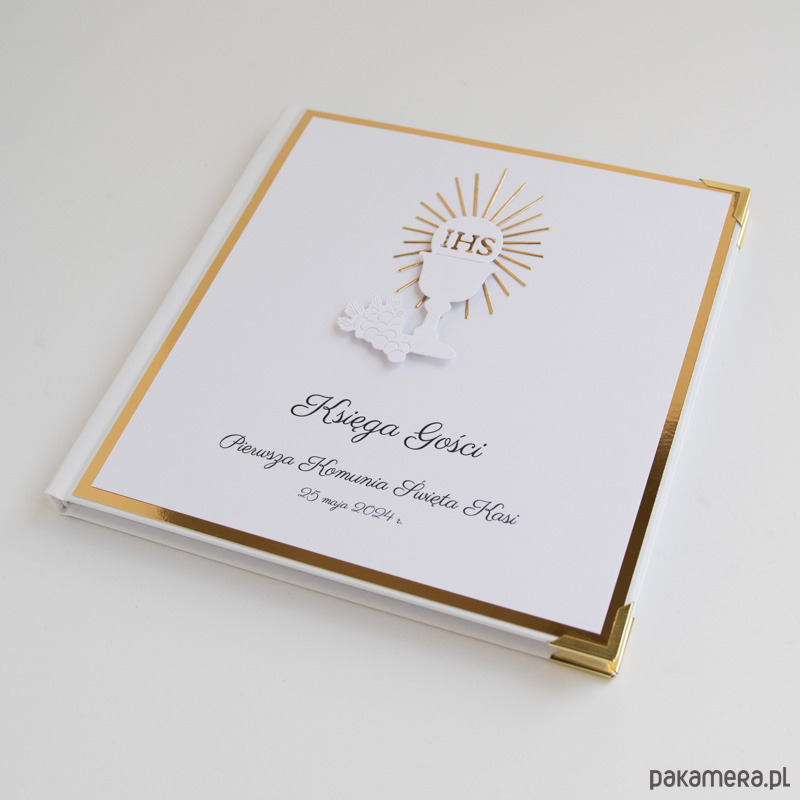 Biało złota księga gości na uroczystość Pierwszej Komunii Świętej.