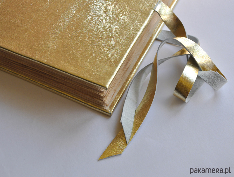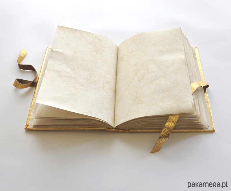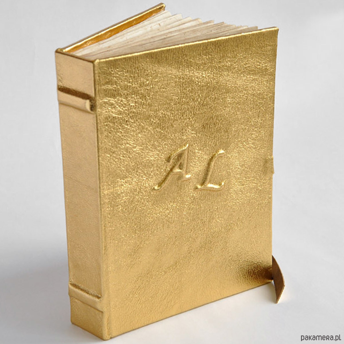 Ślubna złota księga gości wykonana pod podstaw ręcznie w mojej pracowni Papirell. Okładka obita jest złotą tkaniną, do zamknięcia służą rzemienie ze złotej skóry naturalnej (rzemienie na odwrocie są szare). Jeśli księga ma być wykonana bez rzemieni proszę o taką informację. Na okładce umieszczam wypukłe inicjały Pary Młodej.