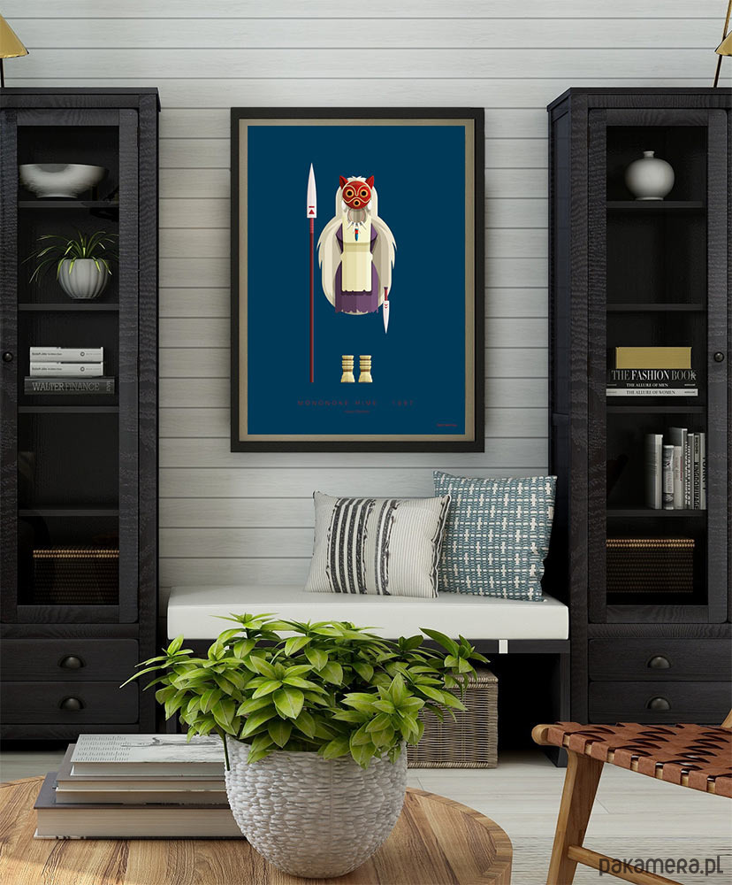 Plakat inspirowany filmem animowanym Księżniczka Mononoke (Mononoke-hime), reż. Hayao Miyazaki. Grafika w szczegółowy sposób odtwarza kostium głównej postaci - San. Piękna opowieść z ekologicznym przesłaniem idealnie sprawdzi się na ścianie każdego zakochanego w filmach Studia Ghibli.