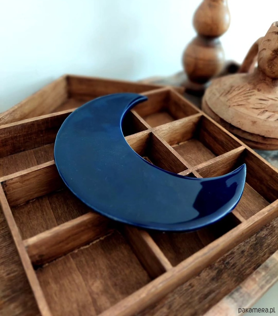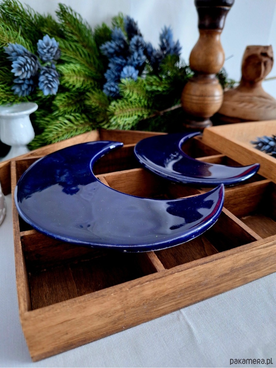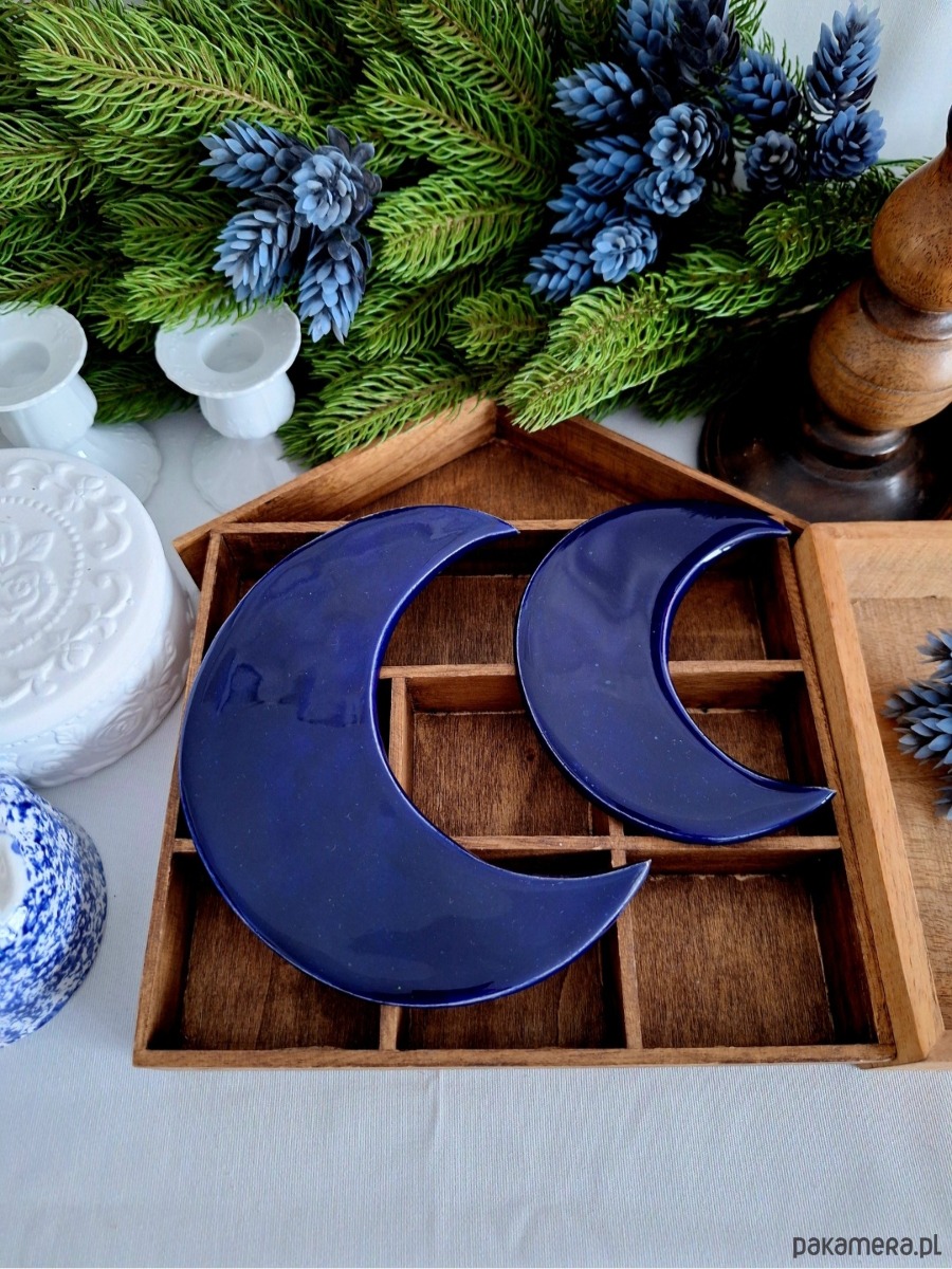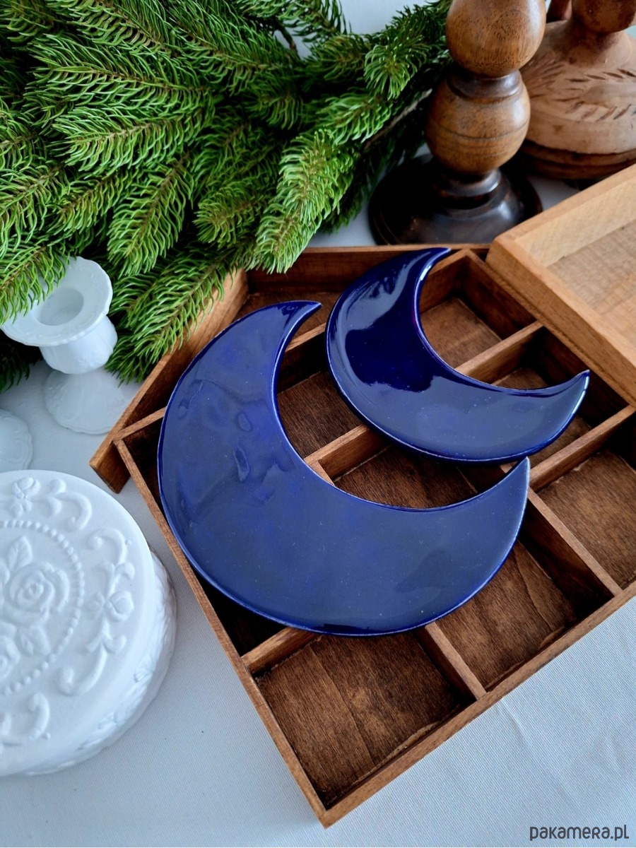 Ceramiczne księżyce w kobaltowym błyszczącym kolorze. Dekor ręcznie wykonany i szkliwiony. Wyjątkowa ozdoba o nietuzinkowym charakterze, dla miłośników nieba i gwiazd, pięknie prezentuje się w pokoju dziecięcym. Doskonale sprawdzi się jako prezent dla astrologa.