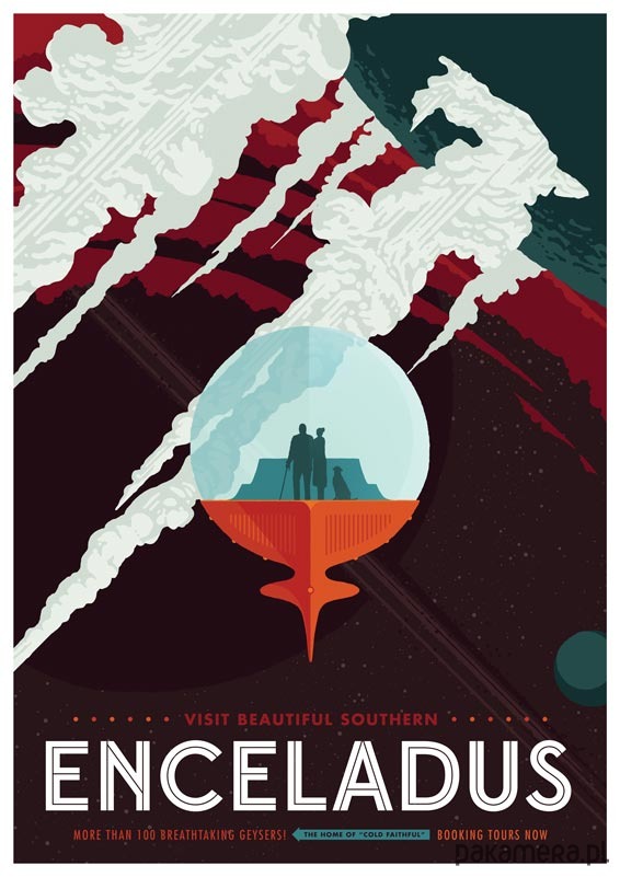 Plakat w stylu vintage przedstawiający księżyc Enceladus, reklamowany sloganem "Odwiedź piękny południowy Enceladus. Ponad 100 zapierających dech gejzerów".