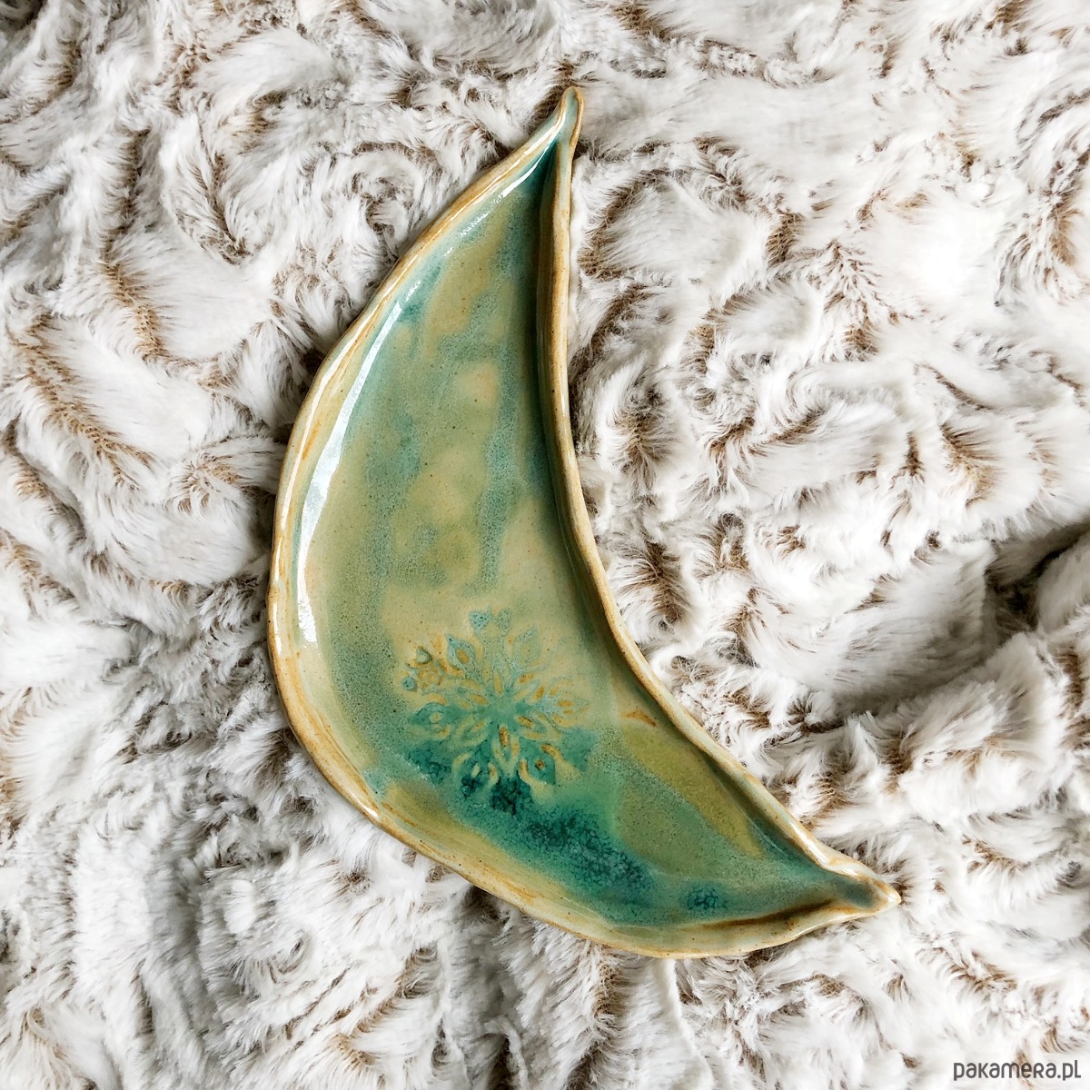 Oryginalna podstawka ceramiczna w kształcie półksiężyca z motywem śnieżynki.