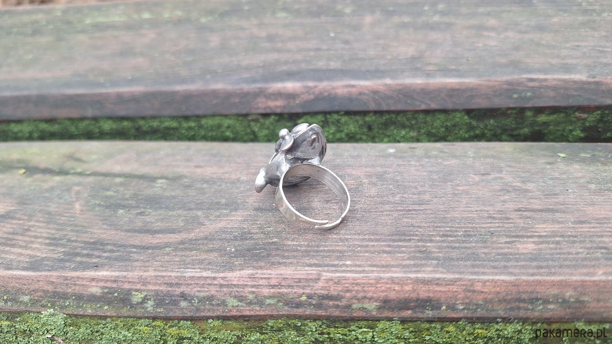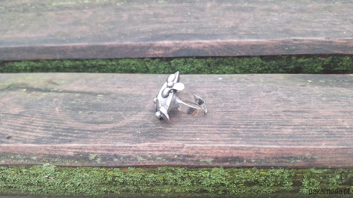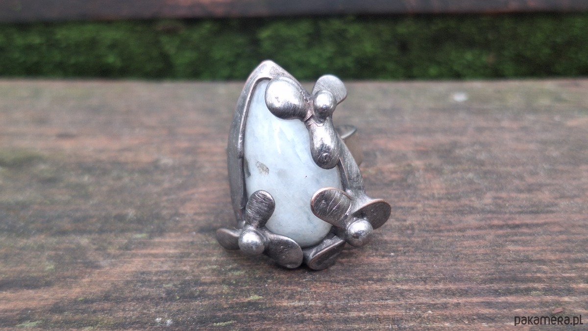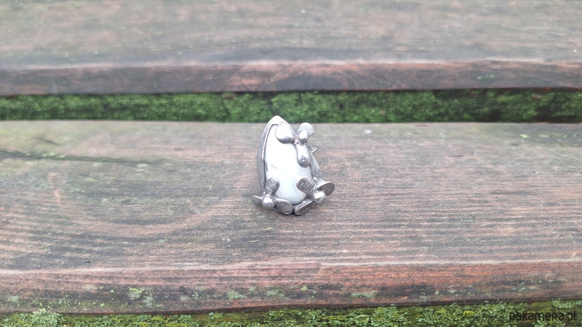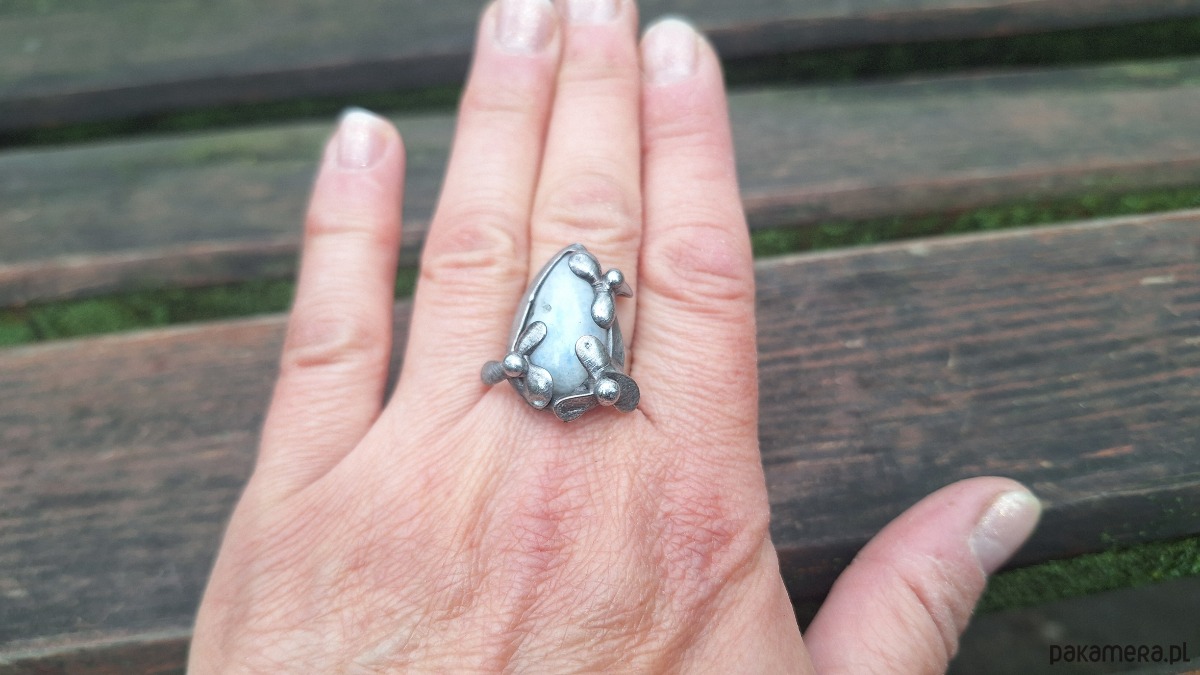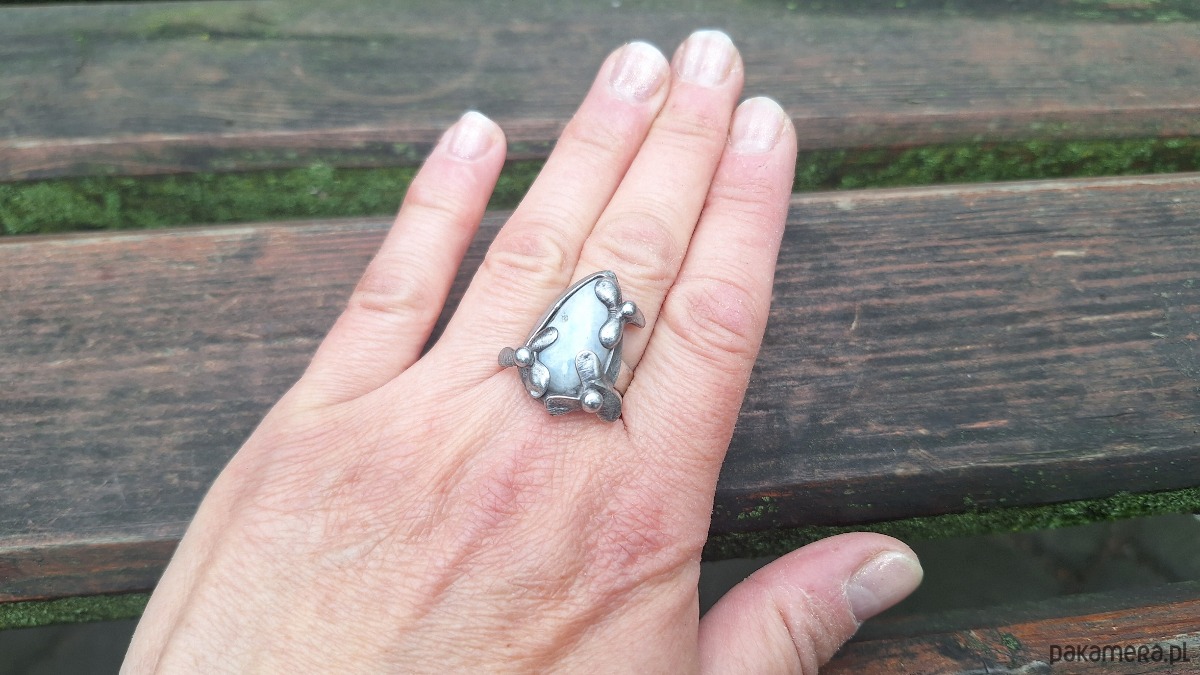 Pierścionek wykonany z miedzi, cyny i naturalnego kamienia księżycowego. Wymiary ok. 2.5 na 1.5cm. Regulowany. Nie jest ciężki.