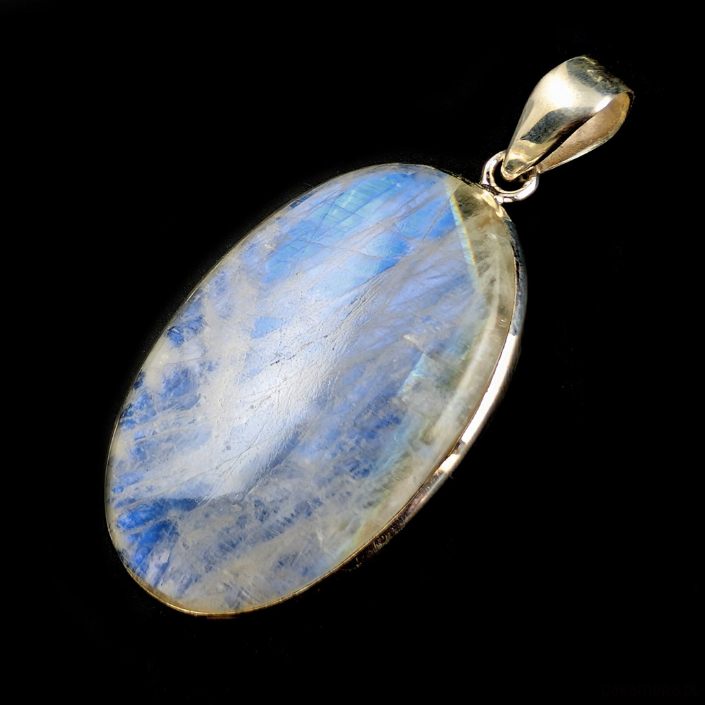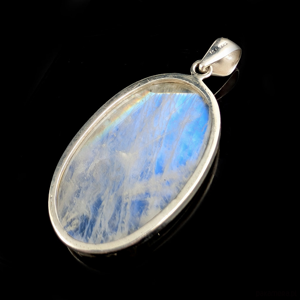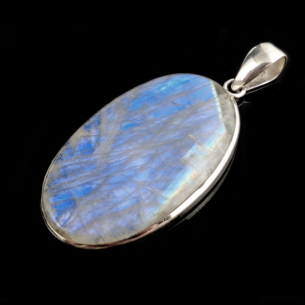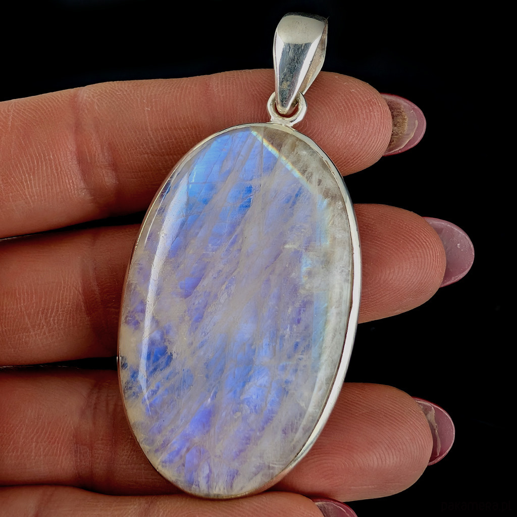 Wielki okaz pięknego kamienia księżycowego w ascetycznej oprawie srebra próby 925. Wisiorek otwarty z tyłu, ukazuje całe piękno kamienia .Długość całkowita 64 mm, wymiary oprawy kamienia 50 x 30 mm. Waga 21 gramów. Wykonany przez dostawcę kamieni. Zapakowany w ozdobne pudełeczko.