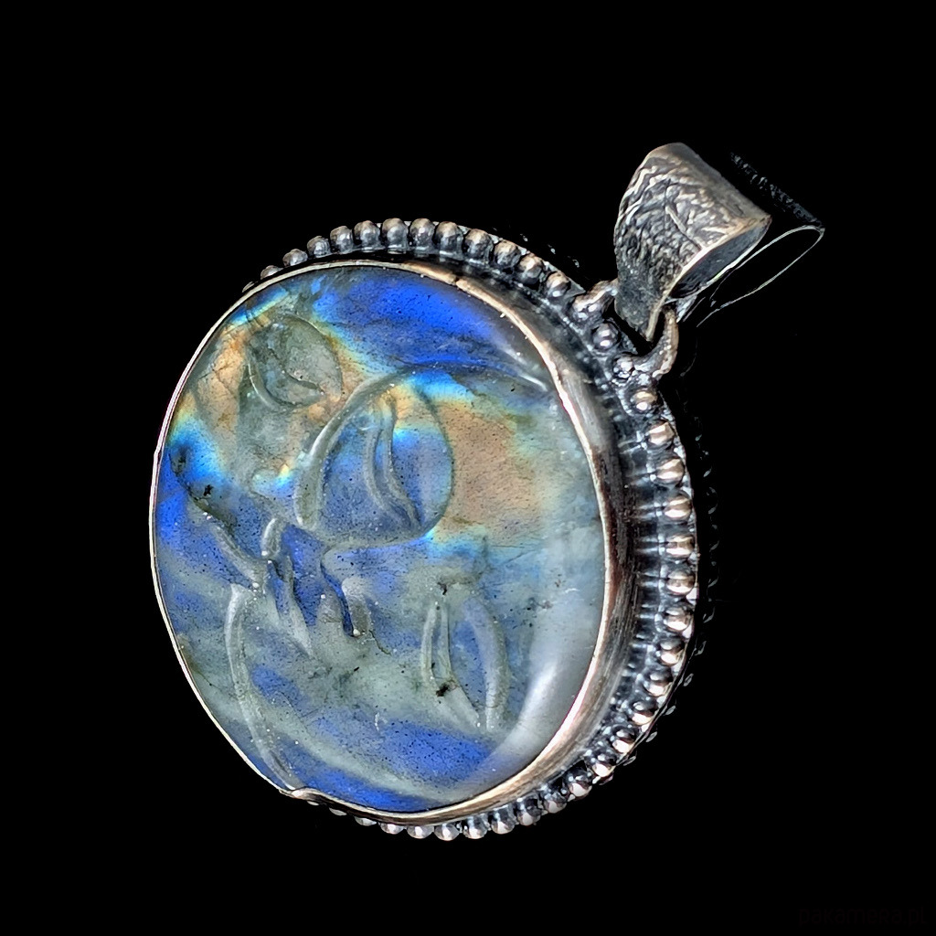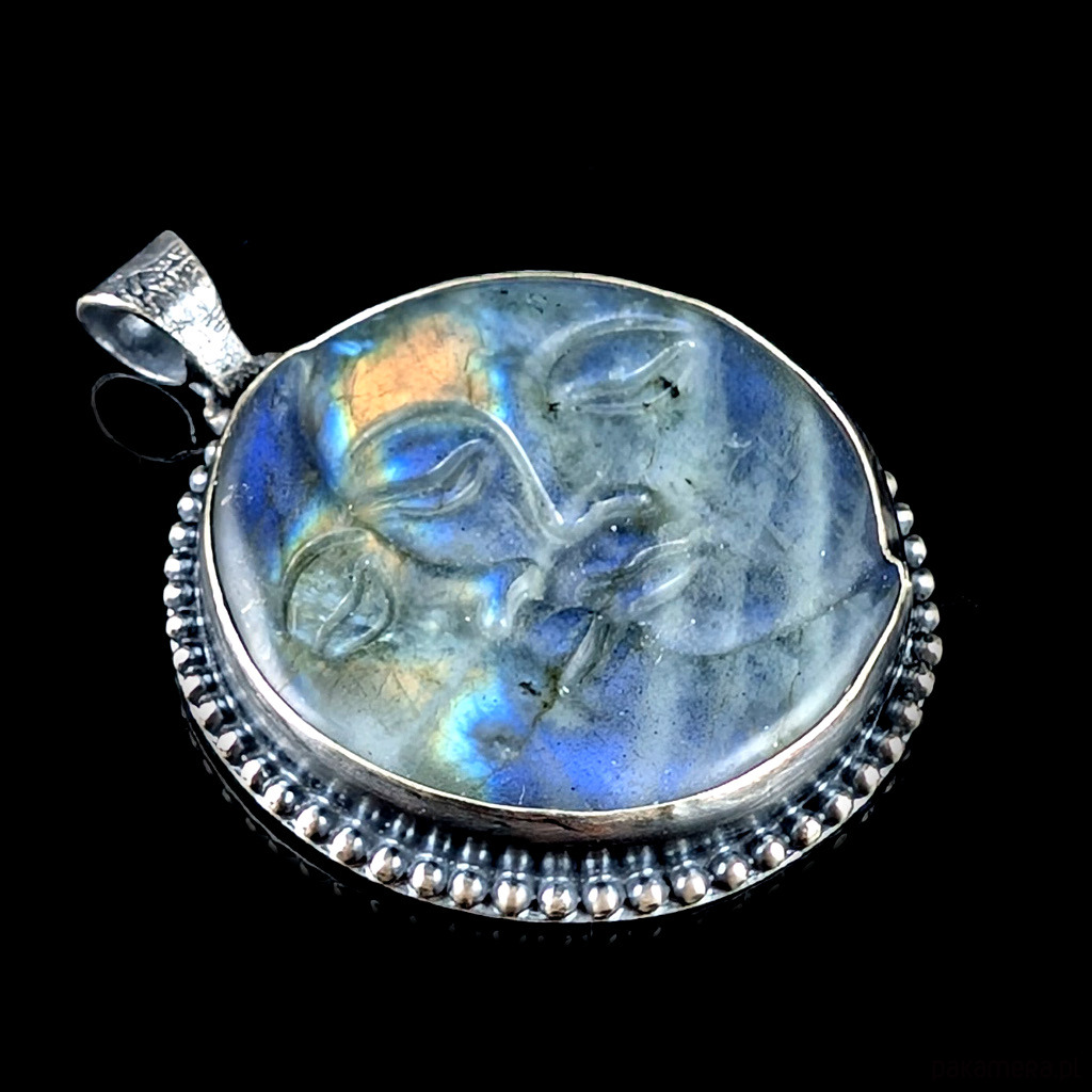 z oprawionym rzeźbionym w labradorycie przepięknym wizerunkiem twarzy i księżyca.