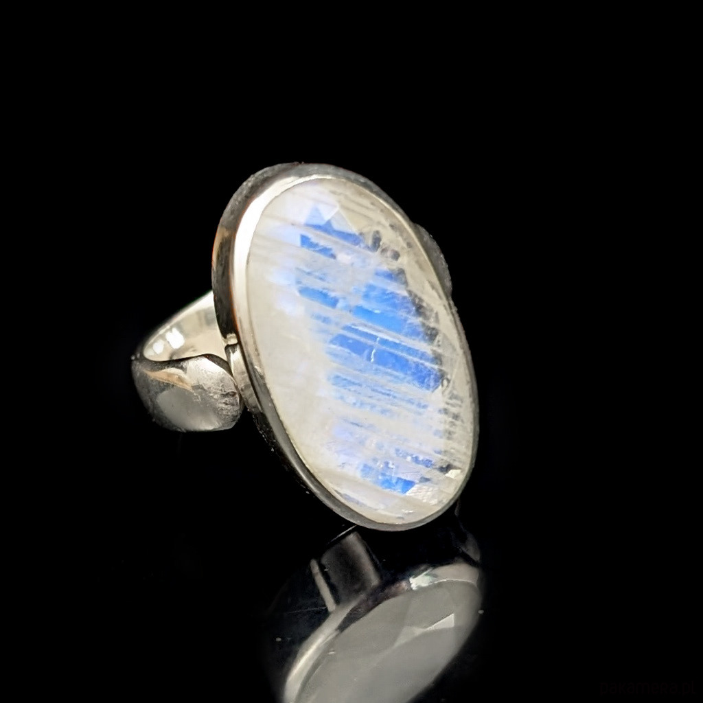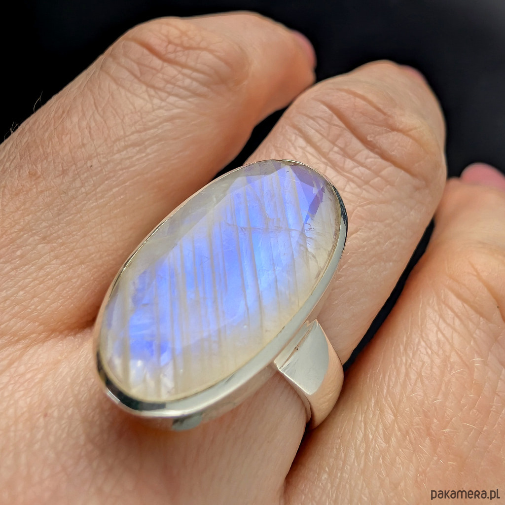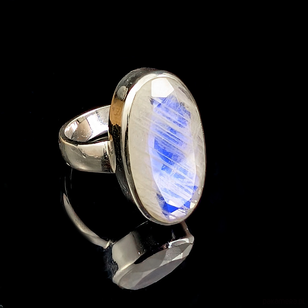 Pierścień z oprawionym w srebro próby 925 pięknym kamieniem księżycowym o błękitnej poświecie . Szerokość obrączki 5 mm. Kamień ma oprawę 22x 14 mm. Rozmiar jubilerski regulowany w wąskim zakresie 14-19, po zakupie dopasuję do odpowiedniego rozmiaru. Waga 8.4grama. Wykonany przez dostawcę kamieni, Pierścień zapakowany zostanie w ozdobne pudełeczko.